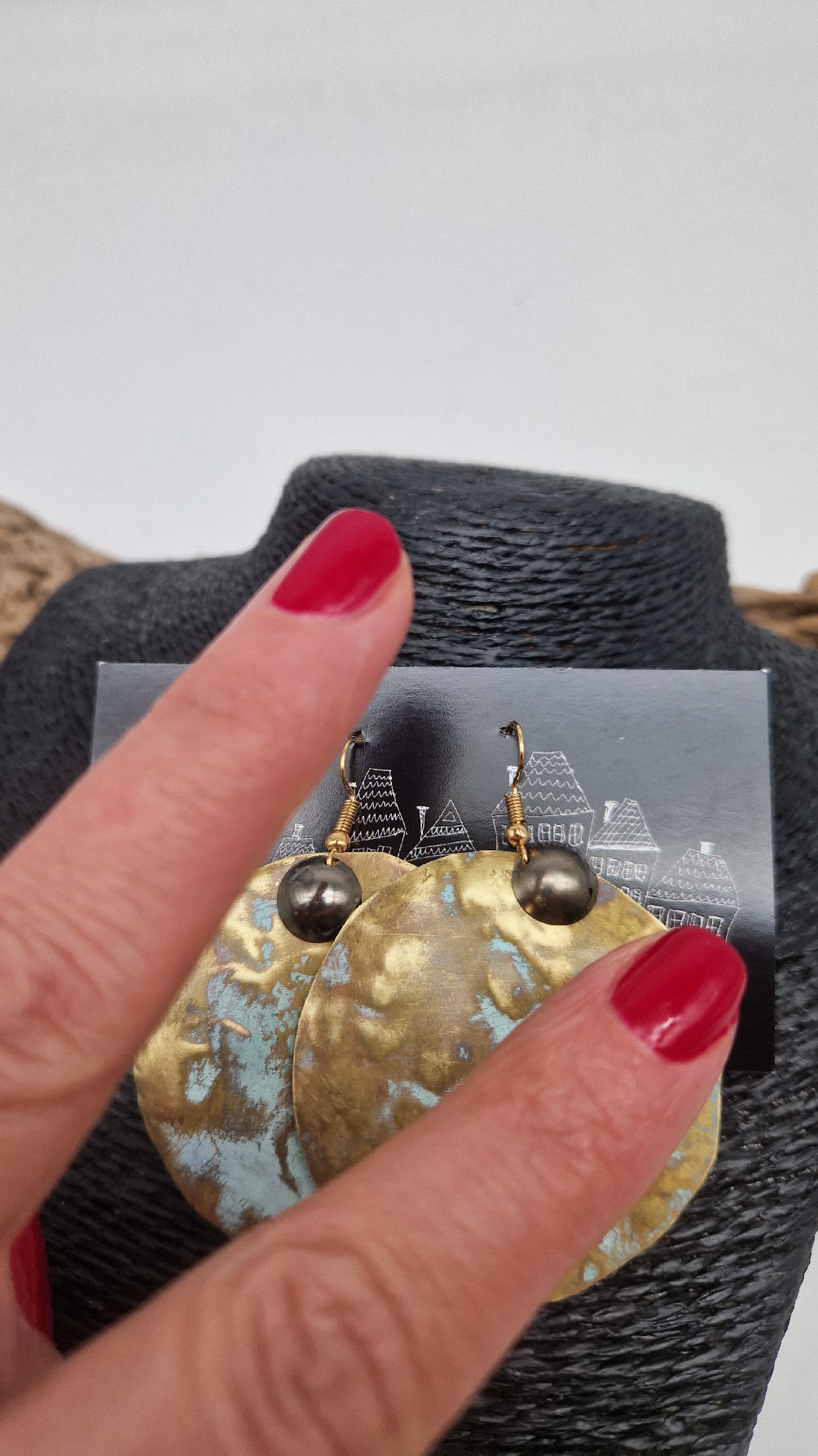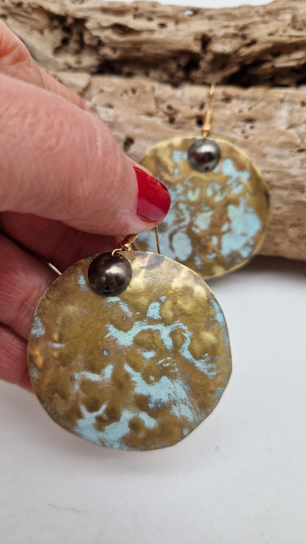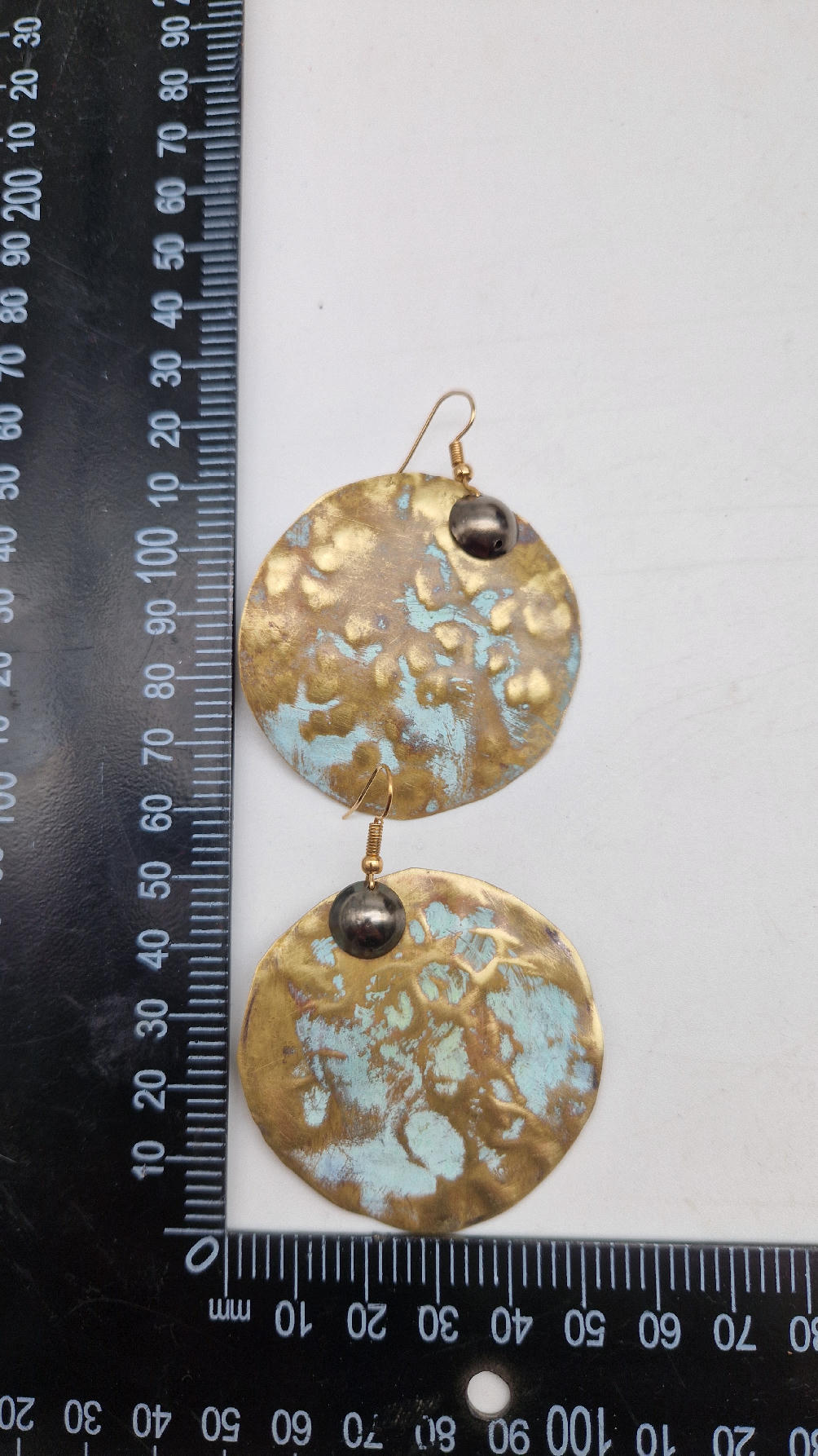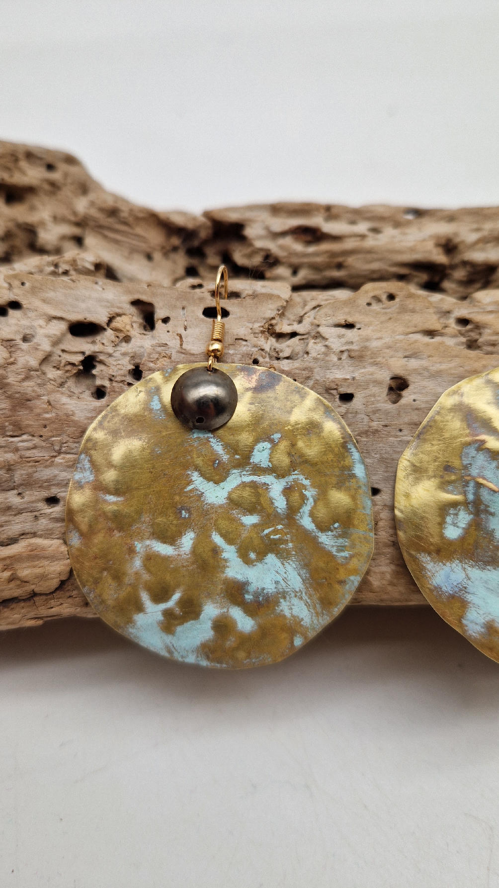 Duże i niebanalne mosiężne kolczyki z niewielkim grafitowym oczkiem, kute i patynowane na zielono, wycinane ręcznie …. piękne jak księżyc w pełni …cudne, niebłyszczące, eleganckie i zawadiackie, świetne jako ,,komplet” do wisiorów .