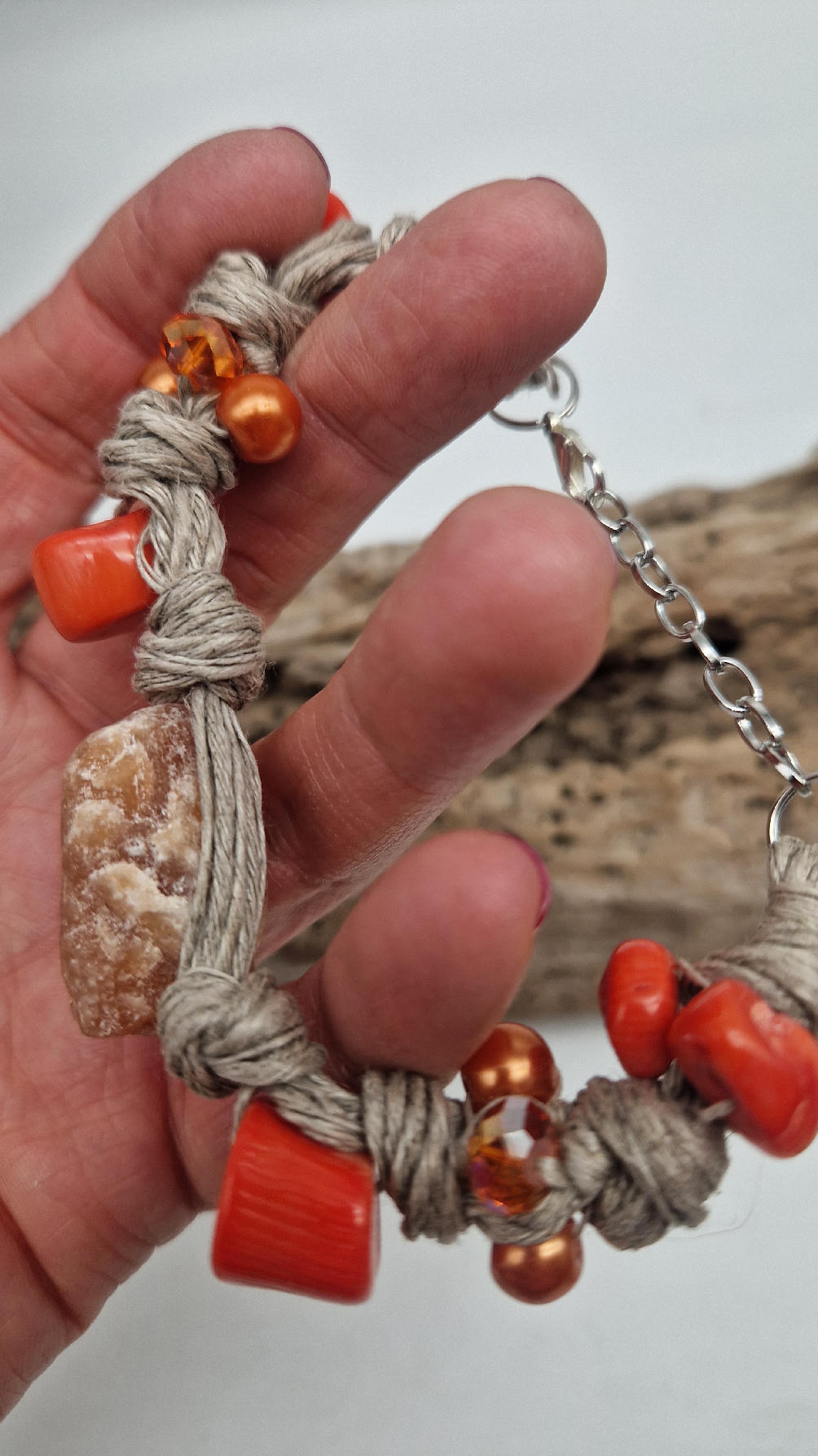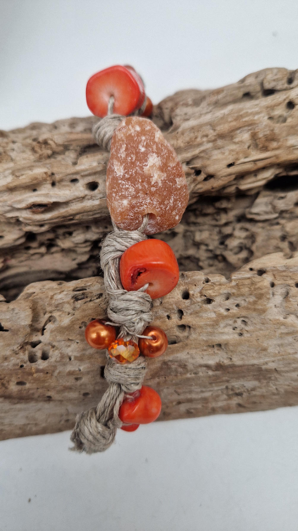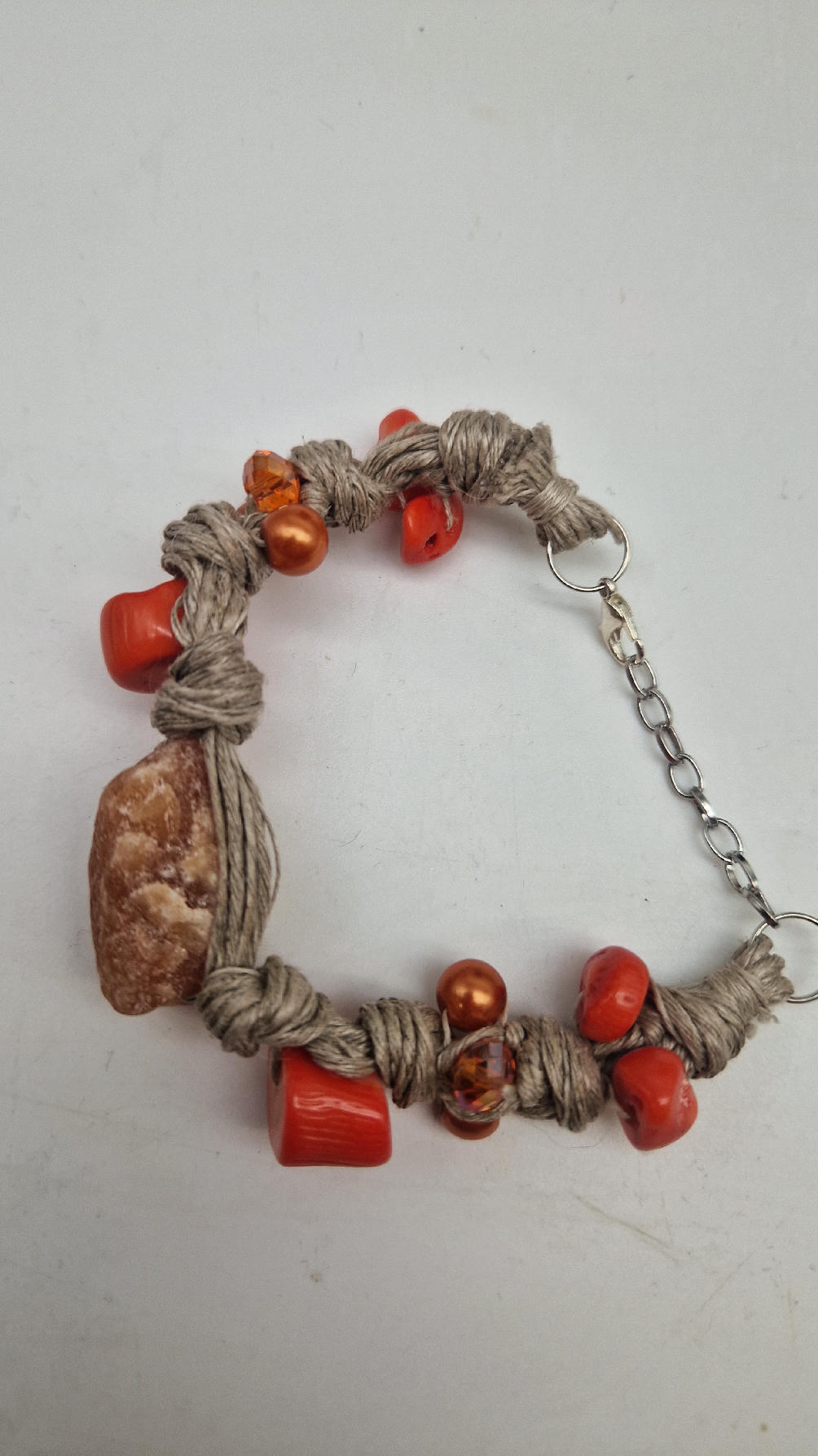 Bransoleta z pomarańczowym kwarcem , koralem i szklanymi koralikami do kompletu zaplecionymi w lniany sznurek w naturalnym kolorze