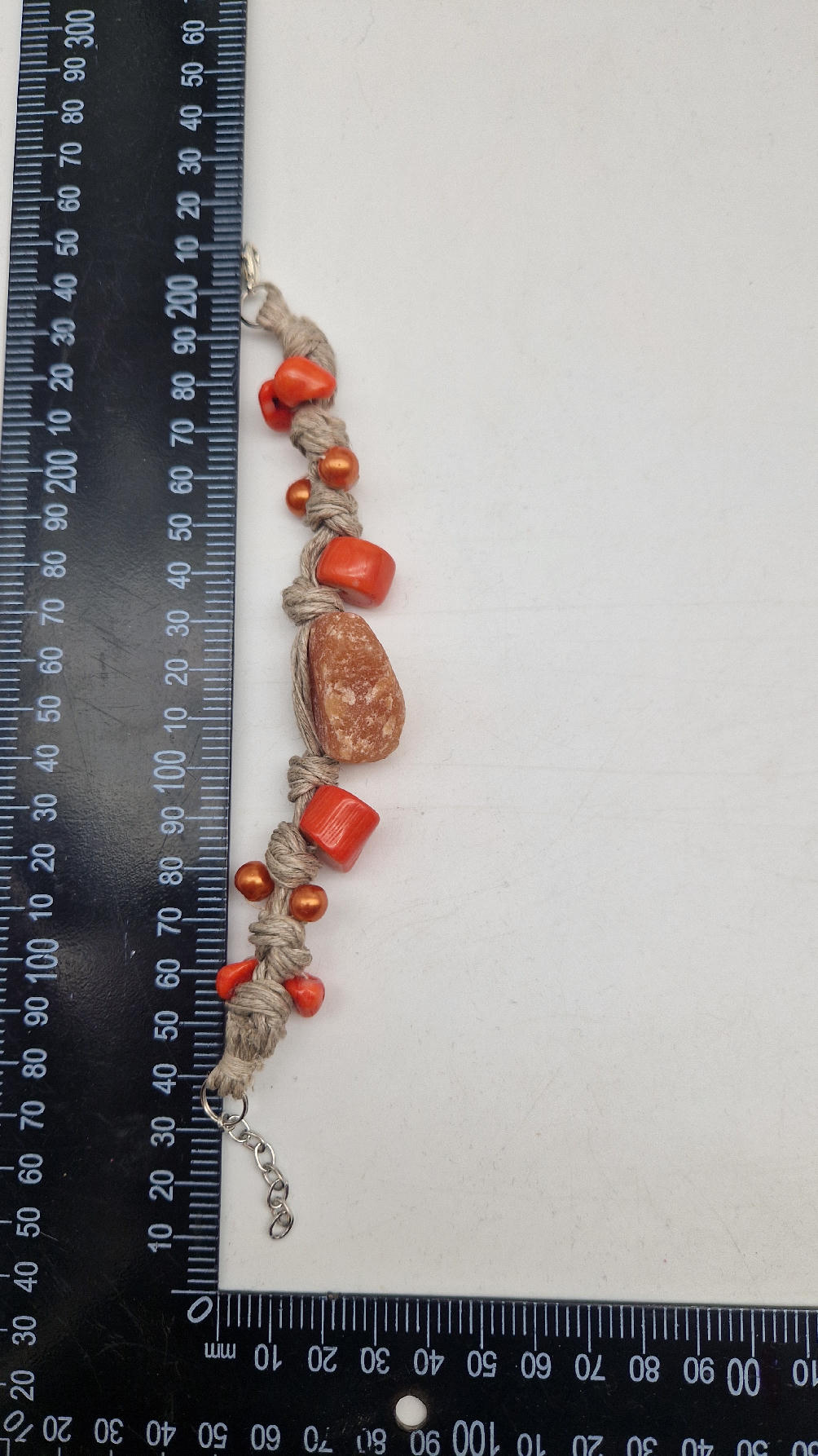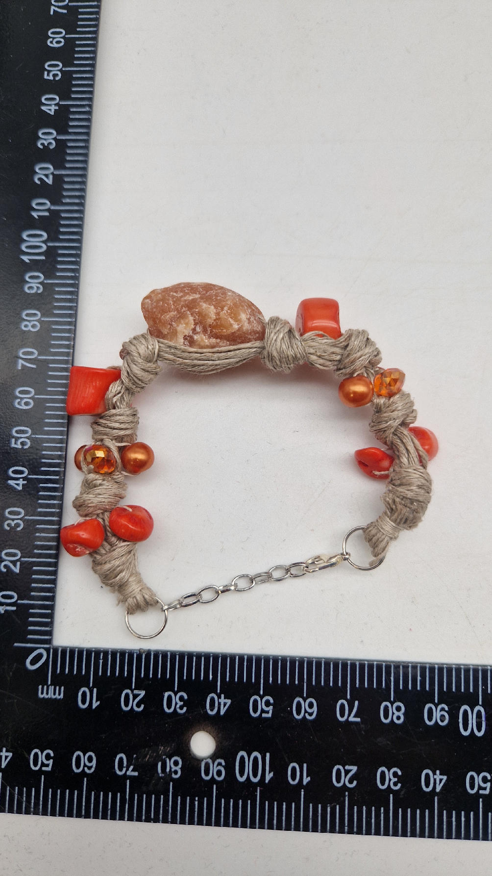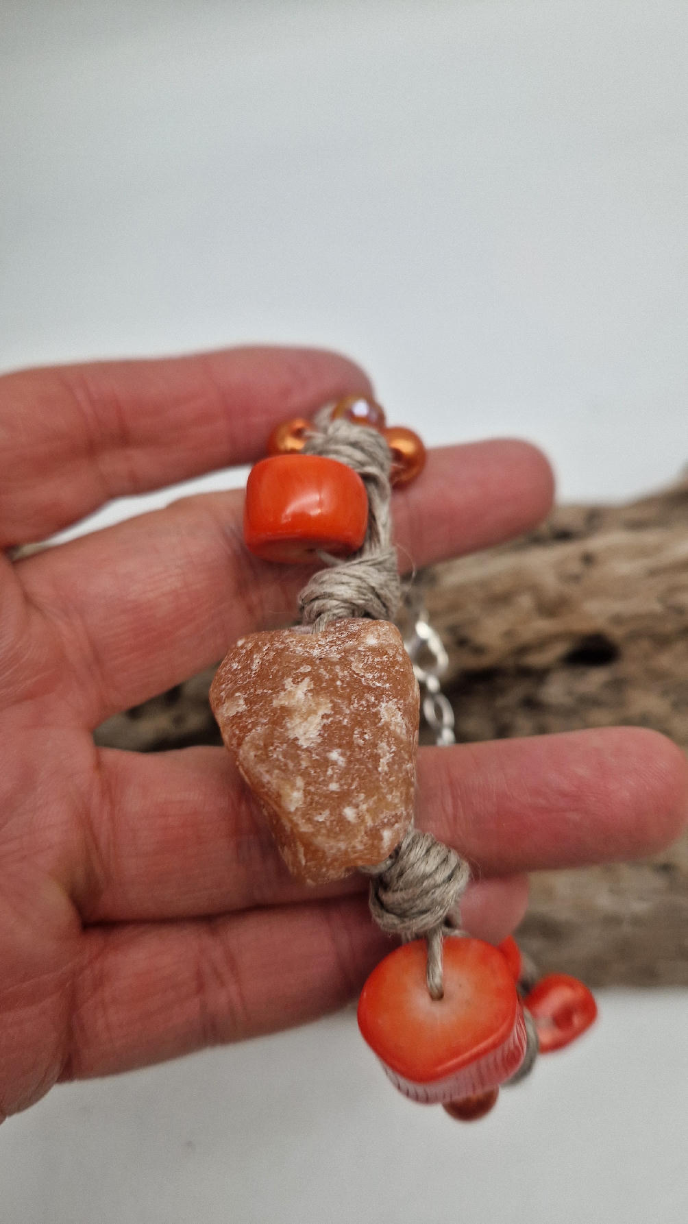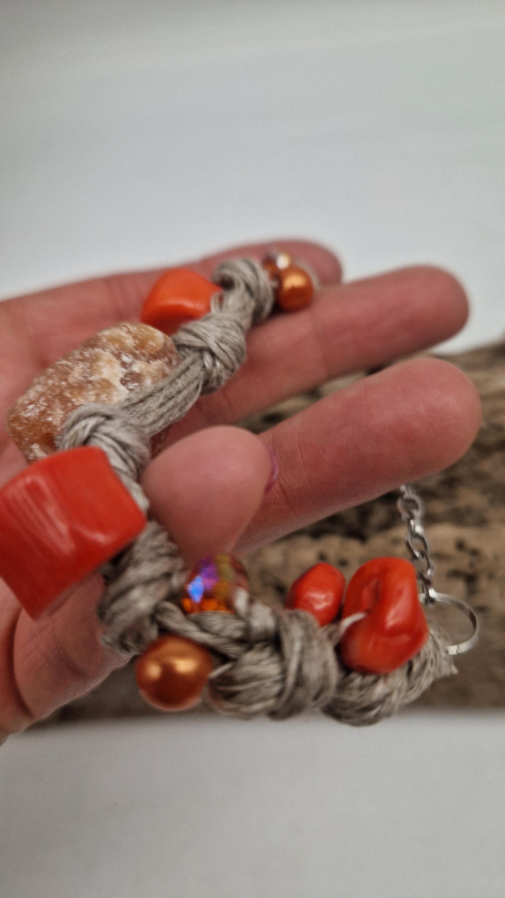 Bransoleta z pomarańczowym kwarcem , koralem i szklanymi koralikami do kompletu zaplecionymi w lniany sznurek w naturalnym kolorze