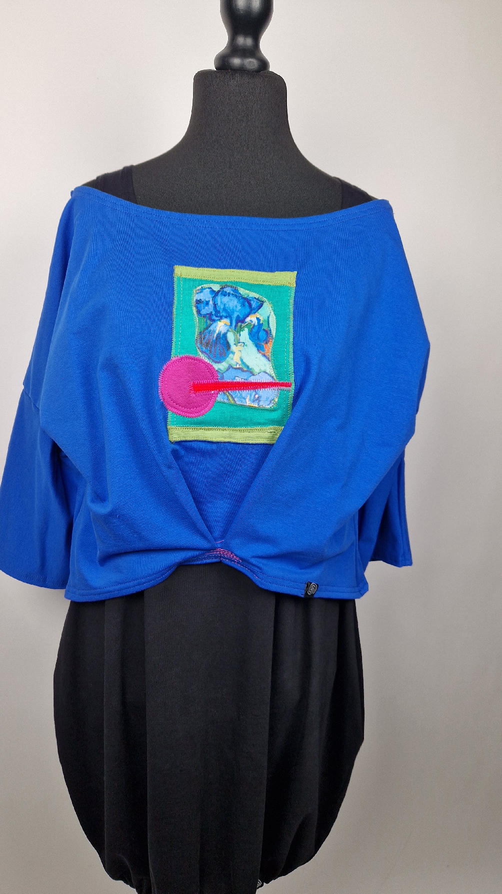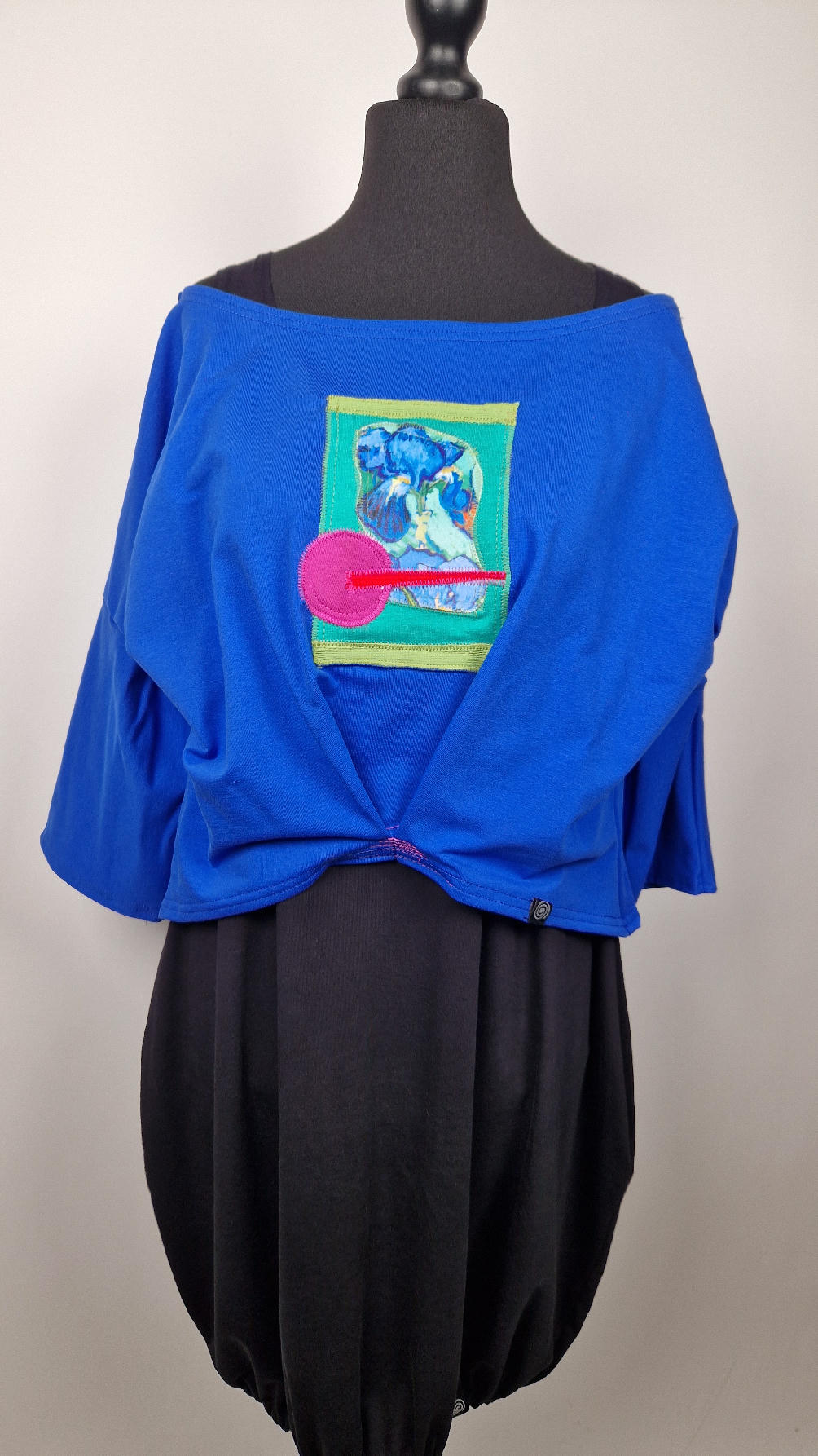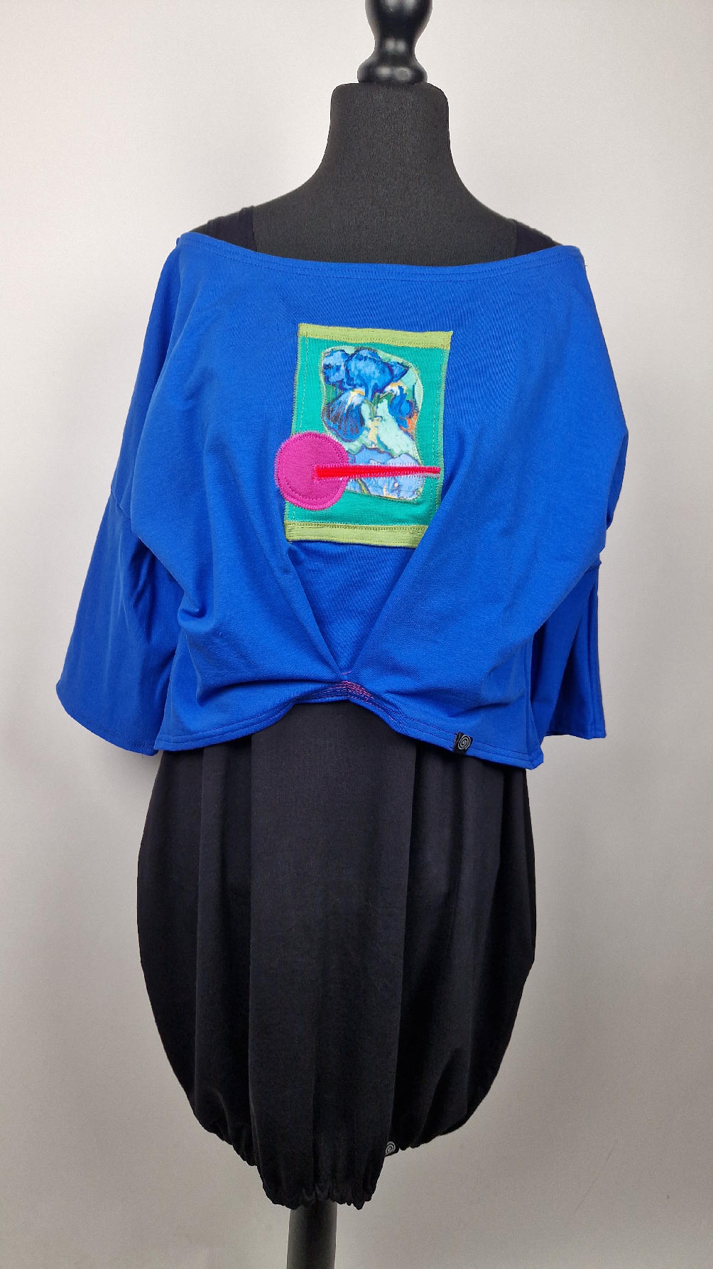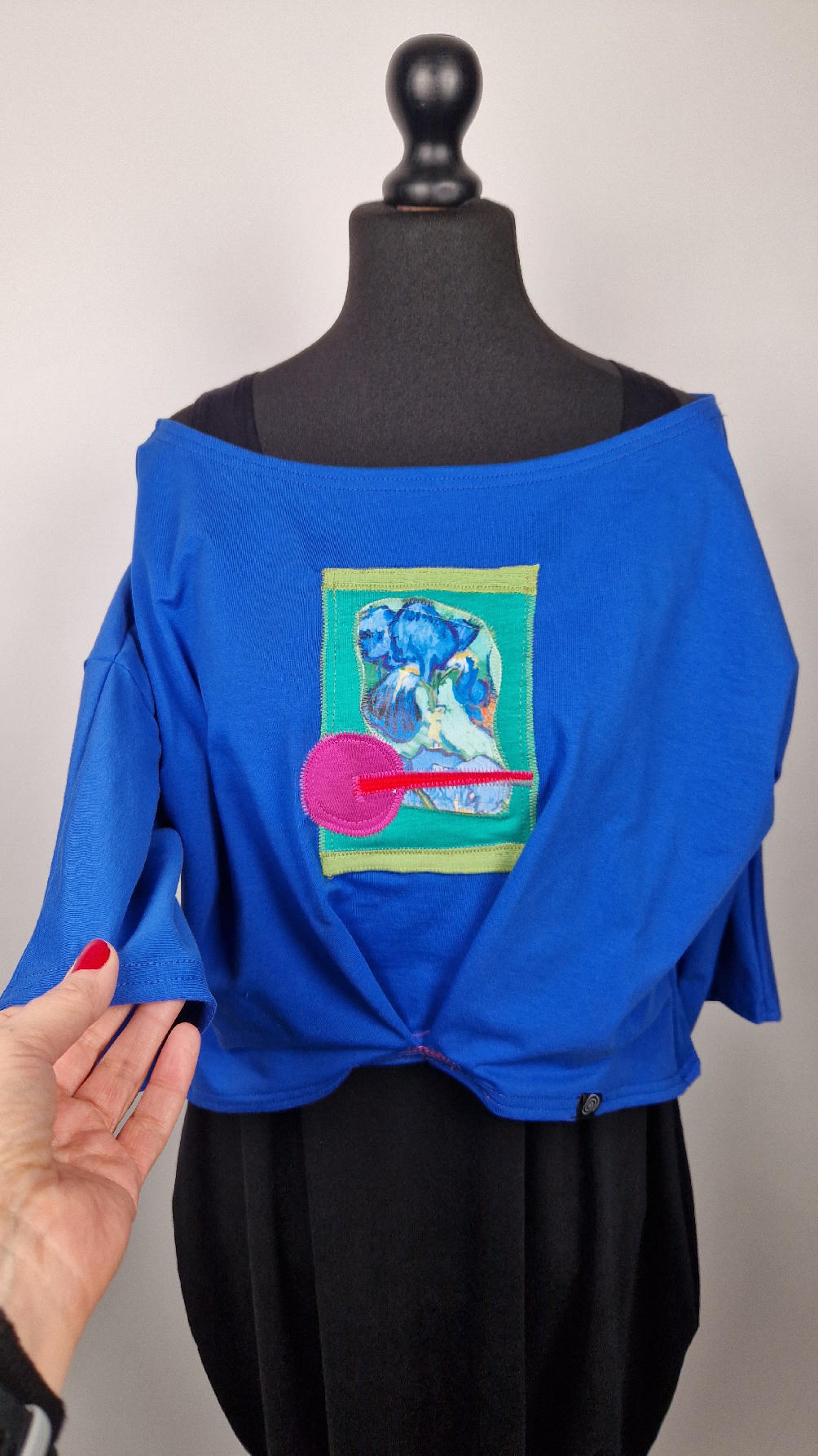 Krótka, kobaltowa bluzka z aplikacją z Irysami z obrazu van Gogha , z kontrastowymi dodatkami , ze szmaragdowa zielenią , dużą kropką , dla kontrasty i odrobiną pomarańczy …Luźna w biuście bluzka typu NIETOPERZ, ale taki niewielki….bluzka uszyta z wysokiej jakości bawełny z pętelką, z rękawem 3/4… , lekko zebrana na dole, żeby układała się bardziej… prosta, bez kieszeni – tak specjalnie, żeby nic nie odstawało ale z dużym dekoltem typu ,,łódka”, który możesz opuścić na jedno ramię, lub nosić symetrycznie…możesz założyć do niej ZARĘKAWKI