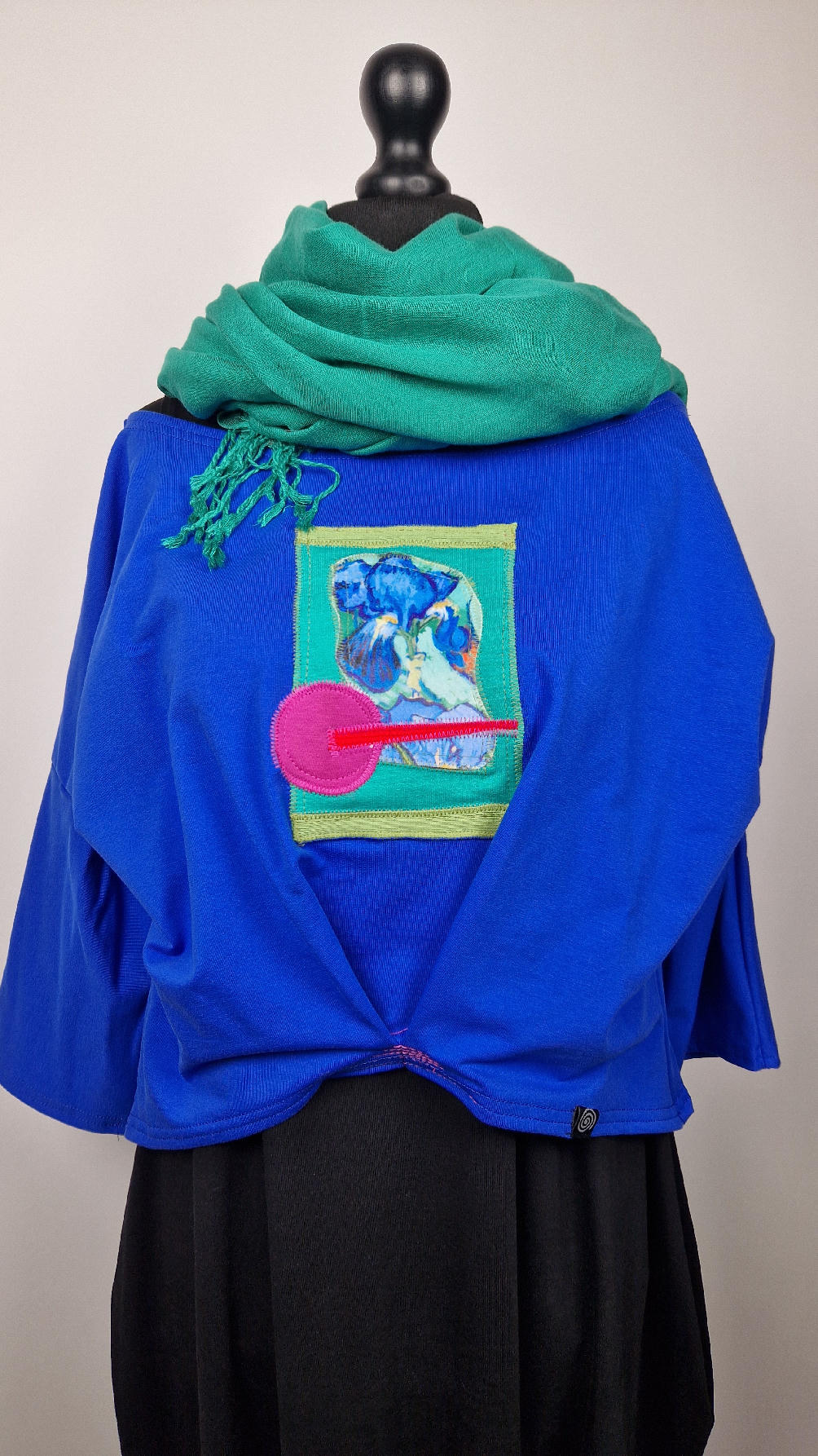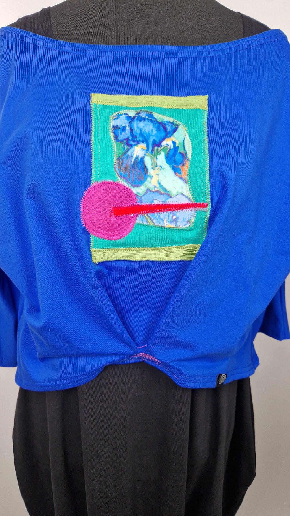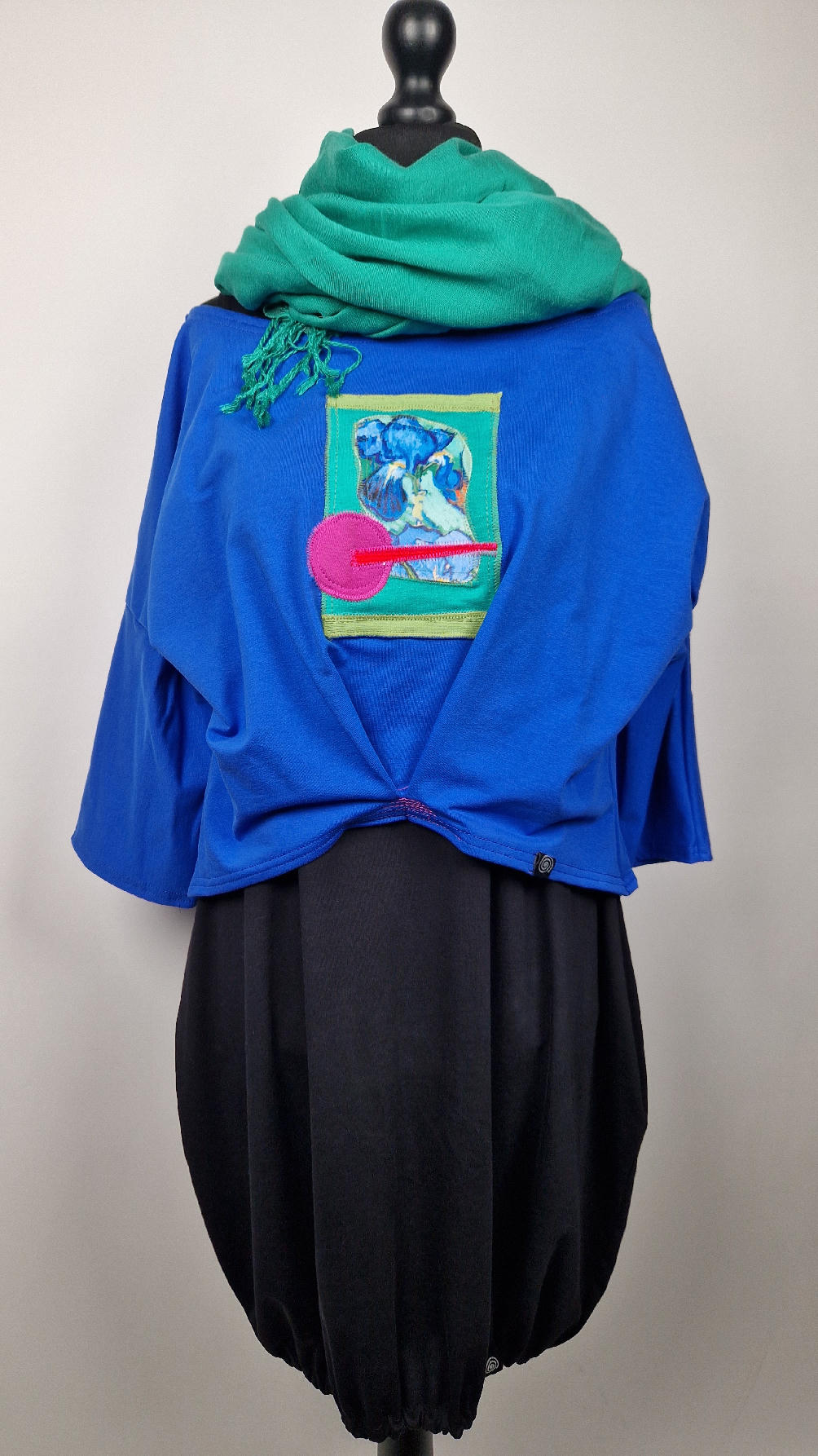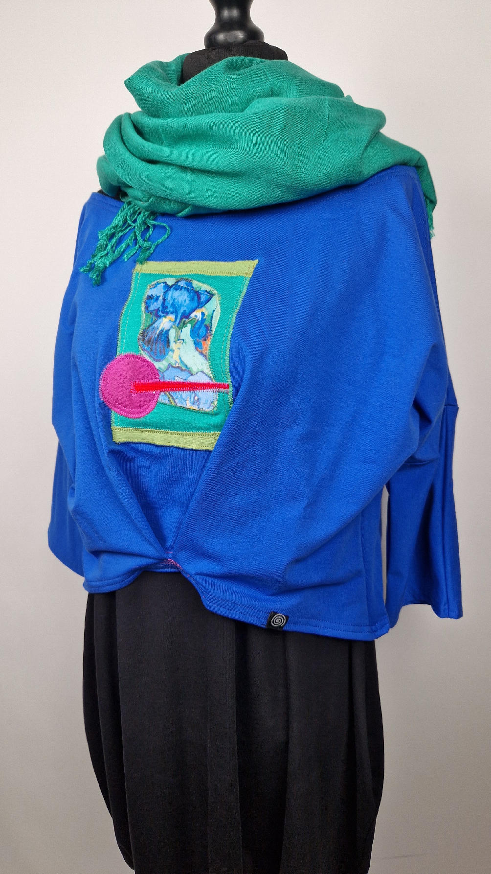 Krótka, kobaltowa bluzka z aplikacją z Irysami z obrazu van Gogha , z kontrastowymi dodatkami , ze szmaragdowa zielenią , dużą kropką , dla kontrasty i odrobiną pomarańczy …Luźna w biuście bluzka typu NIETOPERZ, ale taki niewielki….bluzka uszyta z wysokiej jakości bawełny z pętelką, z rękawem 3/4… , lekko zebrana na dole, żeby układała się bardziej… prosta, bez kieszeni – tak specjalnie, żeby nic nie odstawało ale z dużym dekoltem typu ,,łódka”, który możesz opuścić na jedno ramię, lub nosić symetrycznie…możesz założyć do niej ZARĘKAWKI