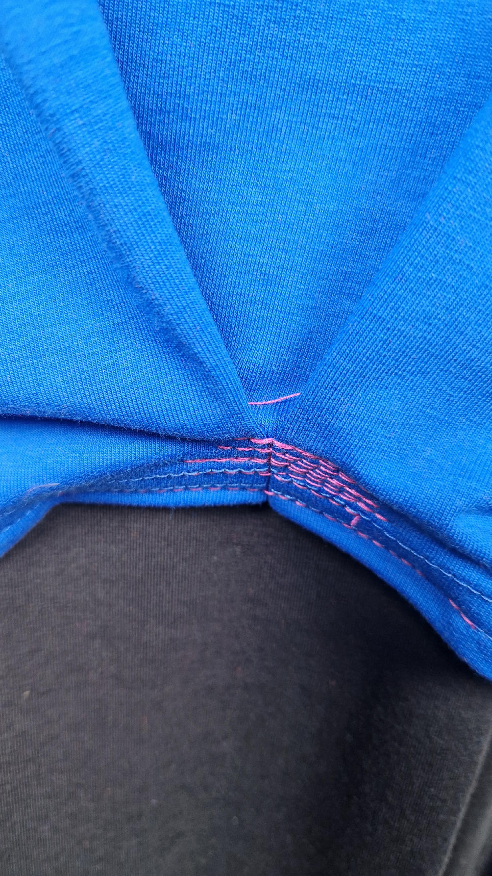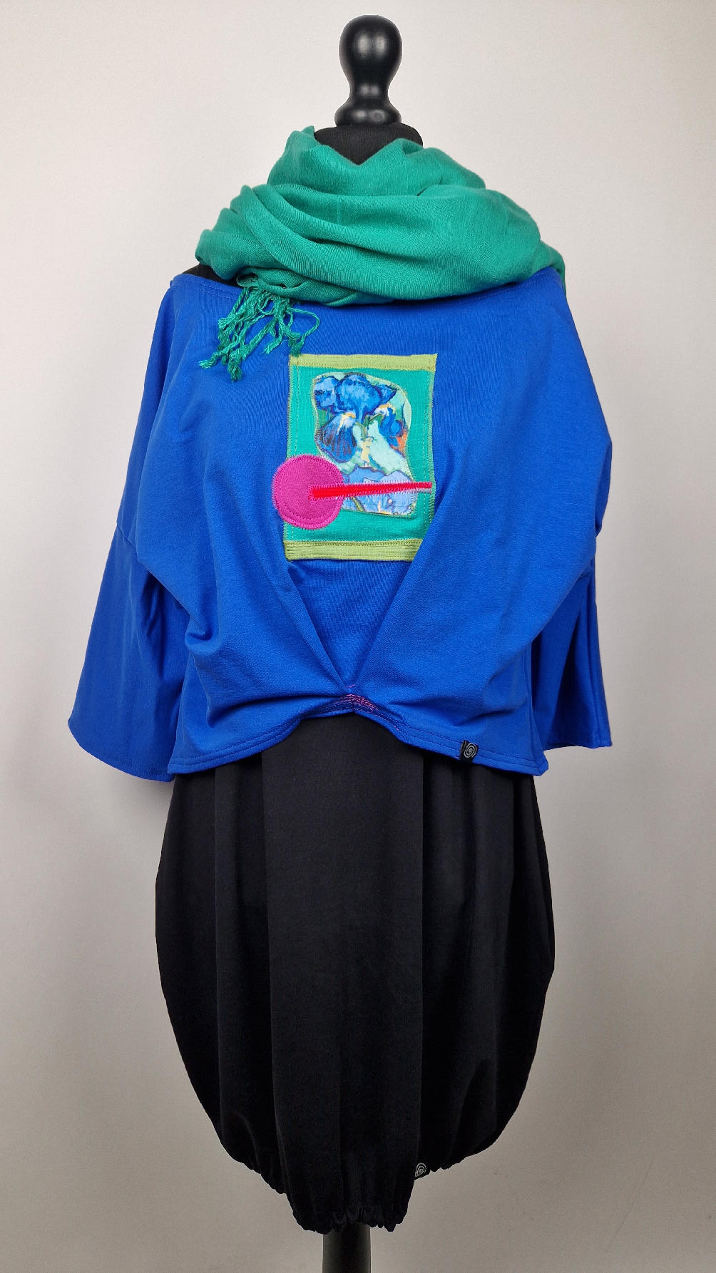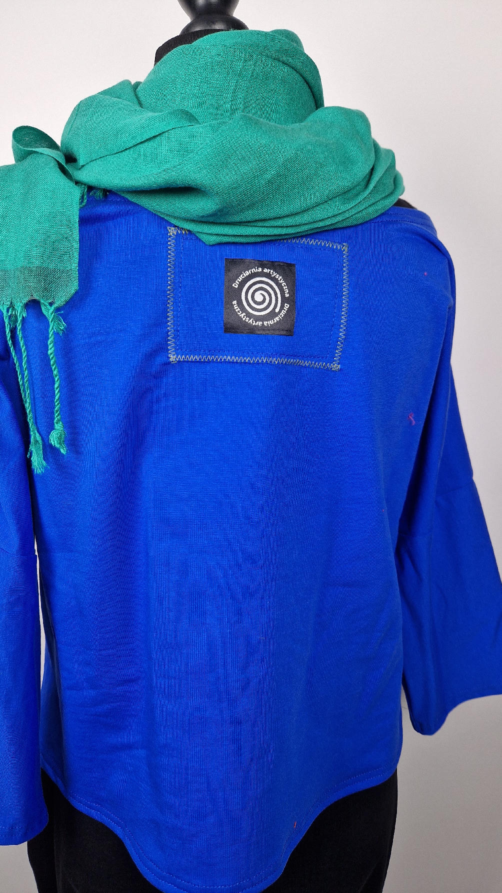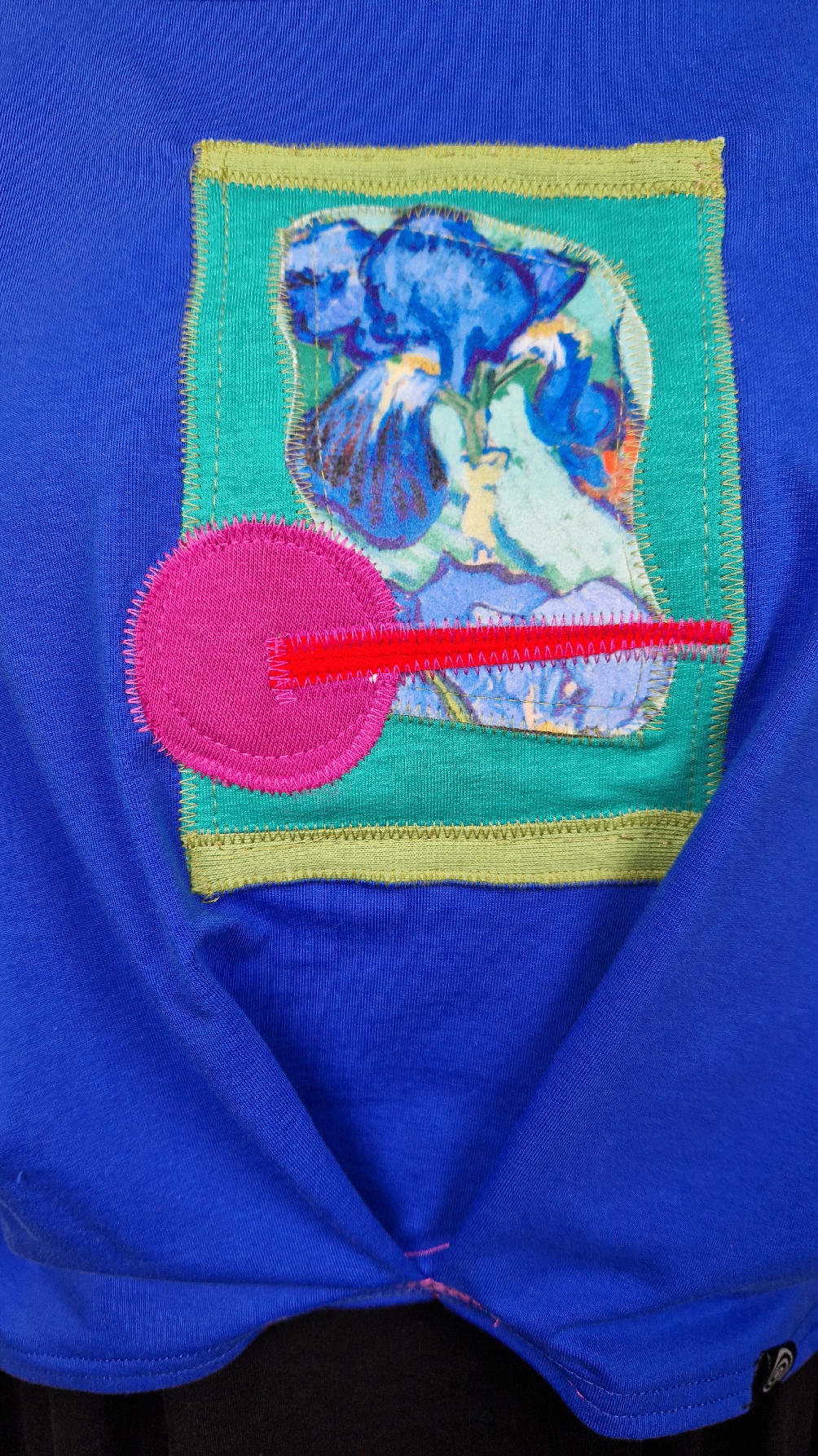 Krótka, kobaltowa bluzka z aplikacją z Irysami z obrazu van Gogha , z kontrastowymi dodatkami , ze szmaragdowa zielenią , dużą kropką , dla kontrasty i odrobiną pomarańczy …Luźna w biuście bluzka typu NIETOPERZ, ale taki niewielki….bluzka uszyta z wysokiej jakości bawełny z pętelką, z rękawem 3/4… , lekko zebrana na dole, żeby układała się bardziej… prosta, bez kieszeni – tak specjalnie, żeby nic nie odstawało ale z dużym dekoltem typu ,,łódka”, który możesz opuścić na jedno ramię, lub nosić symetrycznie…możesz założyć do niej ZARĘKAWKI