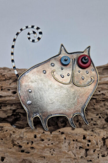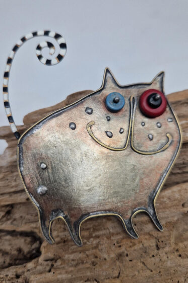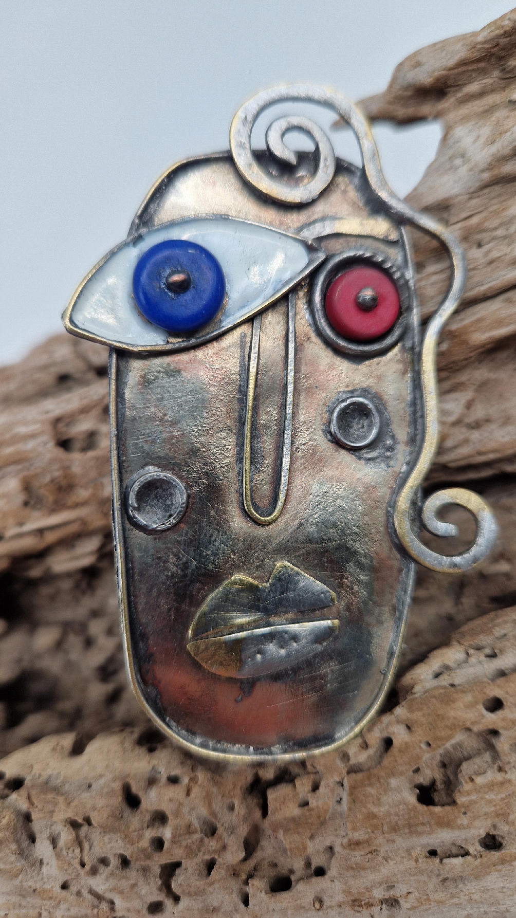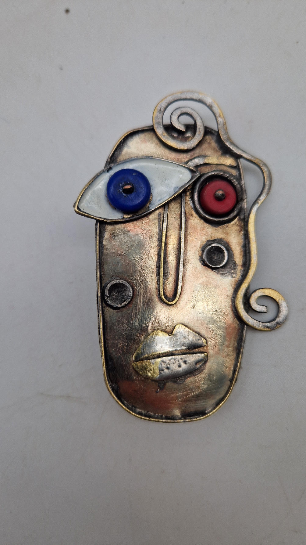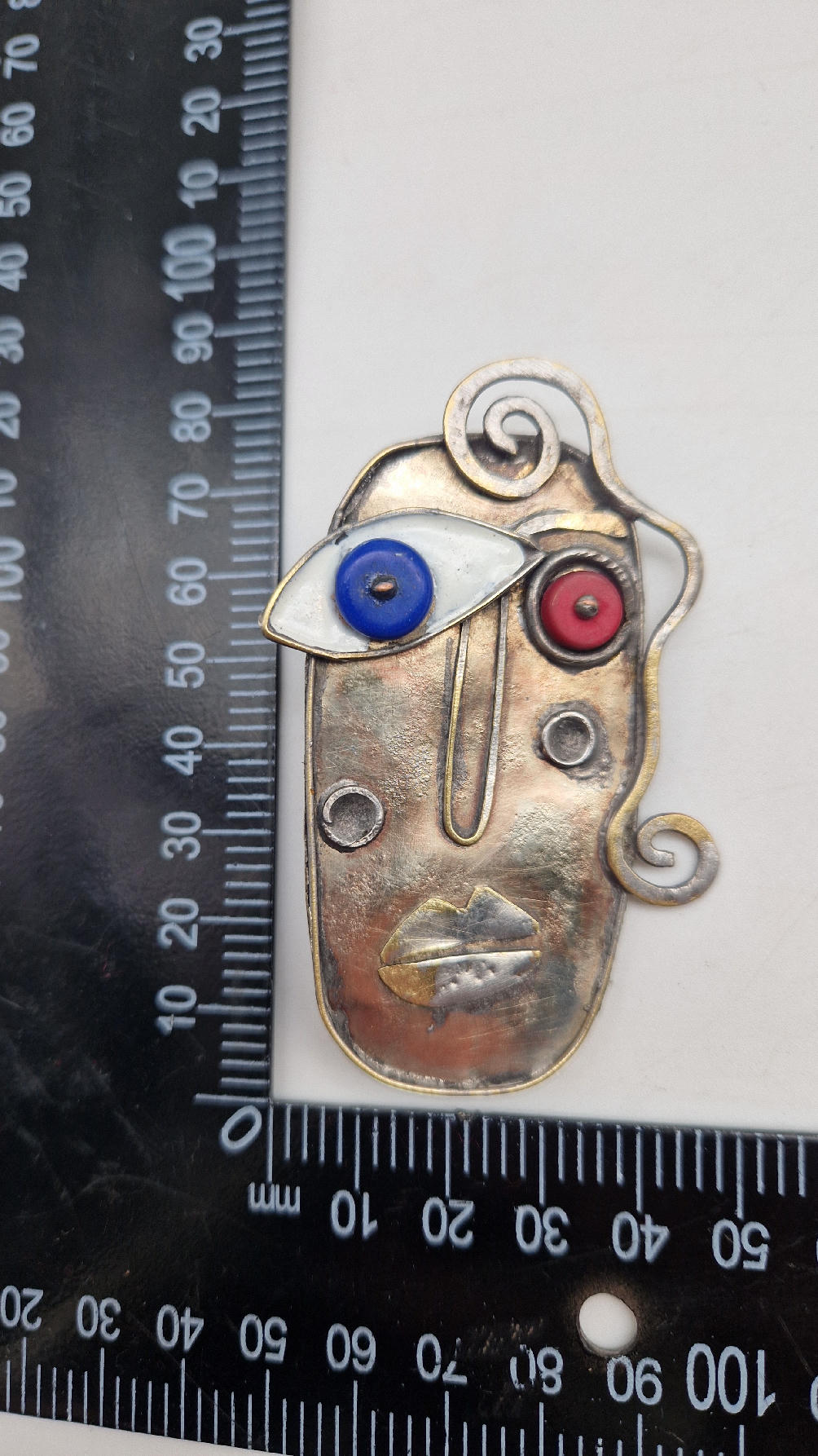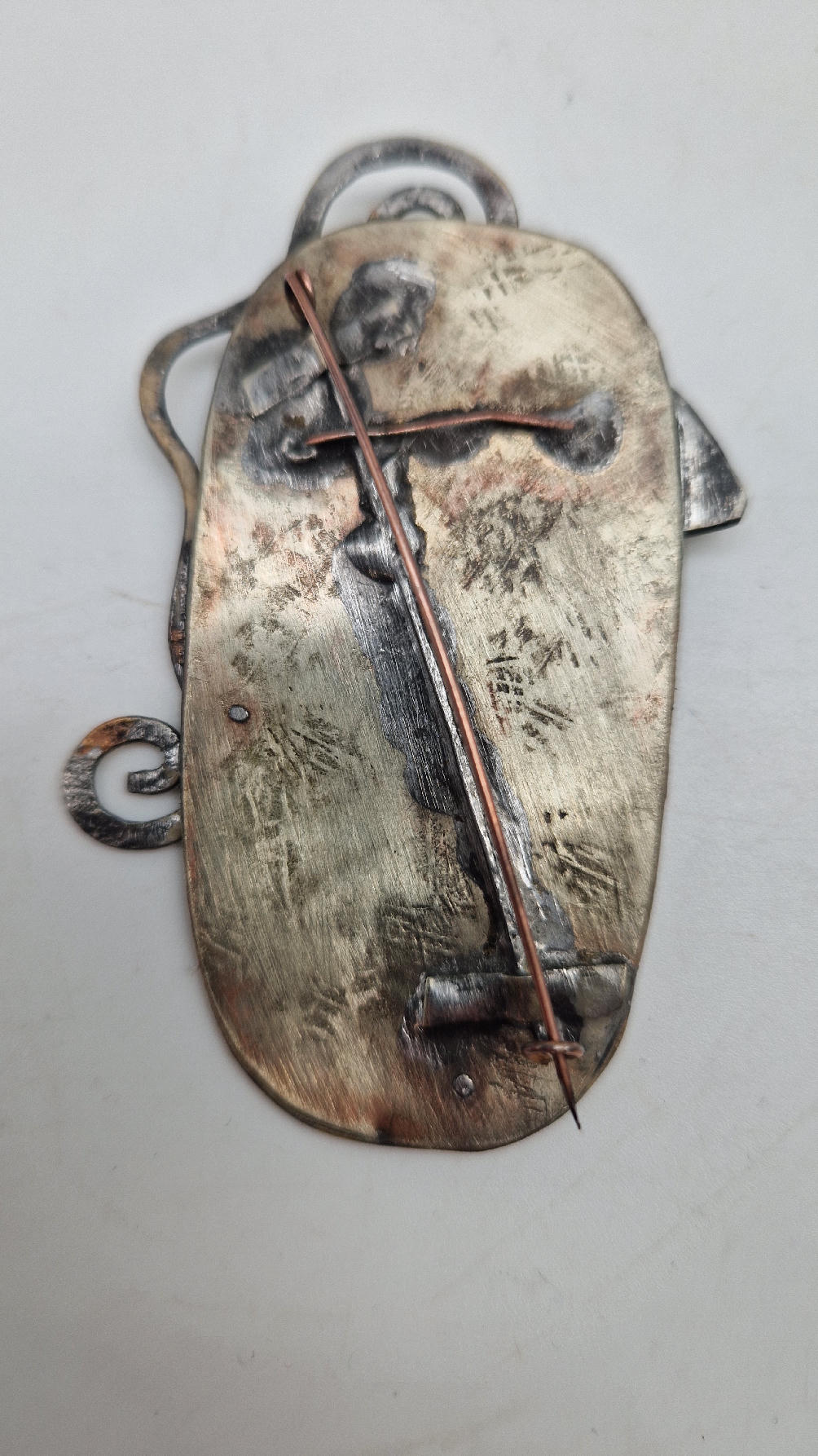 Brocha zrobiona jest z blachy alpakowej i mosiężnego drutu, zapinana na dużą szpilę, oko Luli pokryte emalią, oczy z turkmenitów