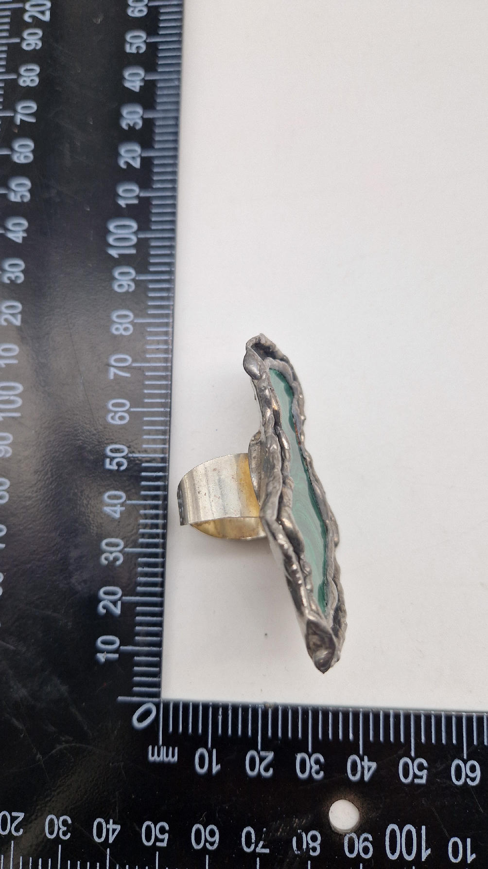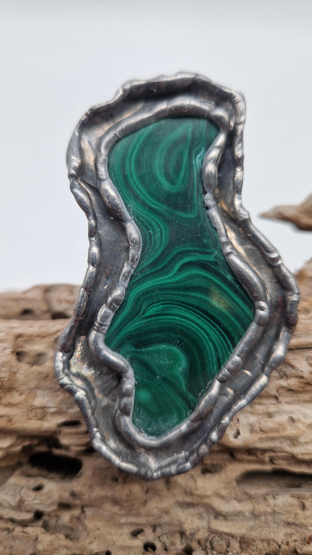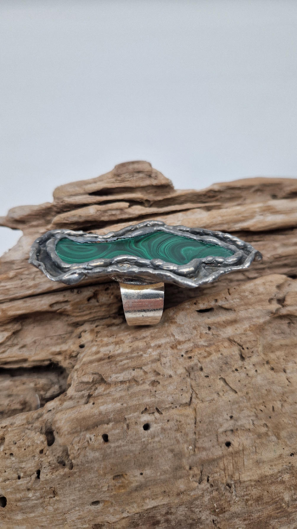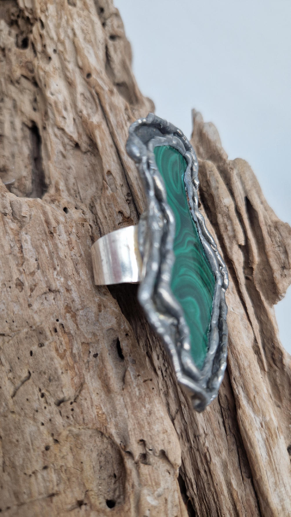 Niezwykle piękny,  podłużny, nieregularny ,  mega duży pierścionek z malachitem. Cudny malachit, zielony jak liście latem …albo malachit po prostu….oprawiony w kutą i patynowaną miedź. Piękna metaloplastyka z pięknym kamieniem . Pierścionek ma regulowaną obrączkę, więc pasuje na każdy palec…ale możesz powiesić go na łańcuszku lub rzemieniu, jeśli nie lubisz pierścionków, a podoba Ci się forma i kamień…