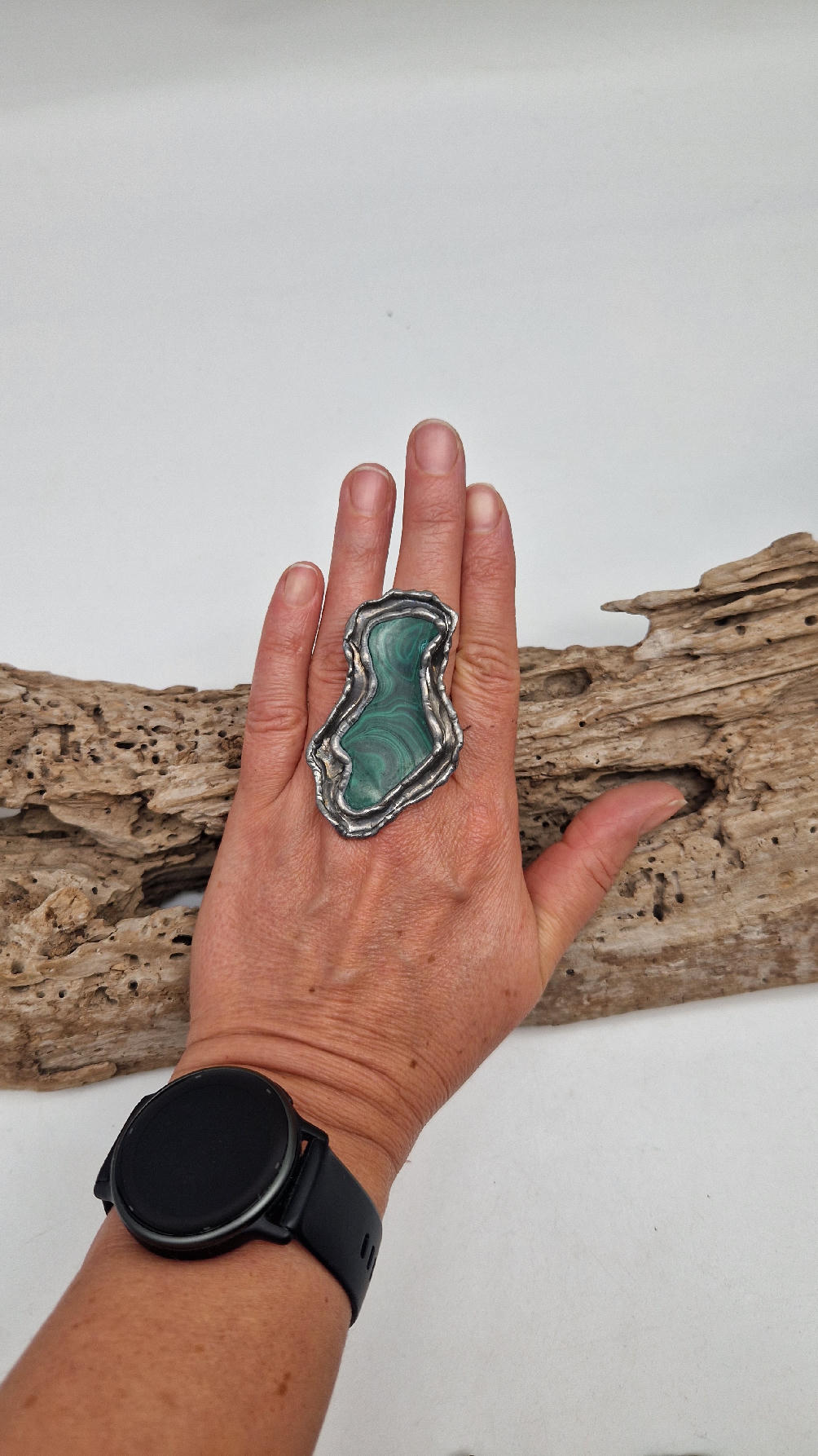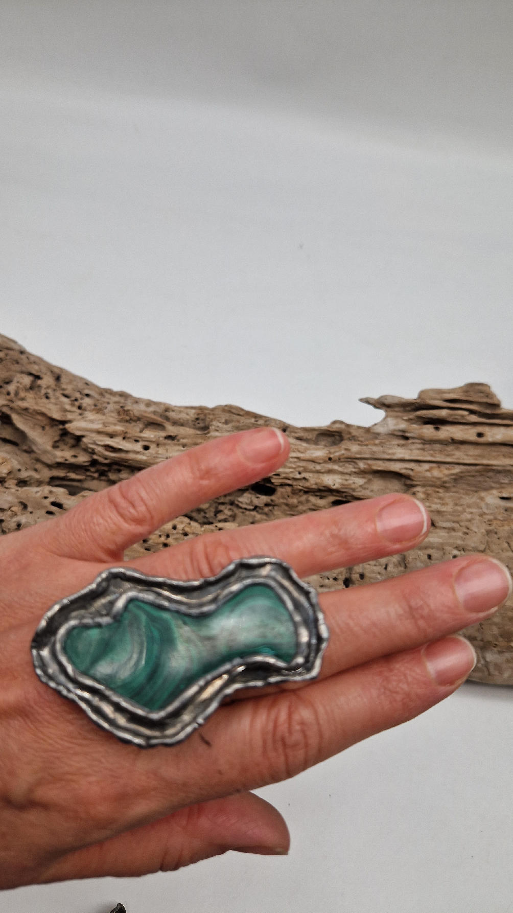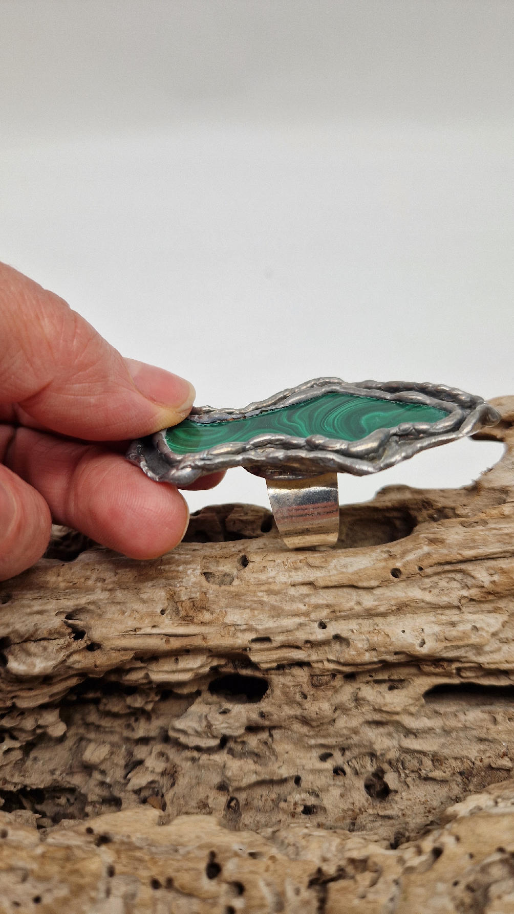 Niezwykle piękny,  podłużny, nieregularny ,  mega duży pierścionek z malachitem. Cudny malachit, zielony jak liście latem …albo malachit po prostu….oprawiony w kutą i patynowaną miedź. Piękna metaloplastyka z pięknym kamieniem . Pierścionek ma regulowaną obrączkę, więc pasuje na każdy palec…ale możesz powiesić go na łańcuszku lub rzemieniu, jeśli nie lubisz pierścionków, a podoba Ci się forma i kamień…