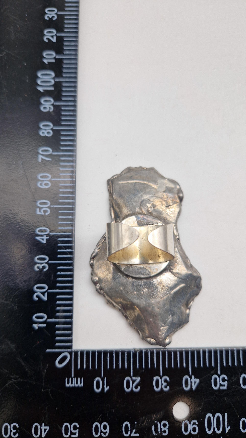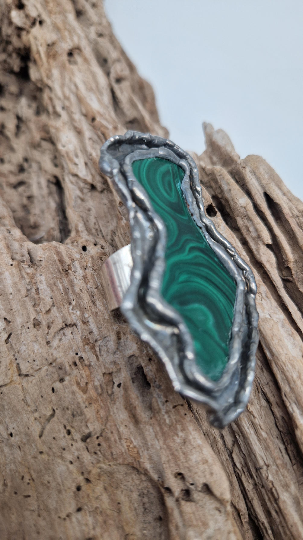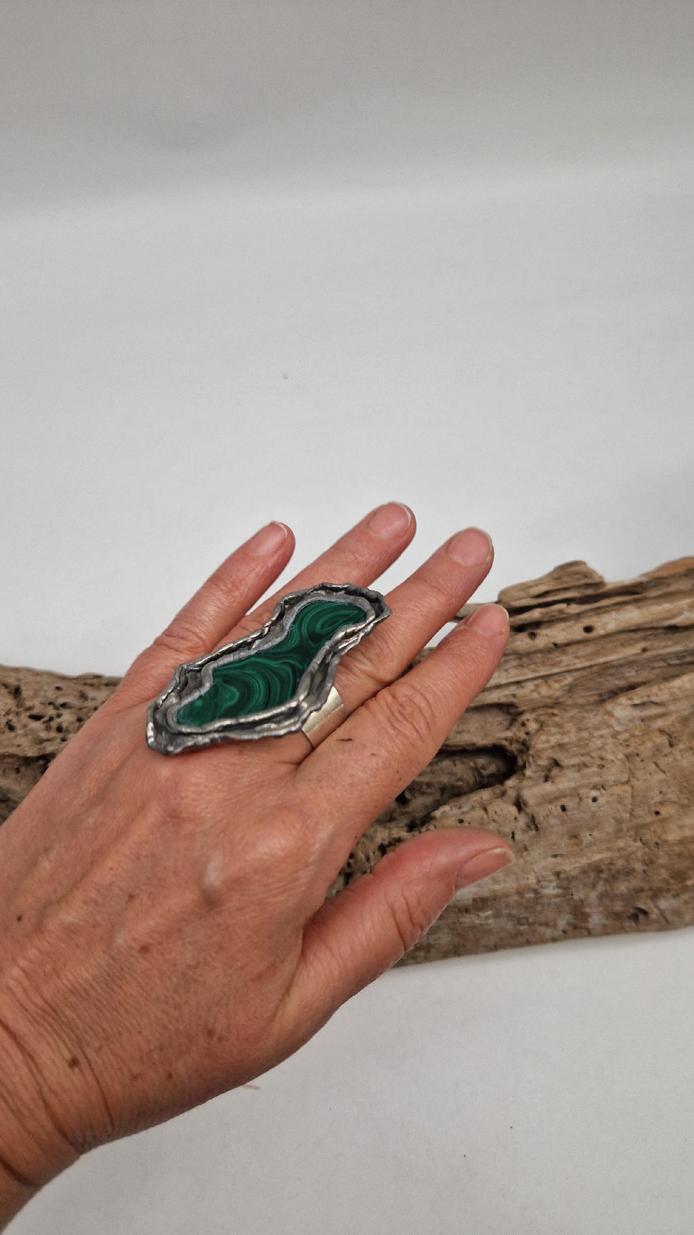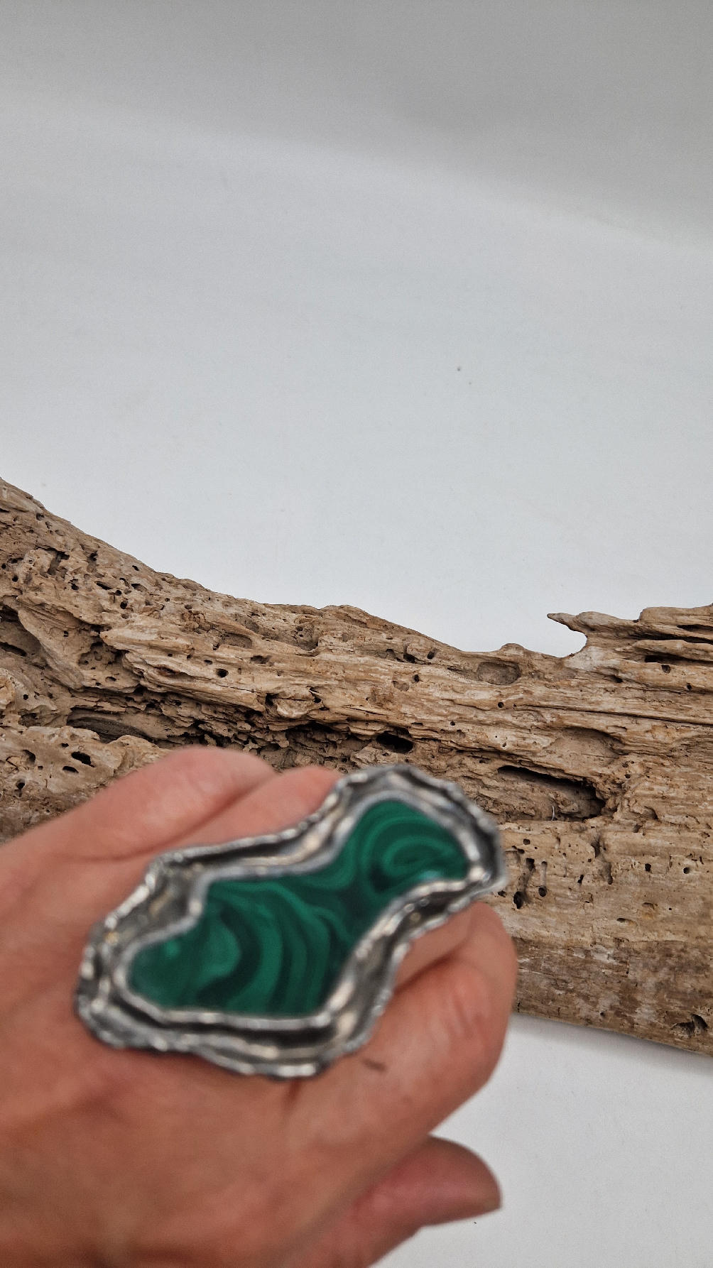Niezwykle piękny,  podłużny, nieregularny ,  mega duży pierścionek z malachitem. Cudny malachit, zielony jak liście latem …albo malachit po prostu….oprawiony w kutą i patynowaną miedź. Piękna metaloplastyka z pięknym kamieniem . Pierścionek ma regulowaną obrączkę, więc pasuje na każdy palec…ale możesz powiesić go na łańcuszku lub rzemieniu, jeśli nie lubisz pierścionków, a podoba Ci się forma i kamień…