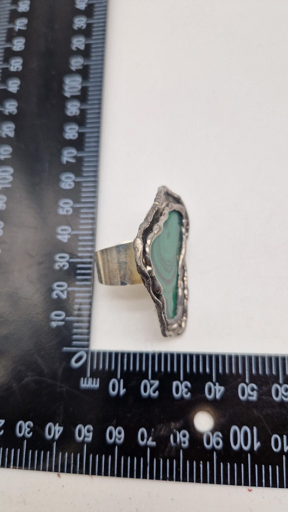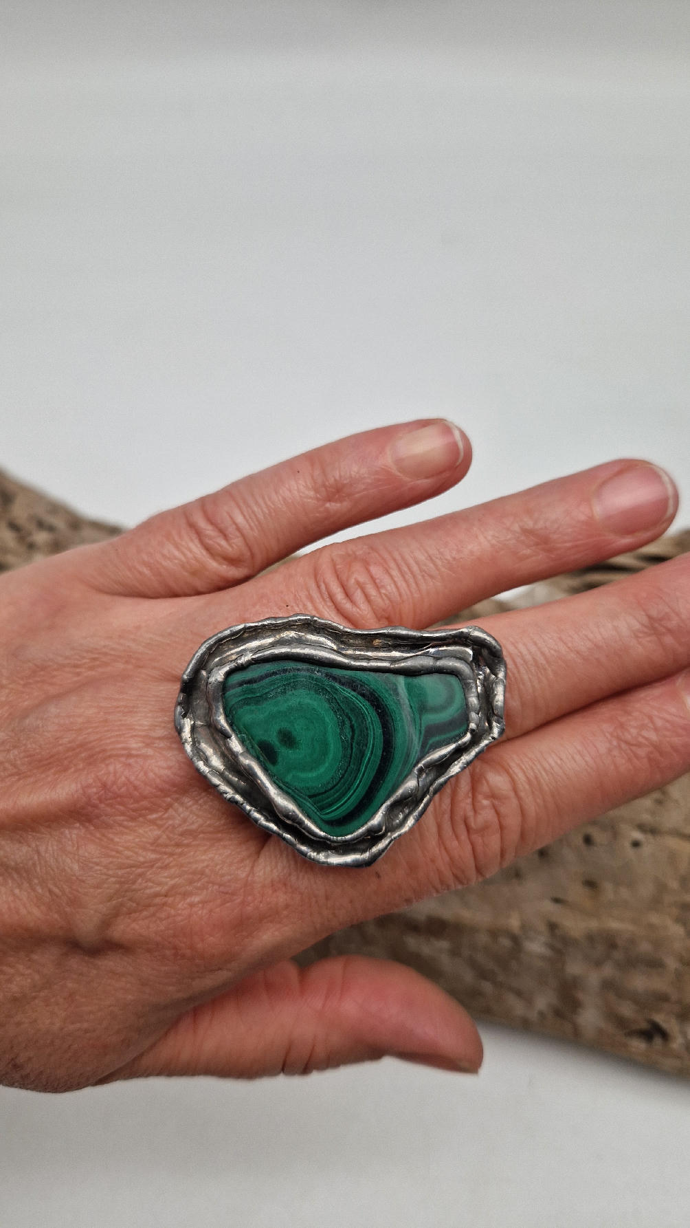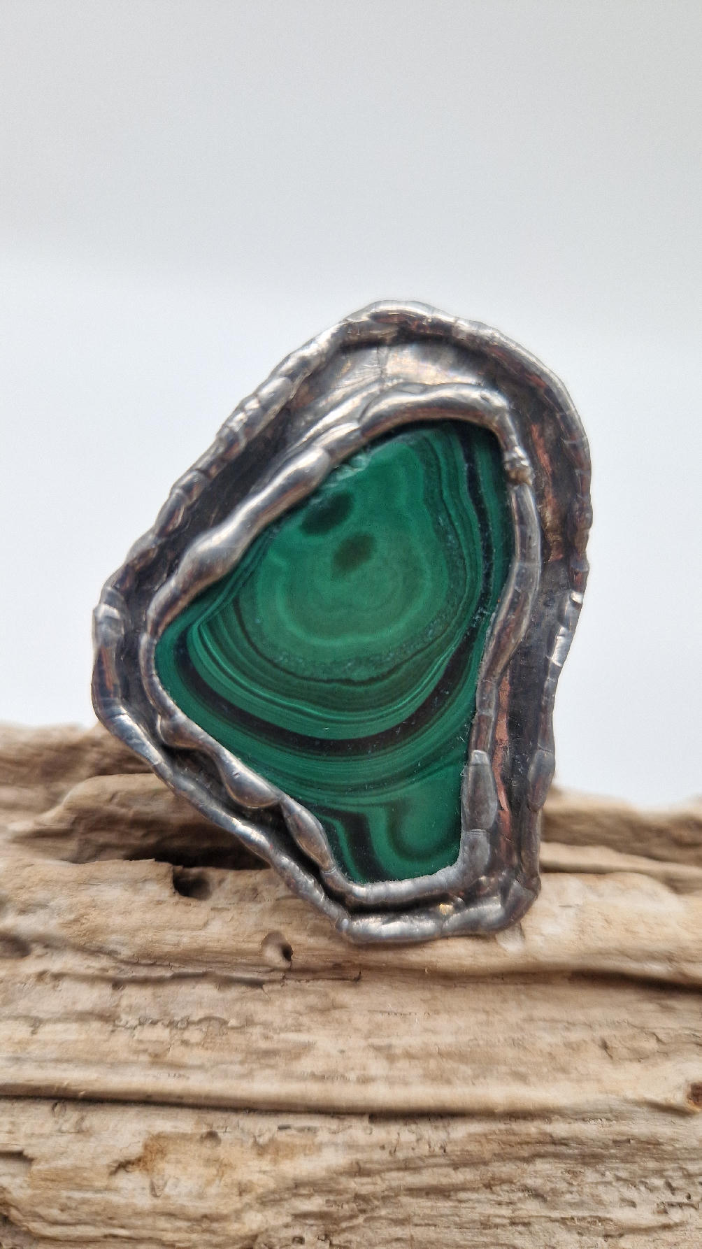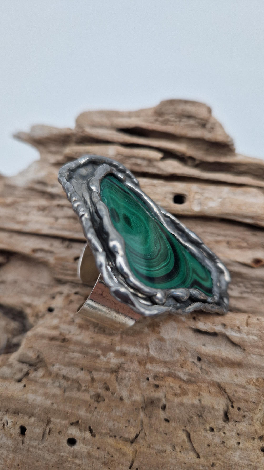 Niezwykle piękny, nieregularny , duży pierścionek z malachitem. Cudny malachit, zielony jak liście latem oprawiony w kutą i patynowaną miedź. Piękna metaloplastyka z pięknym kamieniem . Pierścionek ma regulowaną obrączkę, więc pasuje na każdy palec…ale możesz powiesić go na łańcuszku lub rzemieniu, jeśli nie lubisz pierścionków, a podoba Ci się forma i kamień…