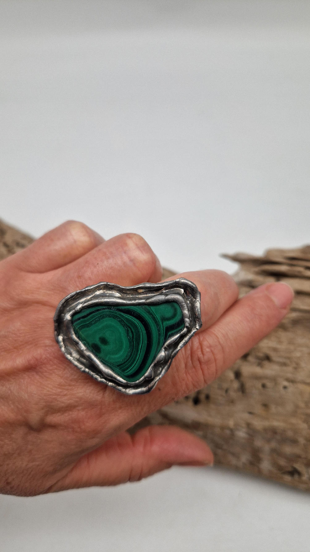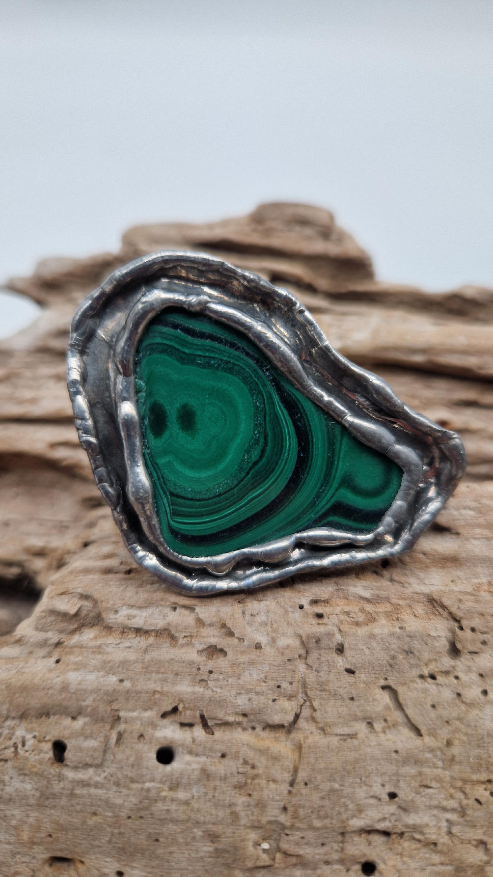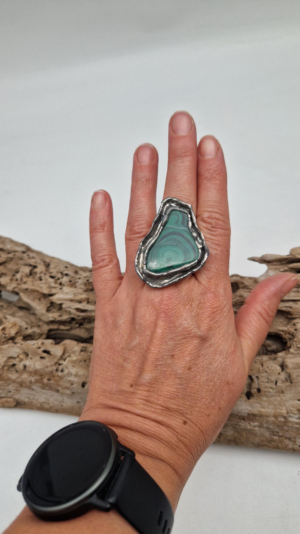 Niezwykle piękny, nieregularny , duży pierścionek z malachitem. Cudny malachit, zielony jak liście latem oprawiony w kutą i patynowaną miedź. Piękna metaloplastyka z pięknym kamieniem . Pierścionek ma regulowaną obrączkę, więc pasuje na każdy palec…ale możesz powiesić go na łańcuszku lub rzemieniu, jeśli nie lubisz pierścionków, a podoba Ci się forma i kamień…