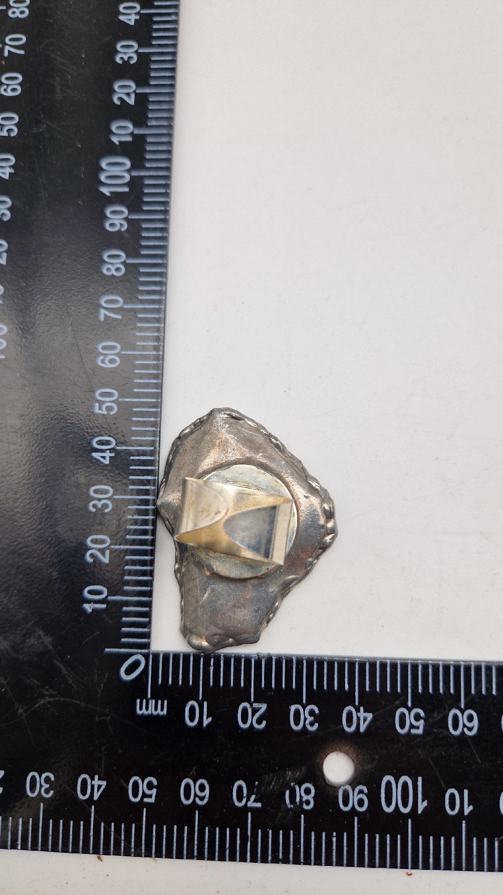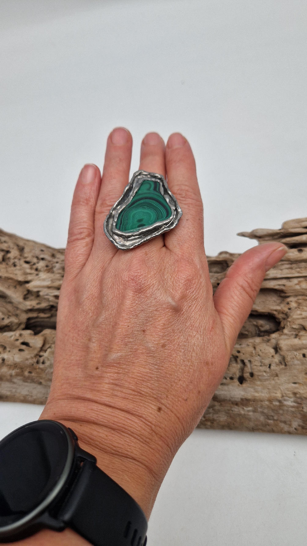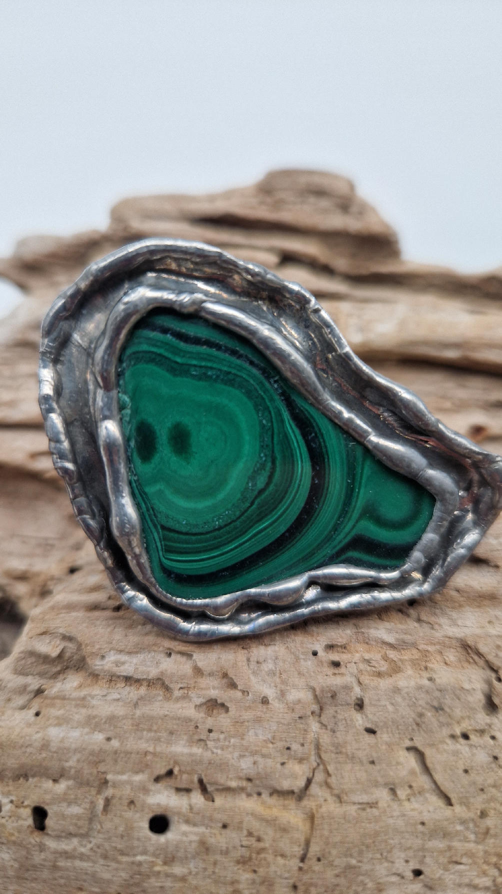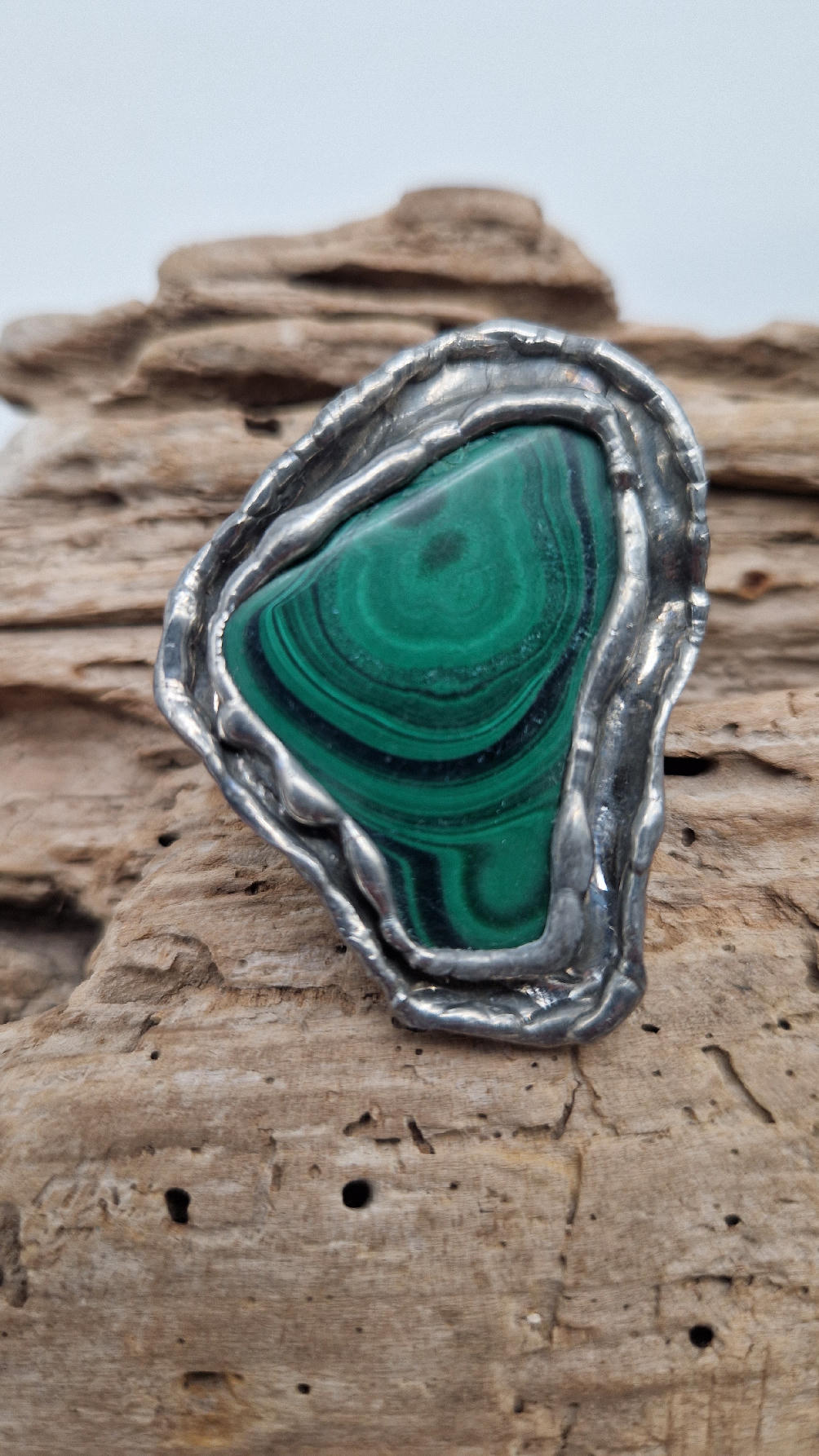 Niezwykle piękny, nieregularny , duży pierścionek z malachitem. Cudny malachit, zielony jak liście latem oprawiony w kutą i patynowaną miedź. Piękna metaloplastyka z pięknym kamieniem . Pierścionek ma regulowaną obrączkę, więc pasuje na każdy palec…ale możesz powiesić go na łańcuszku lub rzemieniu, jeśli nie lubisz pierścionków, a podoba Ci się forma i kamień…