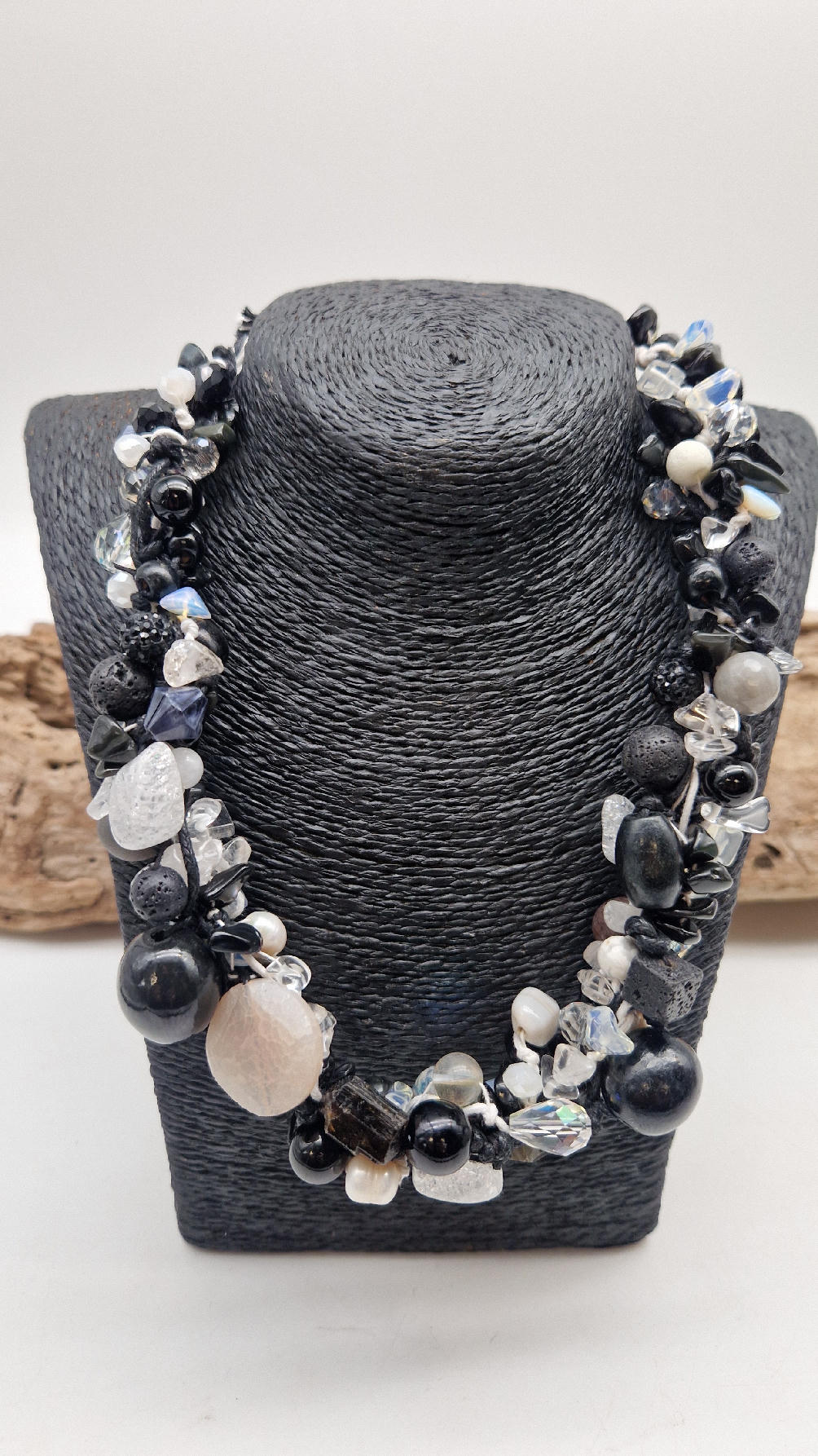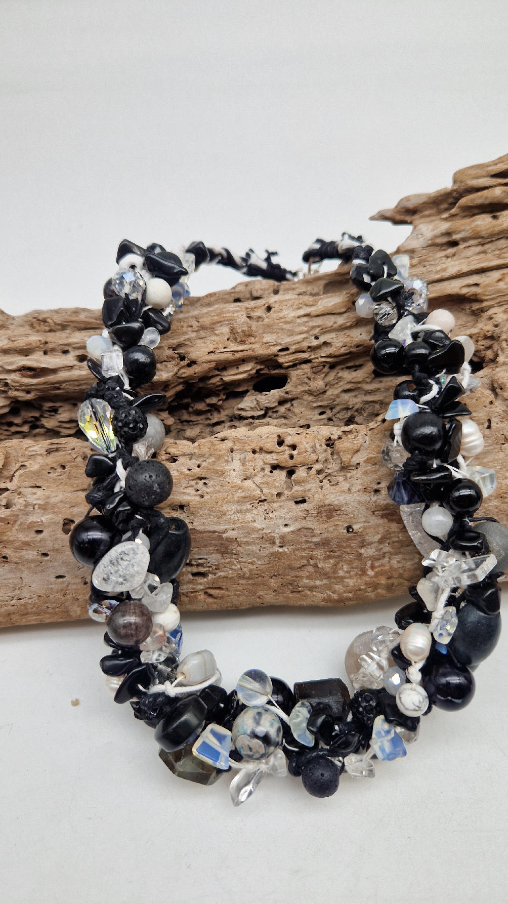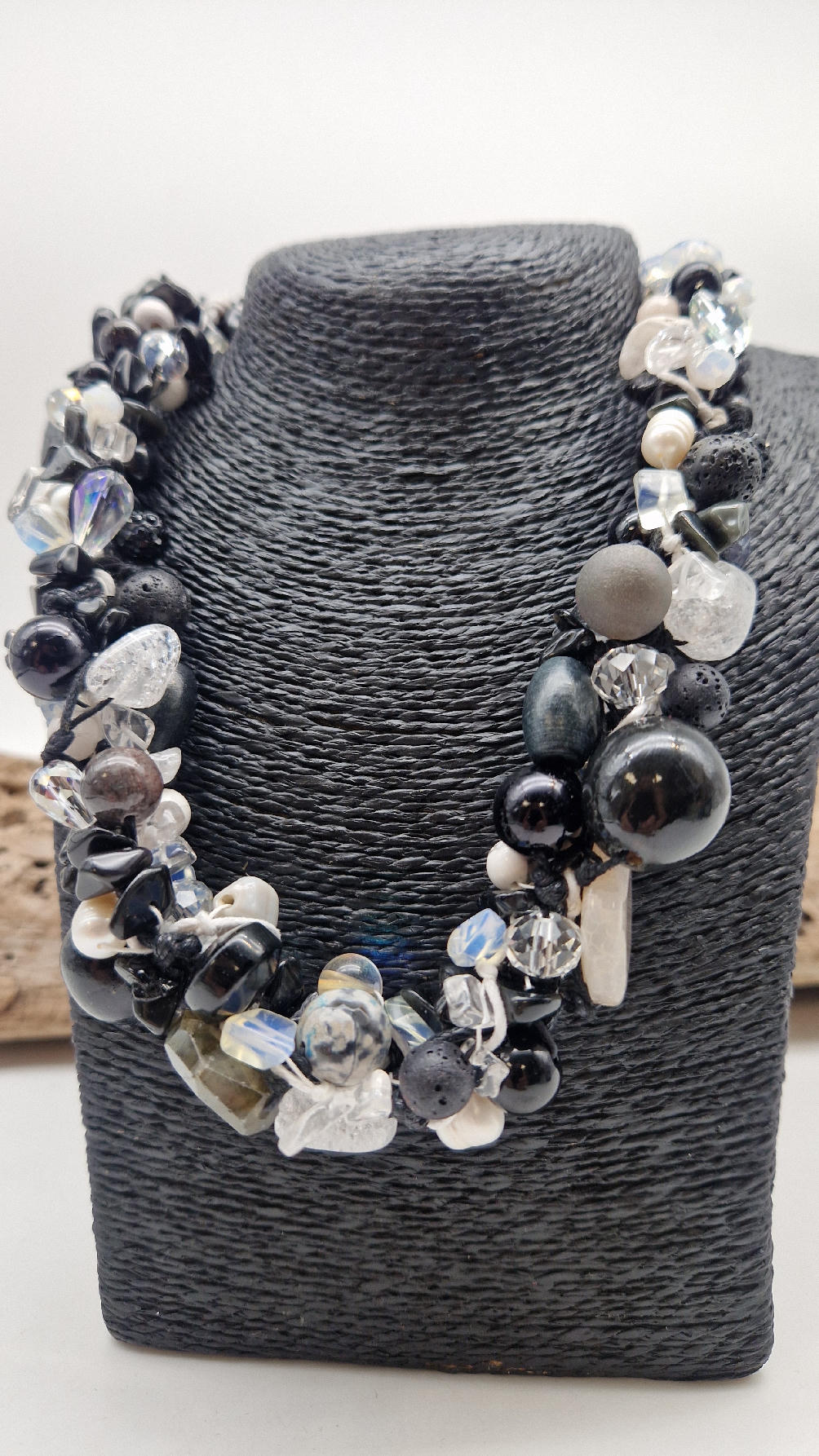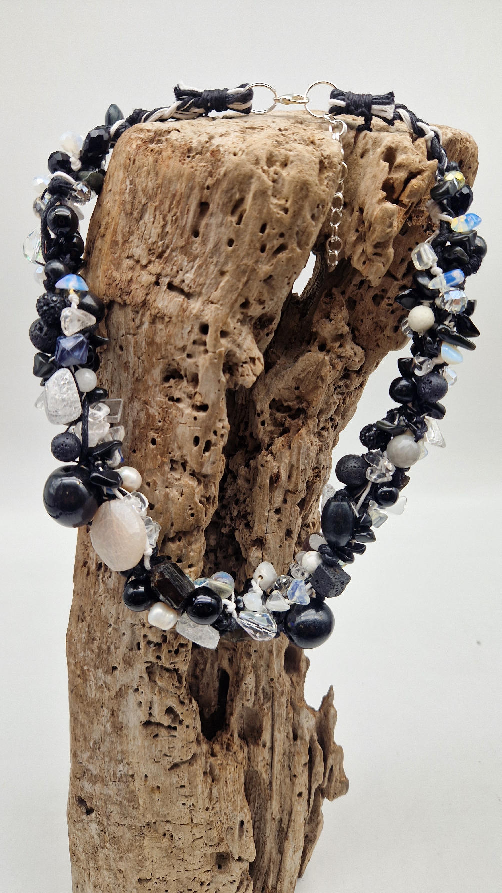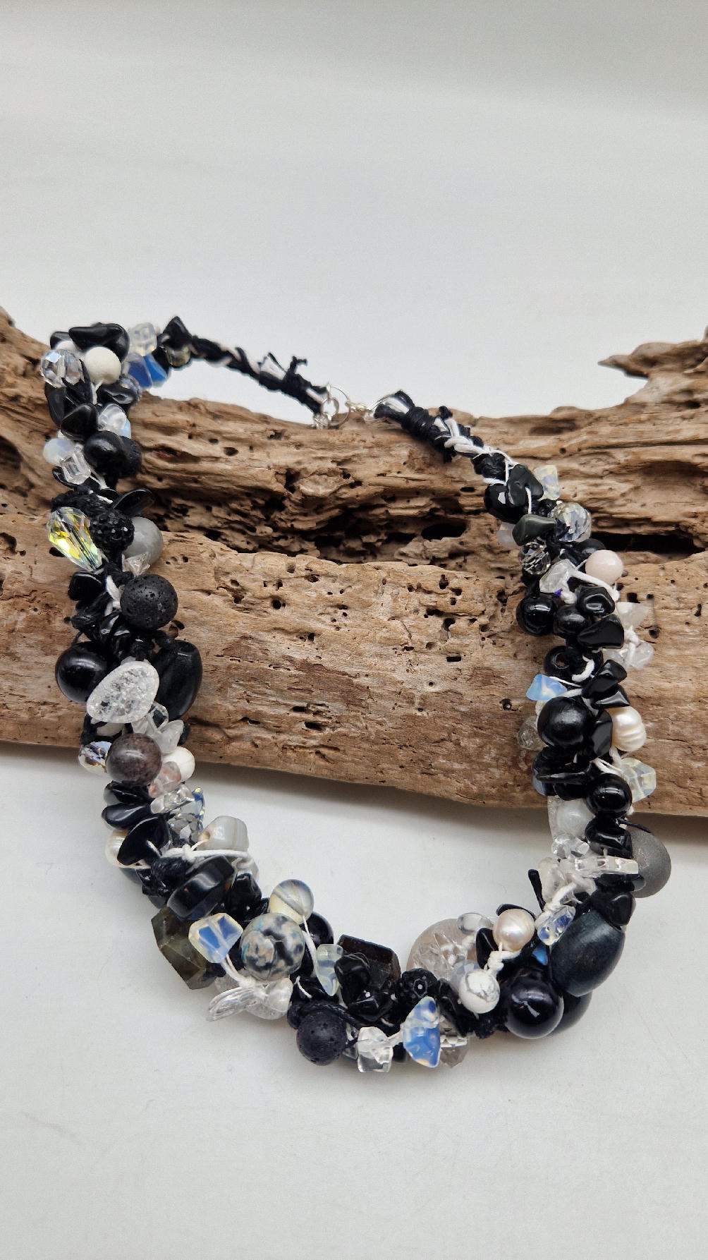 Przepiękny biało-szaro-czarny naszyjnik wykonany z bardzo wielu elementów, z naturalnych kamieni – onyksów, pereł, opali, lawy, kryształów, ociupiny srebra w postaci błyszczących koralików zaplatanych artystycznie i połączonych naturalnym sznurkiem.