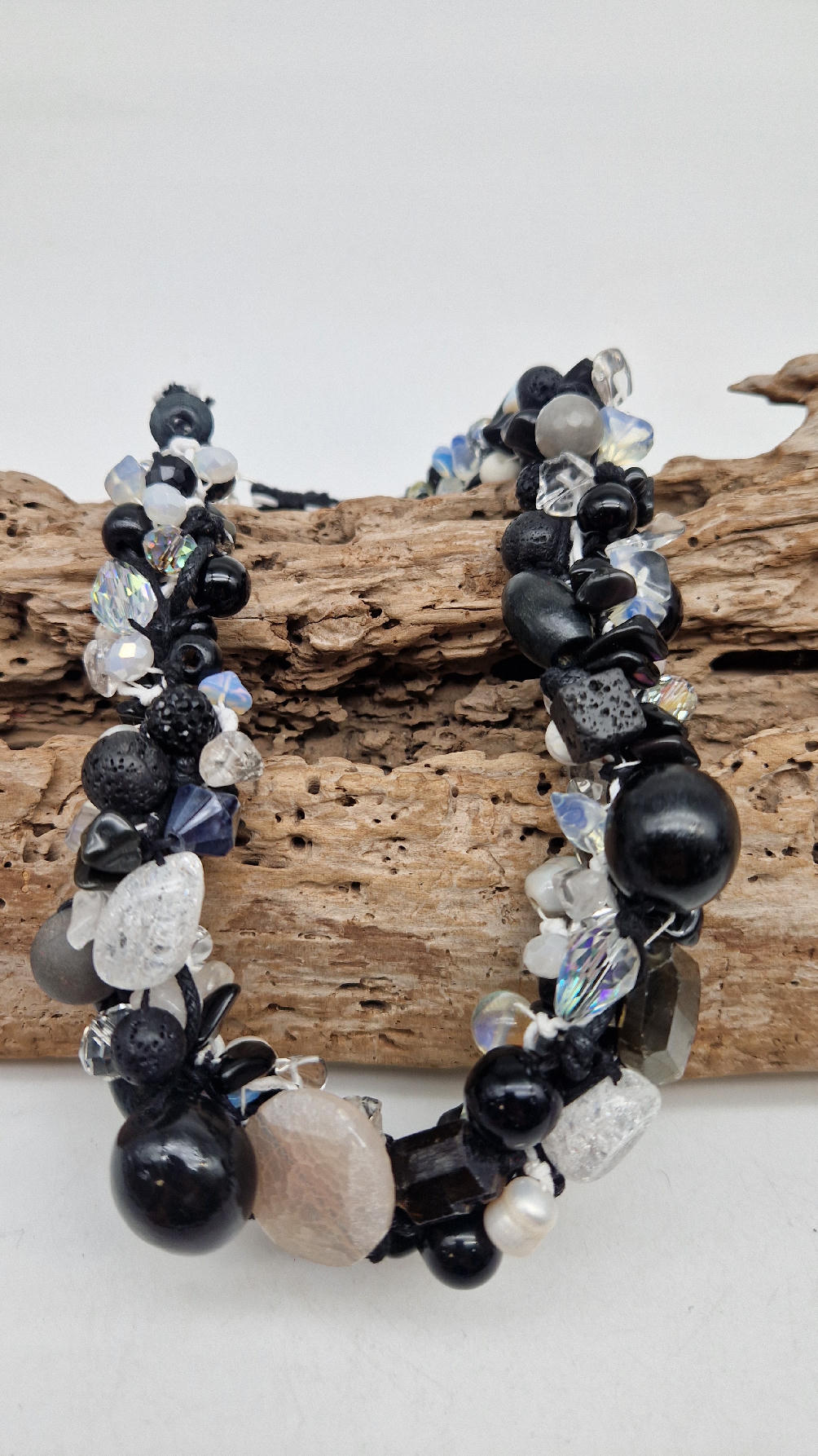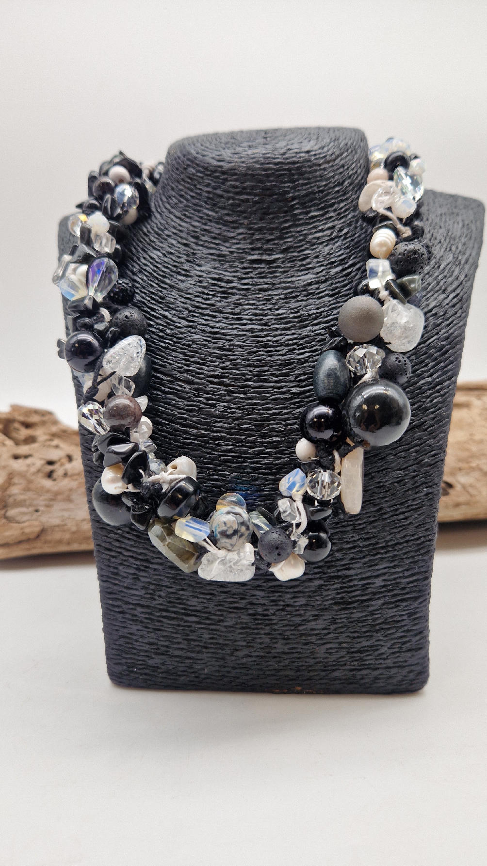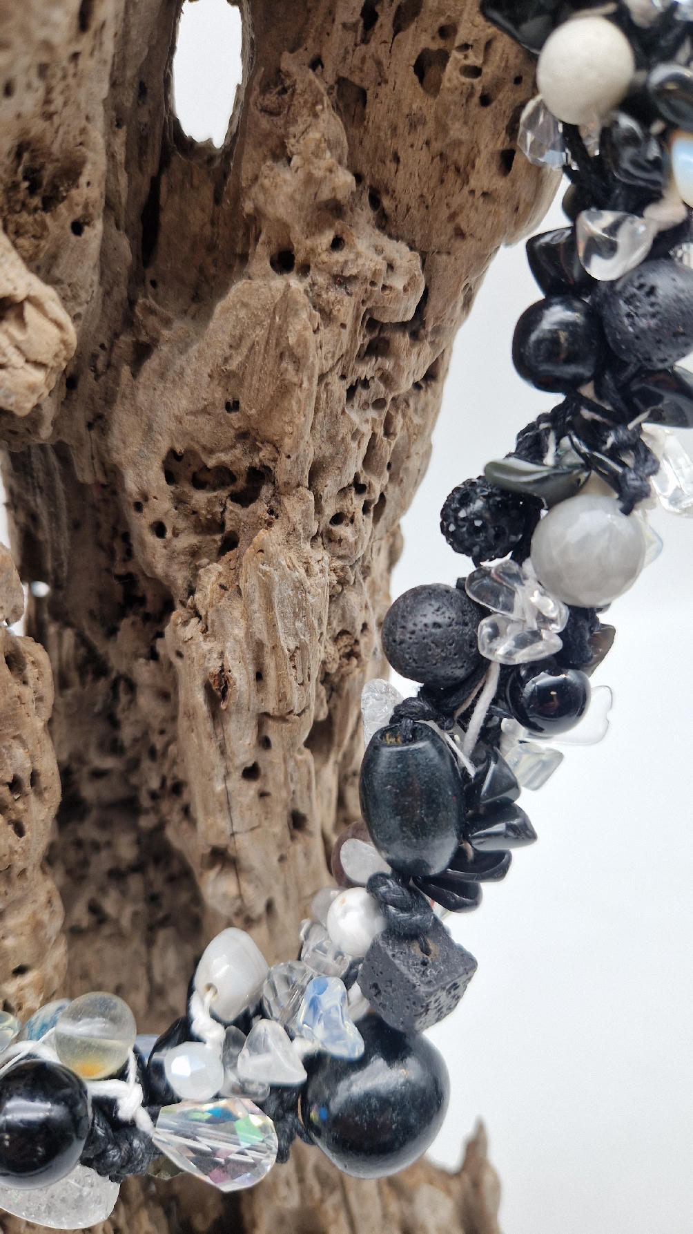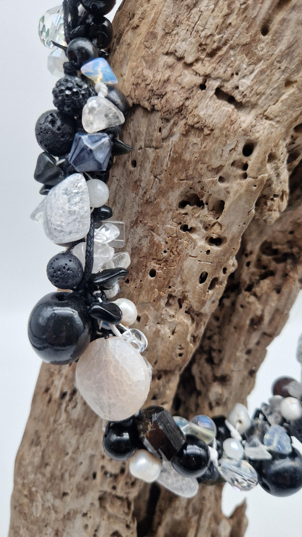 Przepiękny biało-szaro-czarny naszyjnik wykonany z bardzo wielu elementów, z naturalnych kamieni – onyksów, pereł, opali, lawy, kryształów, ociupiny srebra w postaci błyszczących koralików zaplatanych artystycznie i połączonych naturalnym sznurkiem.