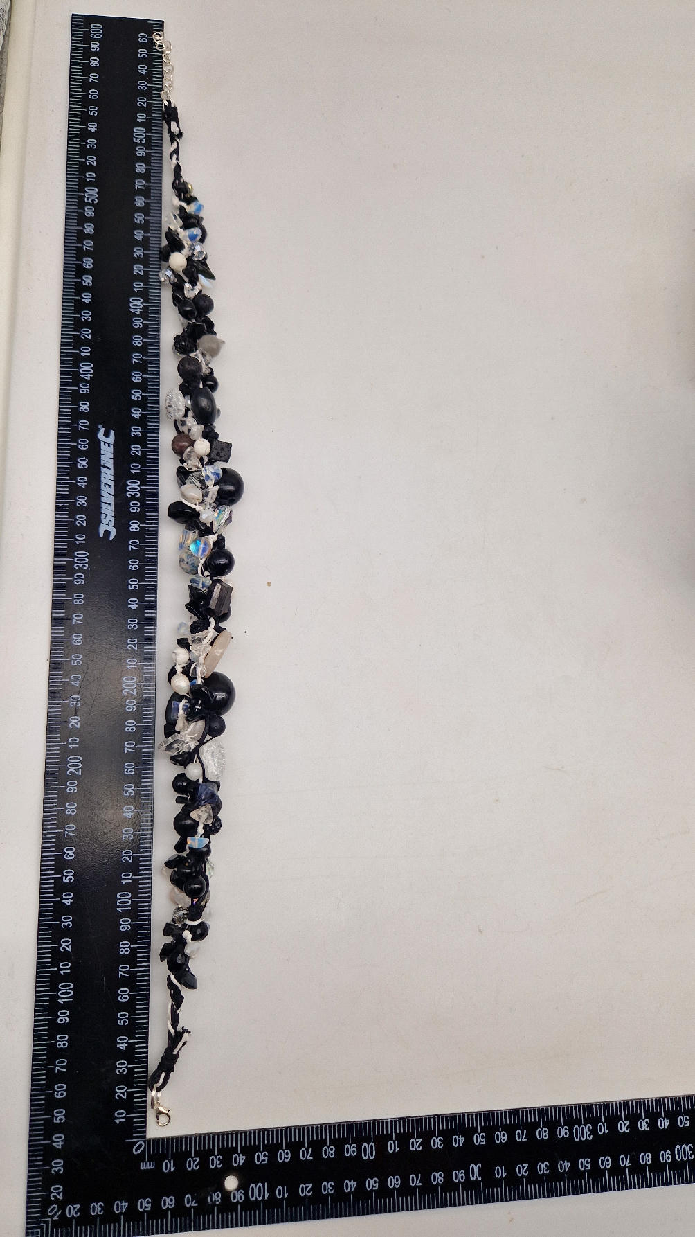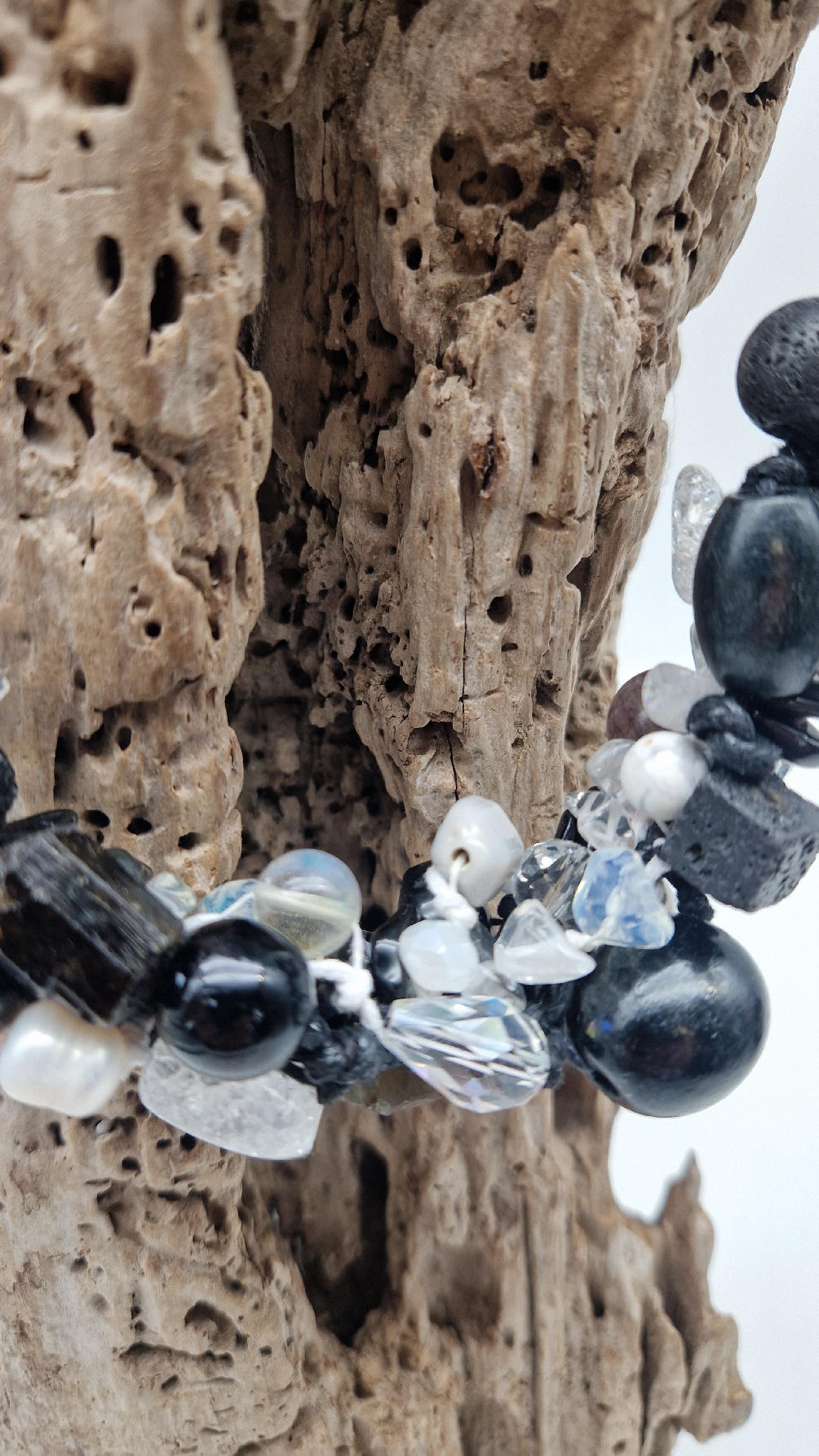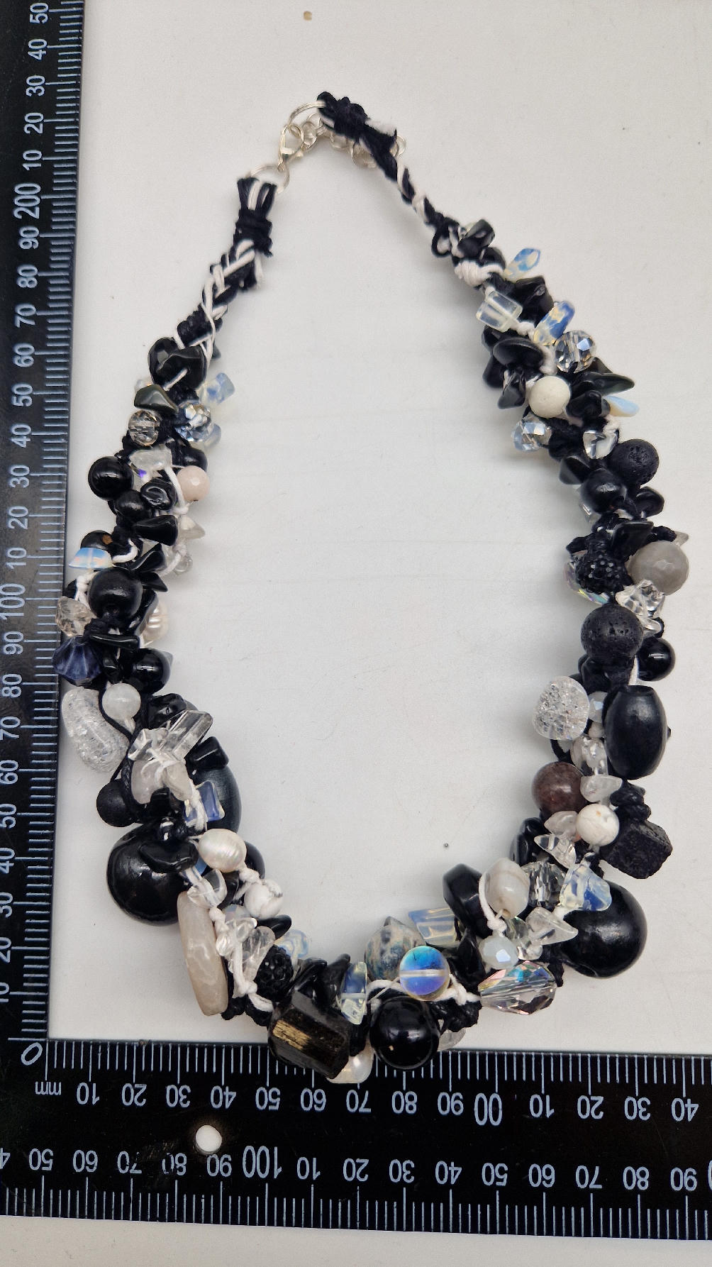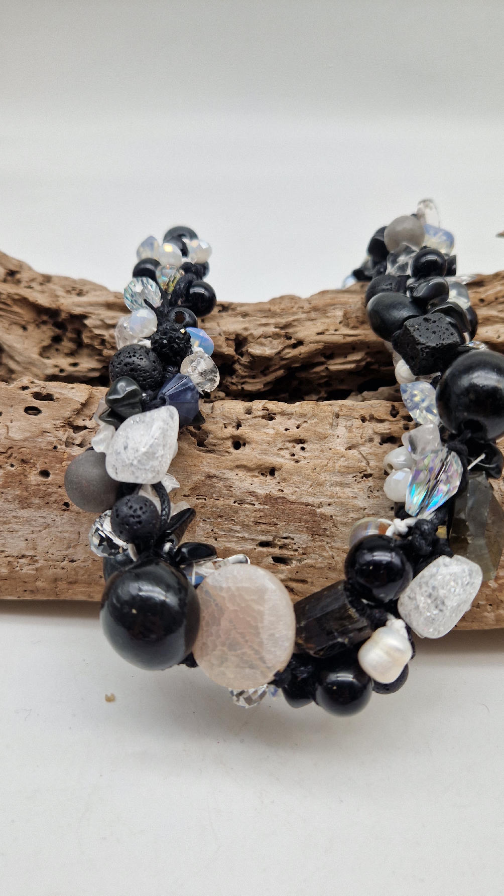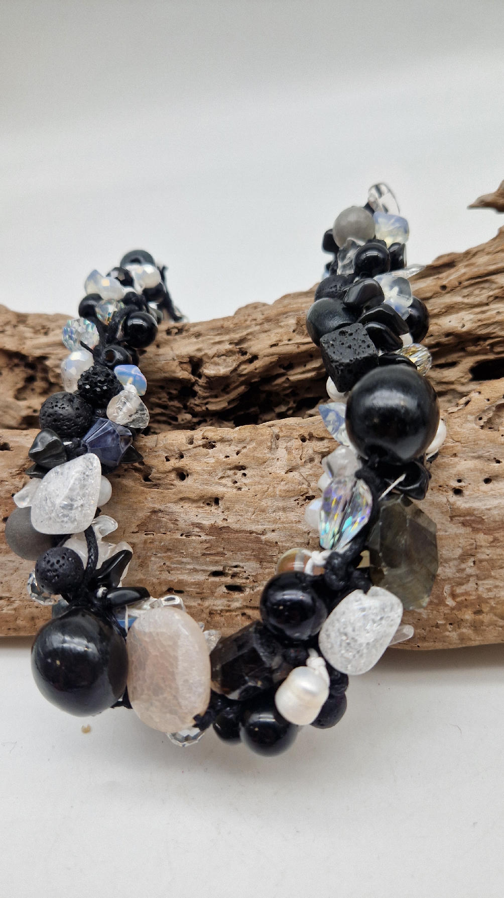 Przepiękny biało-szaro-czarny naszyjnik wykonany z bardzo wielu elementów, z naturalnych kamieni – onyksów, pereł, opali, lawy, kryształów, ociupiny srebra w postaci błyszczących koralików zaplatanych artystycznie i połączonych naturalnym sznurkiem.