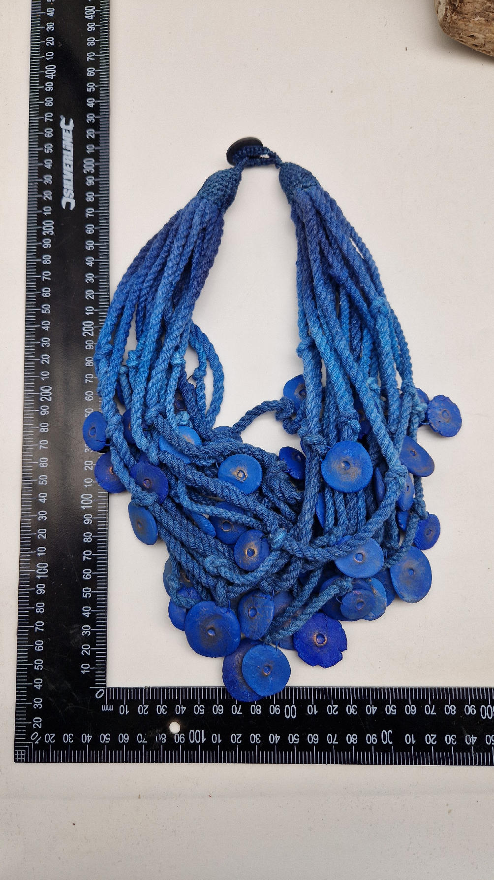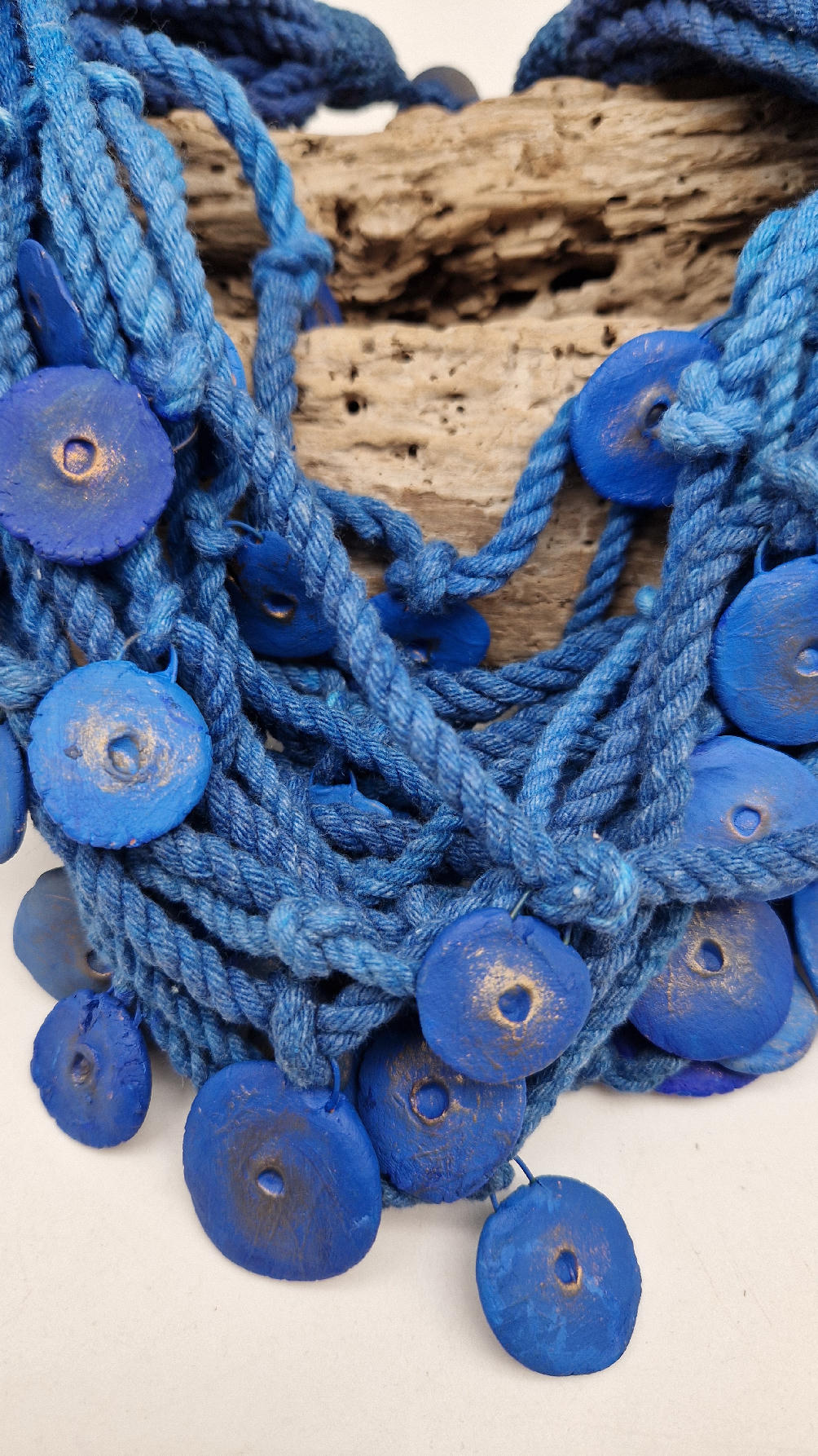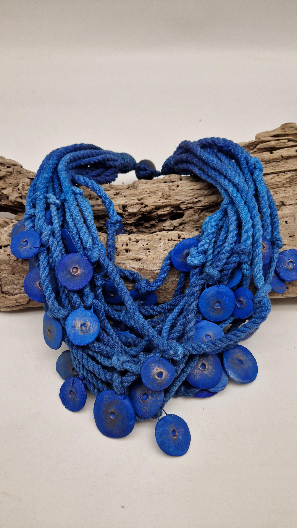 Chabrowy, kobaltowy, meganiebieski, elegancki przepiękny naszyjnik, wykonany z bawełnianych, ręcznie farbowanych sznurków … Do tych bawełnianych sznurków zostały przymocowane dziesiątki uformowanych ręcznie, wypalonych i zabarwionych niemal magicznie koralików.