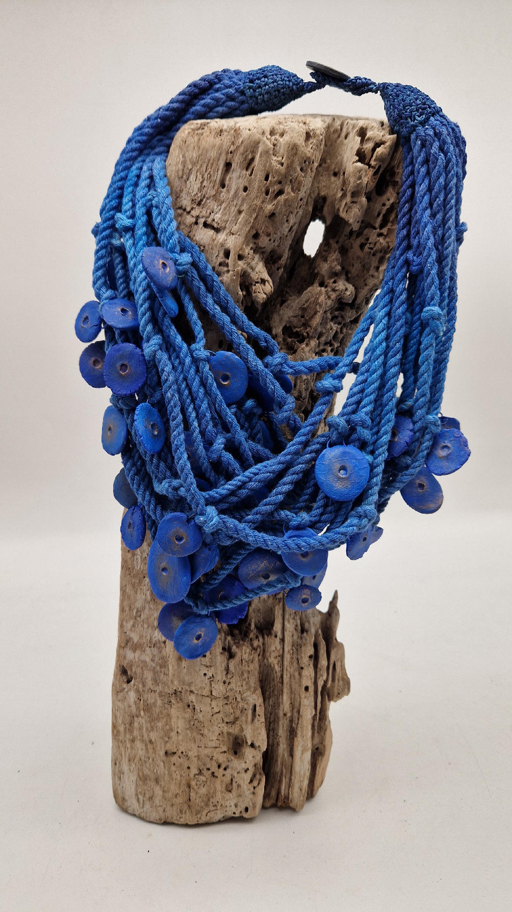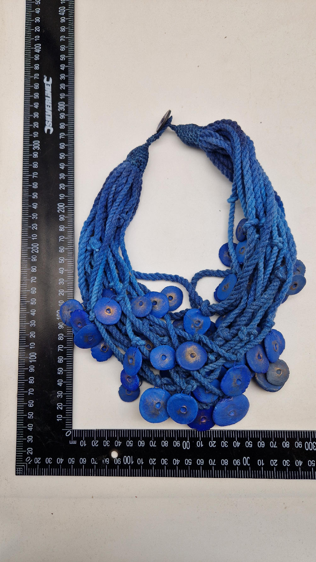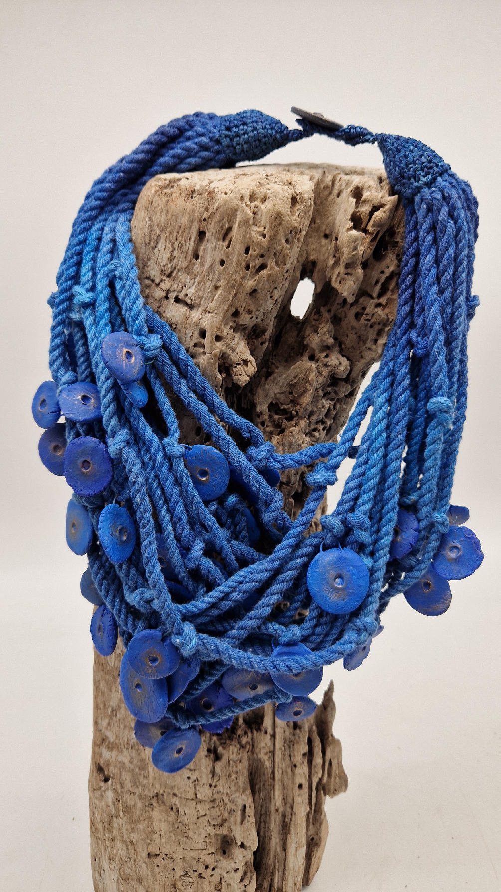 Chabrowy, kobaltowy, meganiebieski, elegancki przepiękny naszyjnik, wykonany z bawełnianych, ręcznie farbowanych sznurków … Do tych bawełnianych sznurków zostały przymocowane dziesiątki uformowanych ręcznie, wypalonych i zabarwionych niemal magicznie koralików.