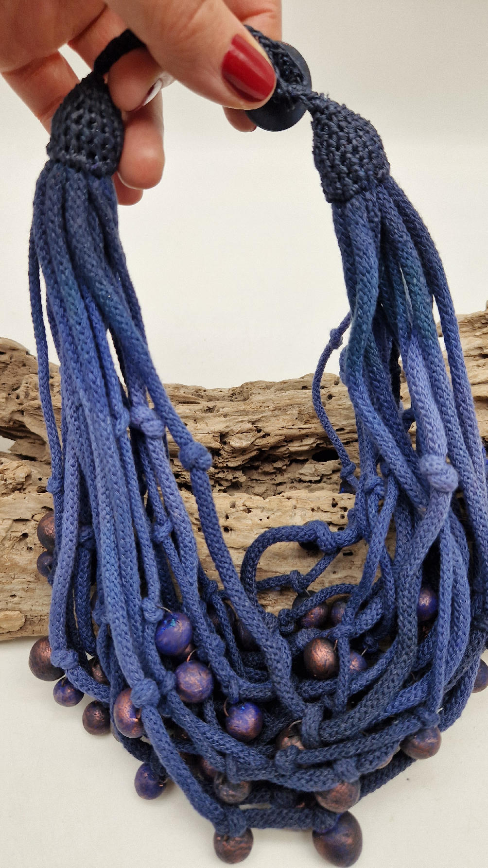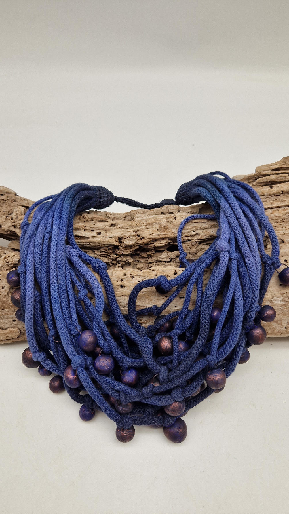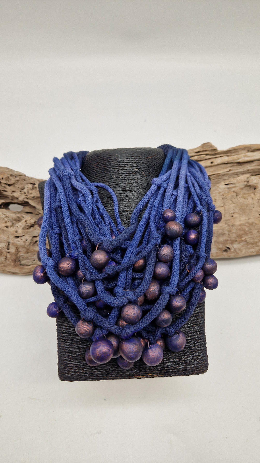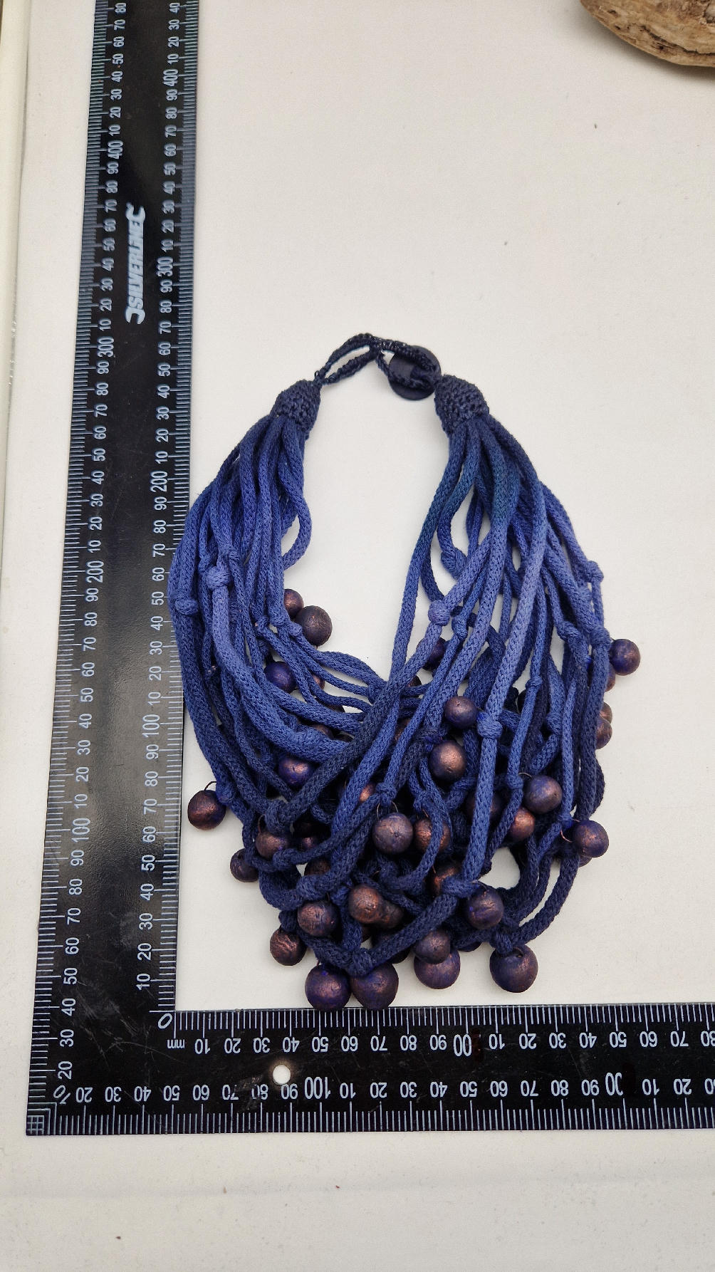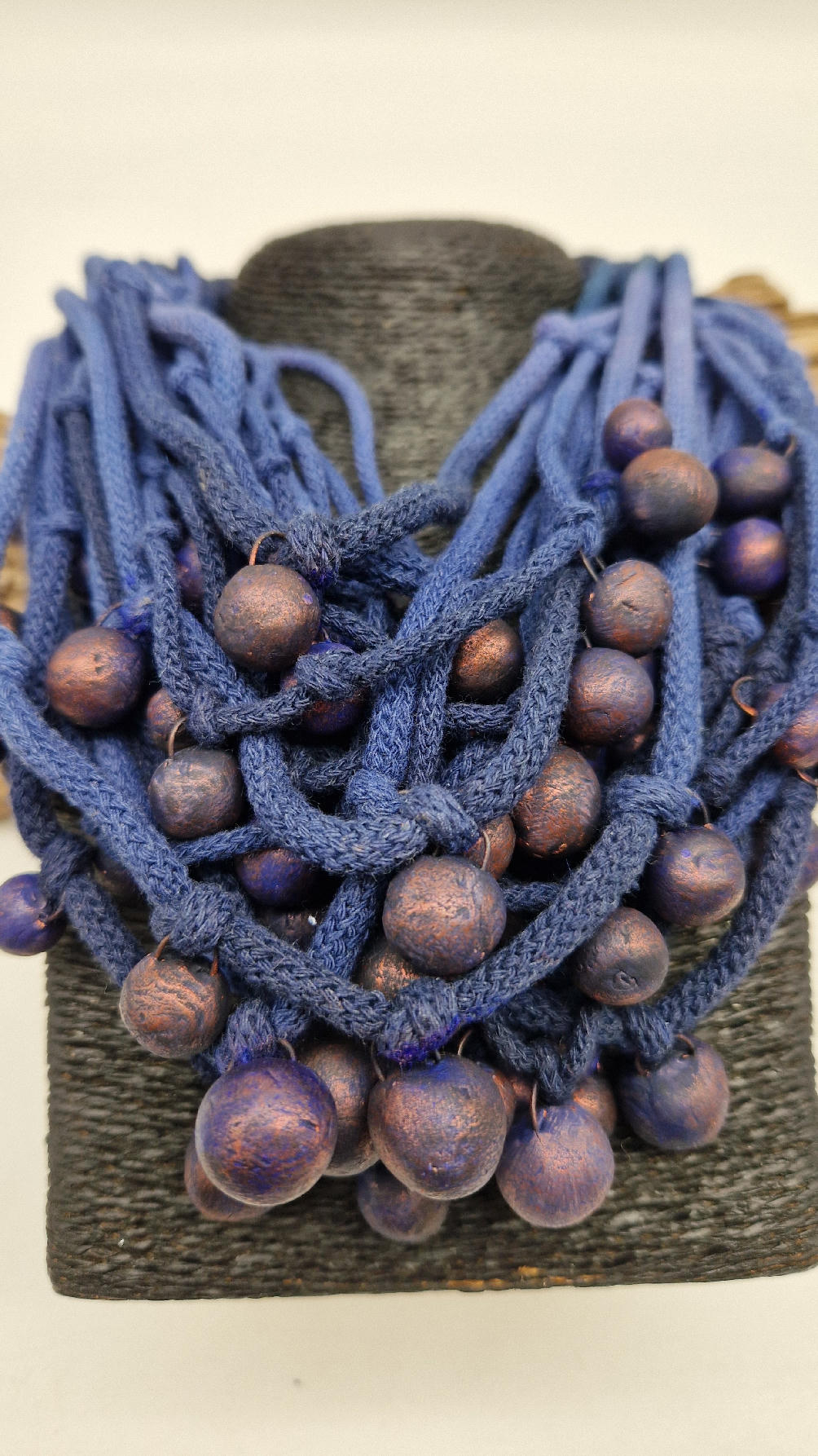 Kobaltowo- miedziano-jagodowy, energetyczny , przepiękny naszyjnik, wykonany z bawełnianych, ręcznie farbowanych sznurków ,.. Do tych bawełnianych sznurków zostały przymocowane dziesiątki uformowanych ręcznie, wypalonych i zabarwionych niemal magicznie koralików, kulek muśniętych miedzią