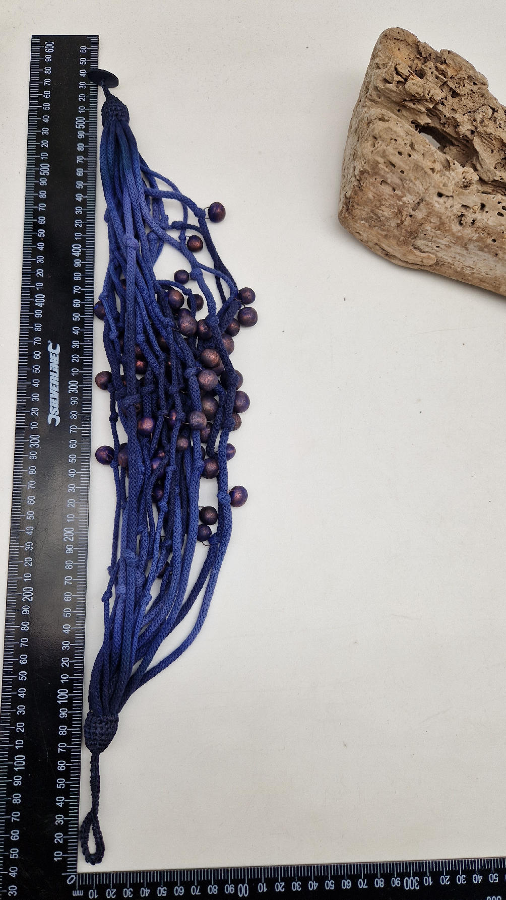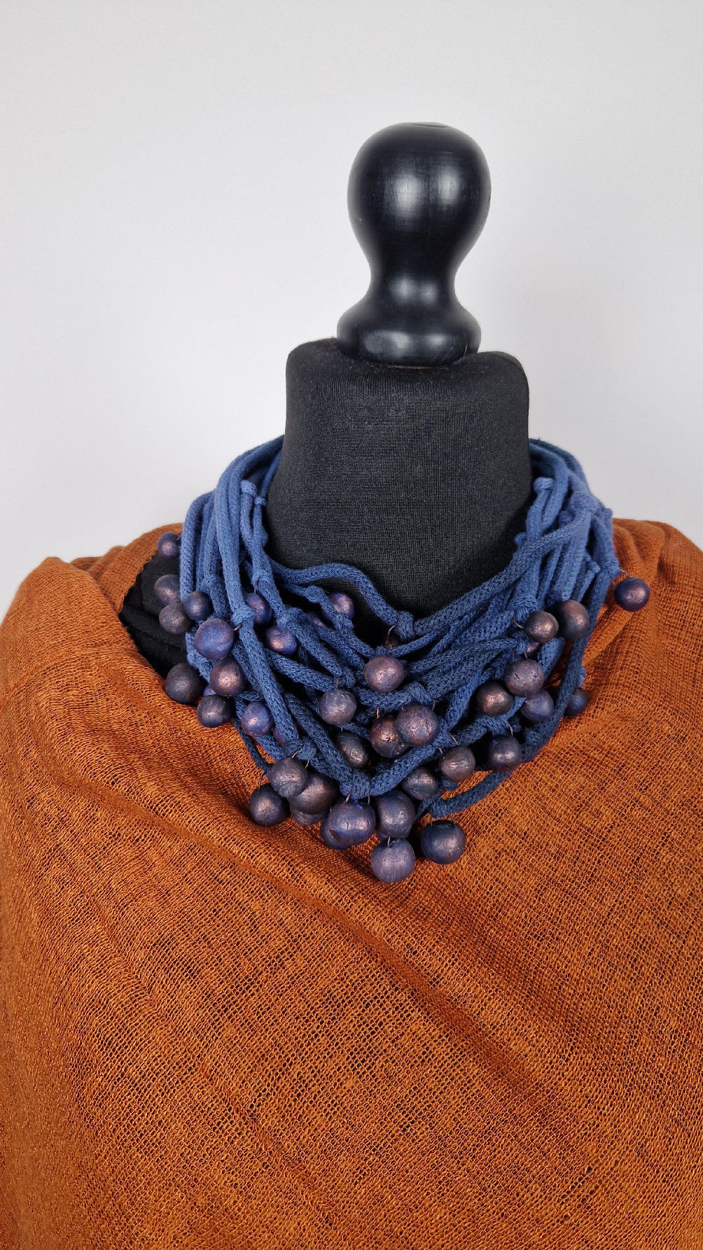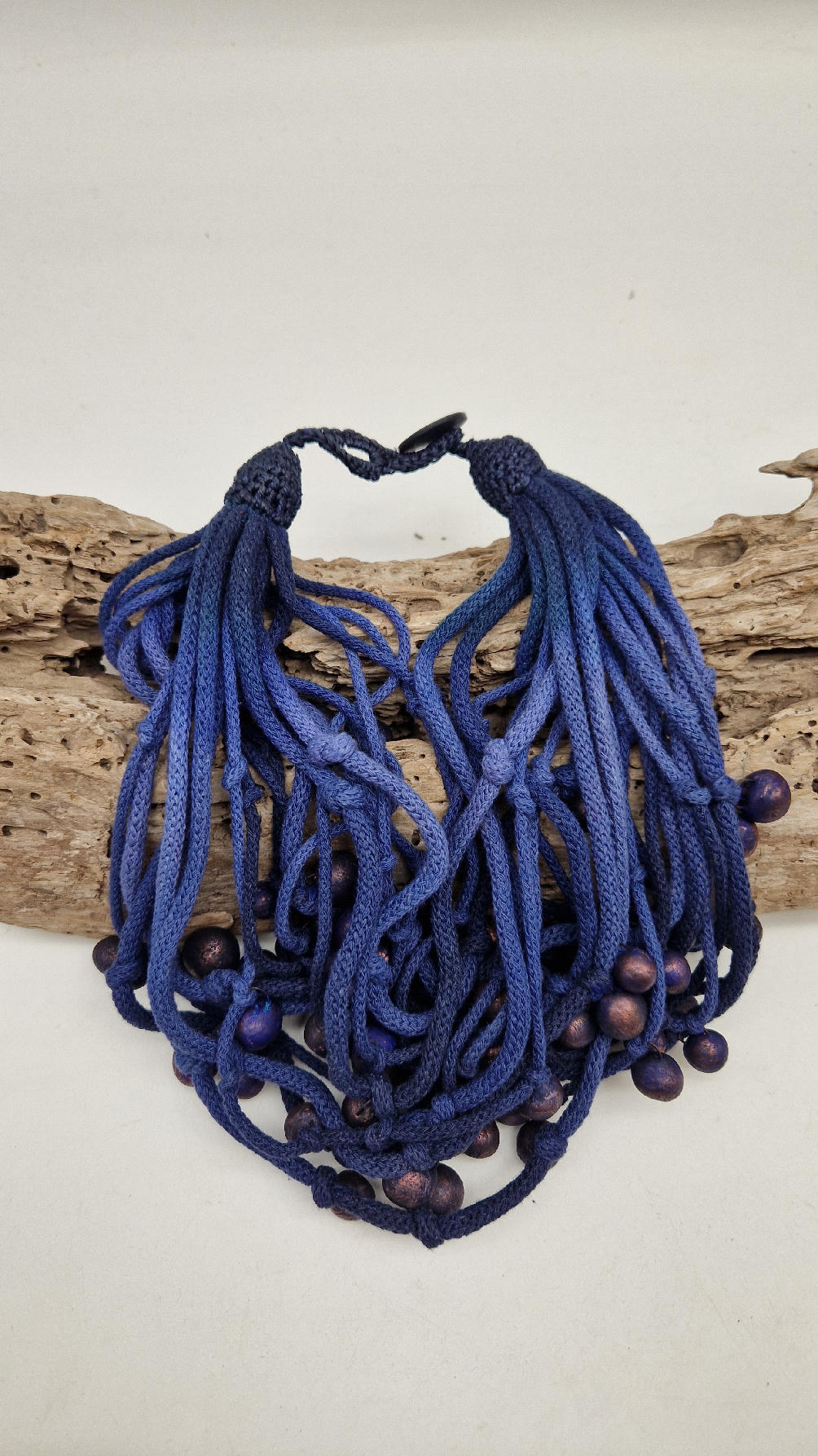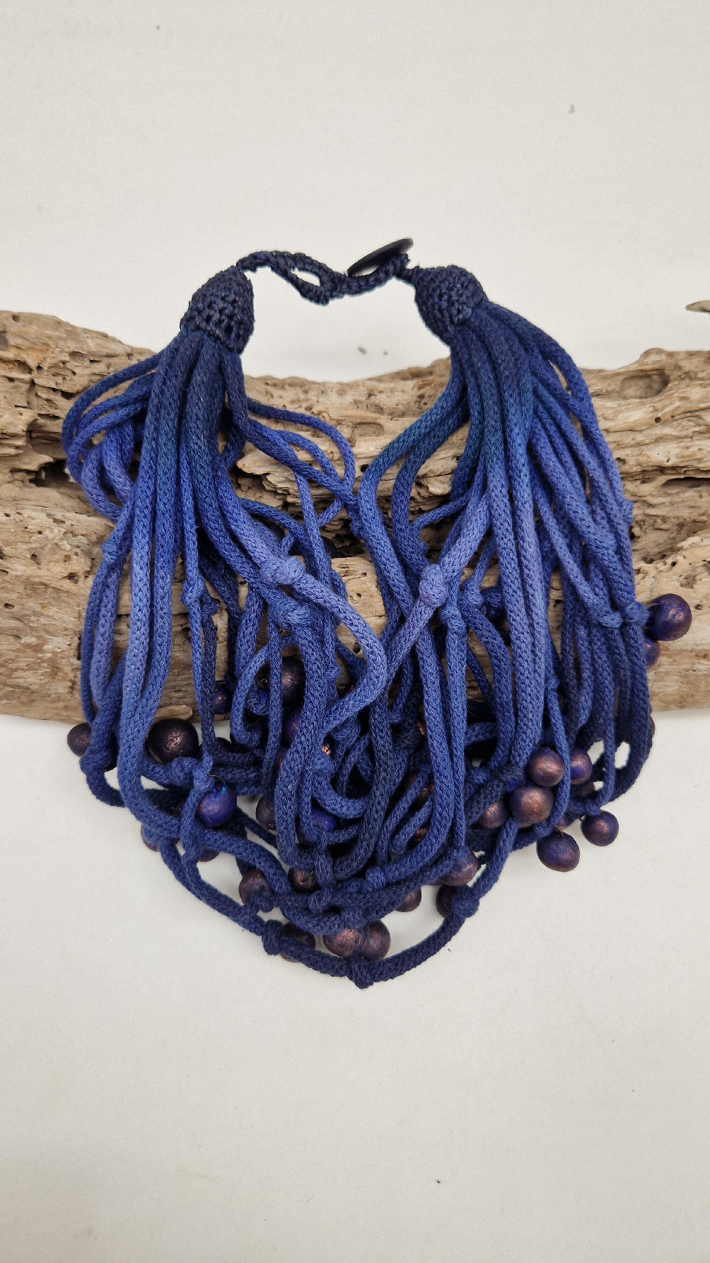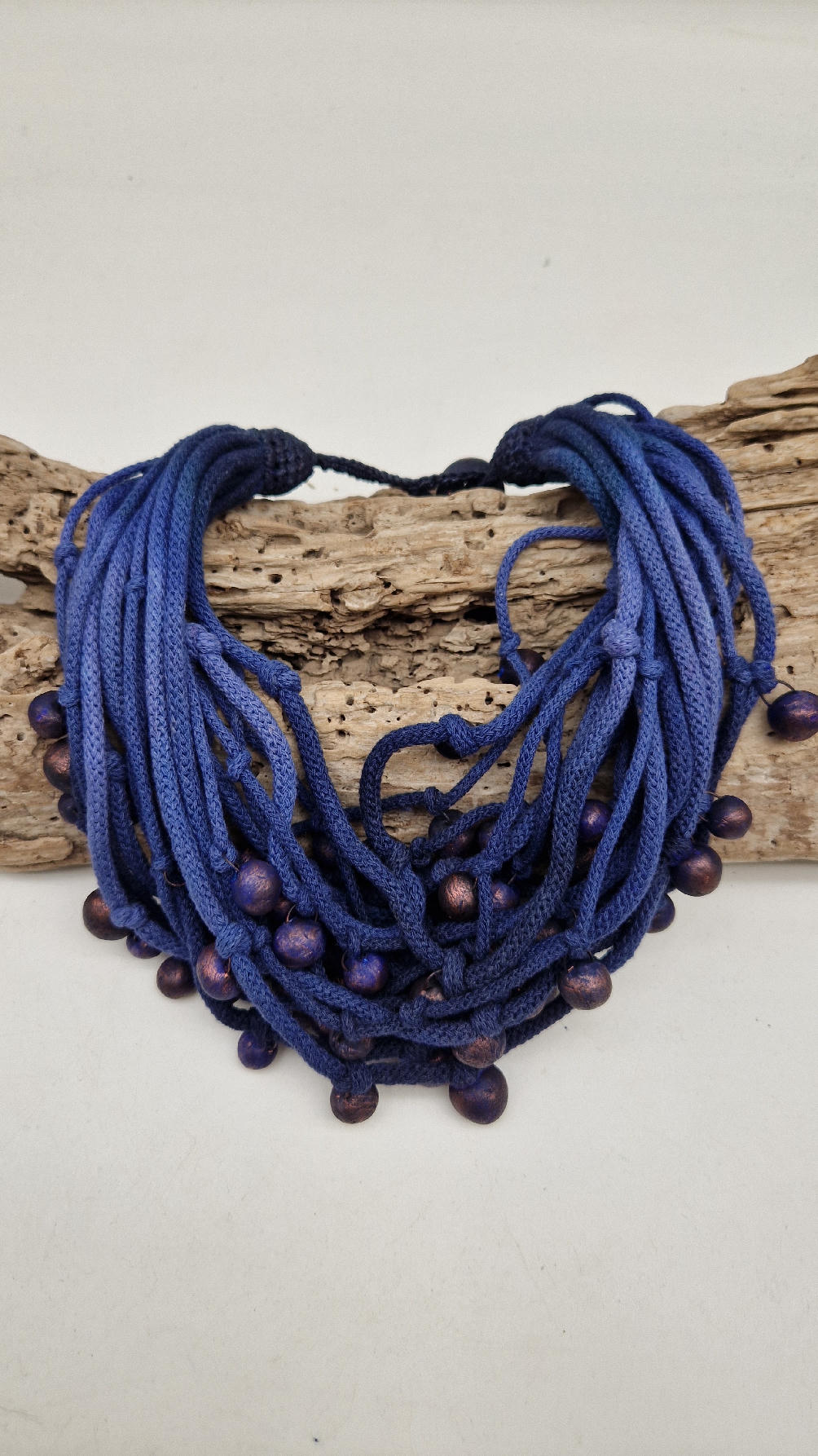 Kobaltowo- miedziano-jagodowy, energetyczny , przepiękny naszyjnik, wykonany z bawełnianych, ręcznie farbowanych sznurków ,.. Do tych bawełnianych sznurków zostały przymocowane dziesiątki uformowanych ręcznie, wypalonych i zabarwionych niemal magicznie koralików, kulek muśniętych miedzią