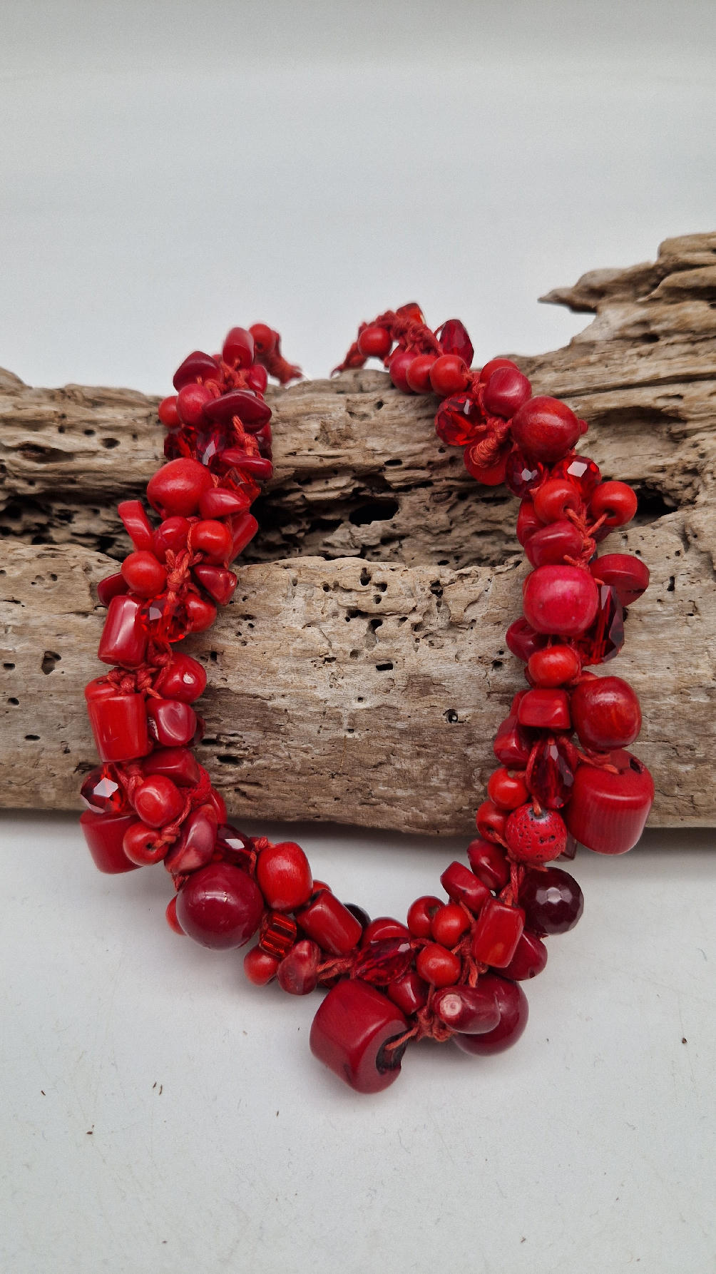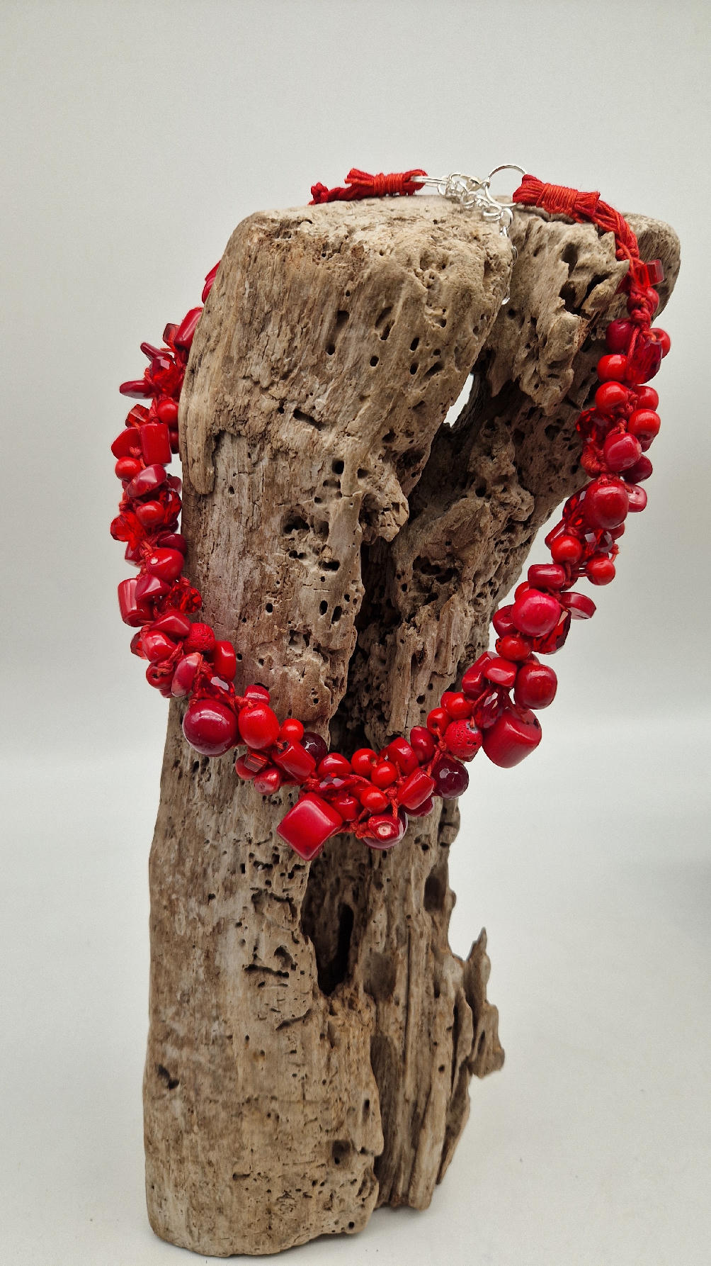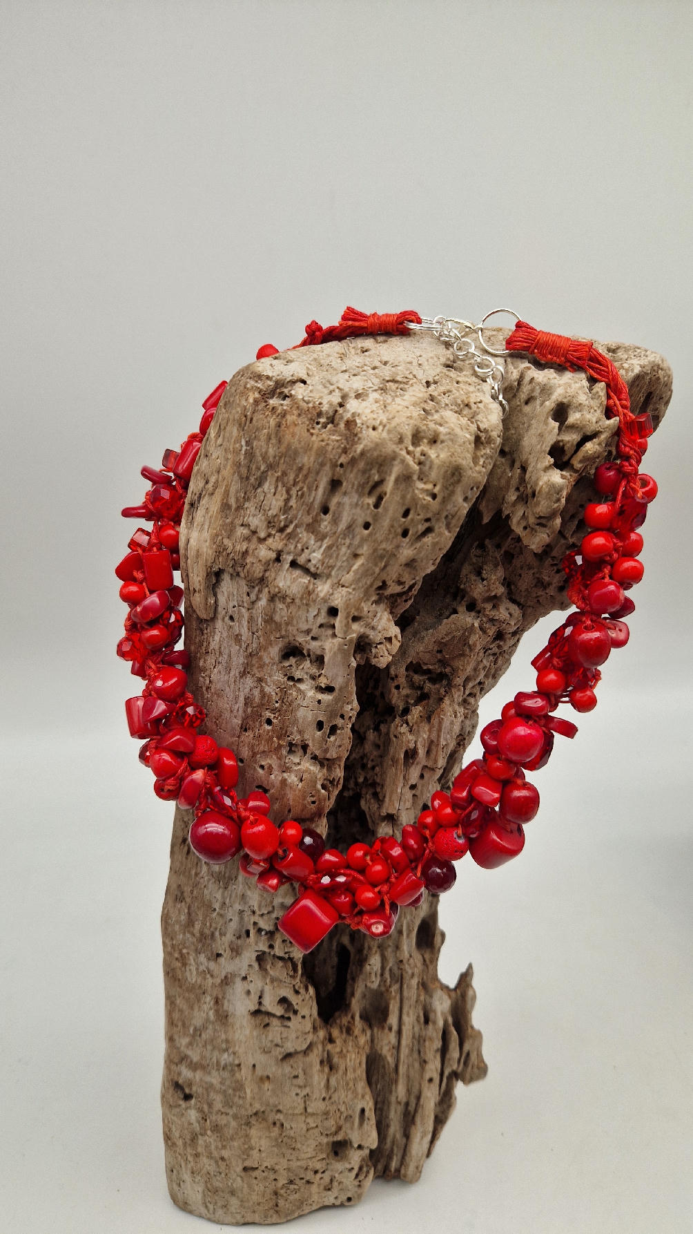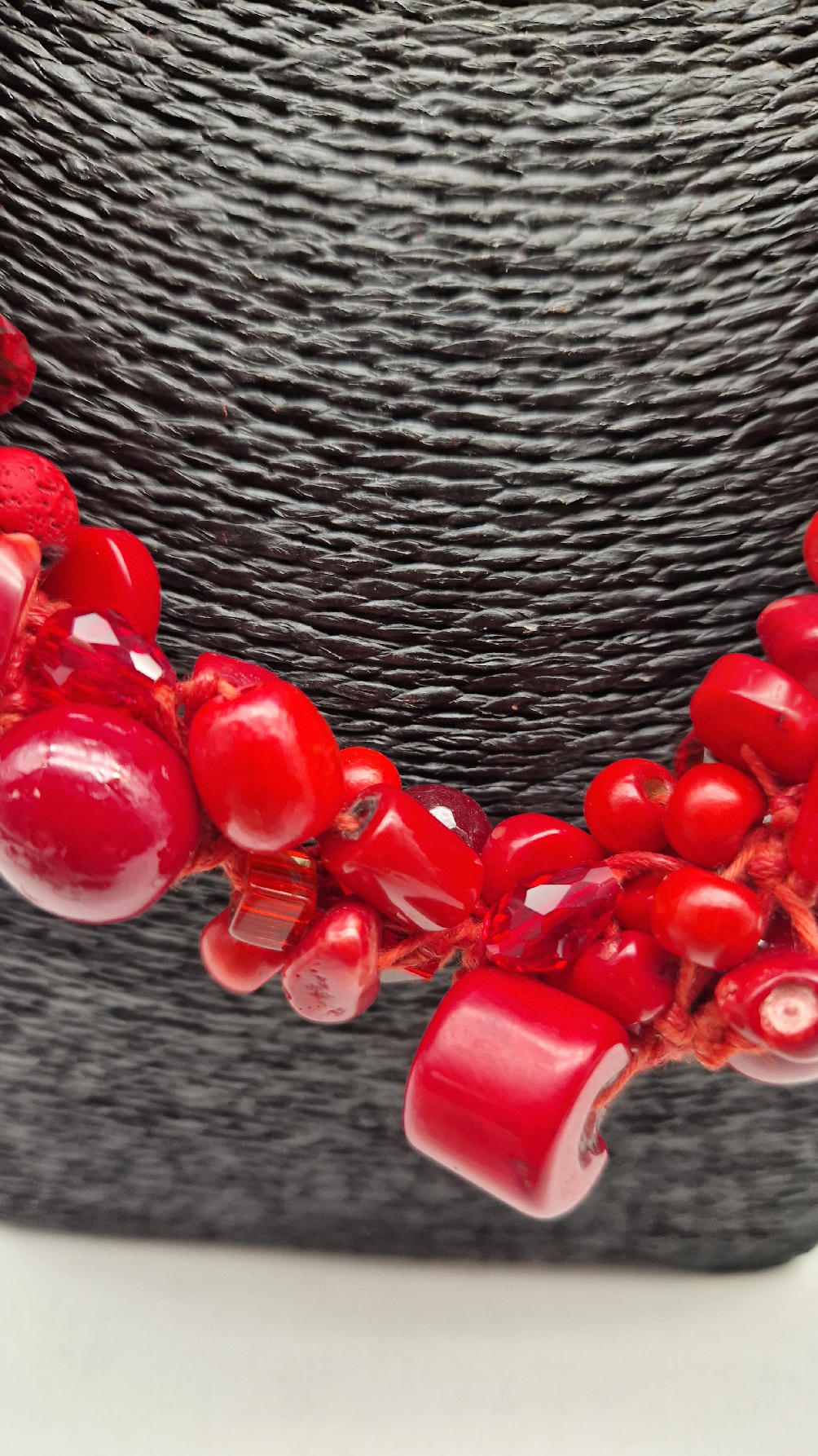 Elegancki, mega-czerwony naszyjnik zrobiony z korali o różnych kształtach, poplątanych artystycznie z bawełnianym czerwonym sznurkiem i gdzieniegdzie szklanymi koralikami, żeby było ciut blasku …taka czysta energia