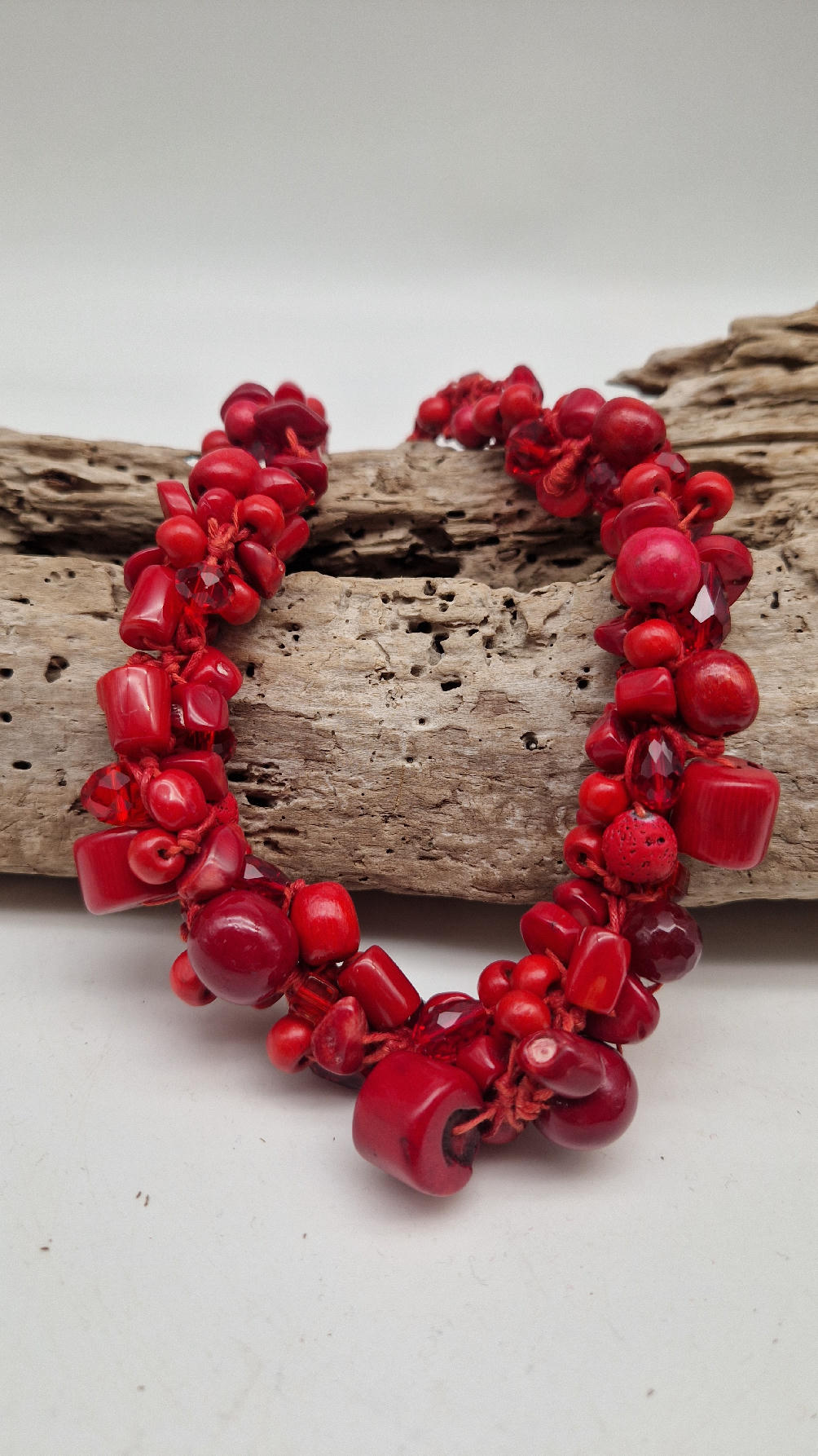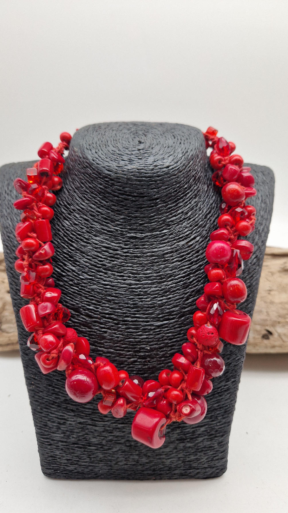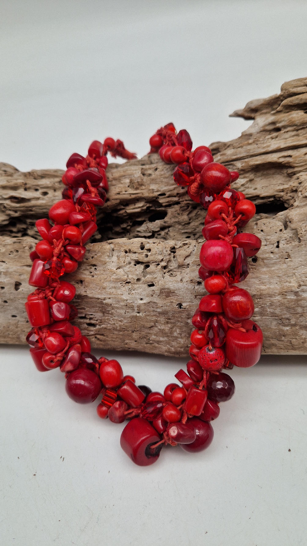 Elegancki, mega-czerwony naszyjnik zrobiony z korali o różnych kształtach, poplątanych artystycznie z bawełnianym czerwonym sznurkiem i gdzieniegdzie szklanymi koralikami, żeby było ciut blasku …taka czysta energia