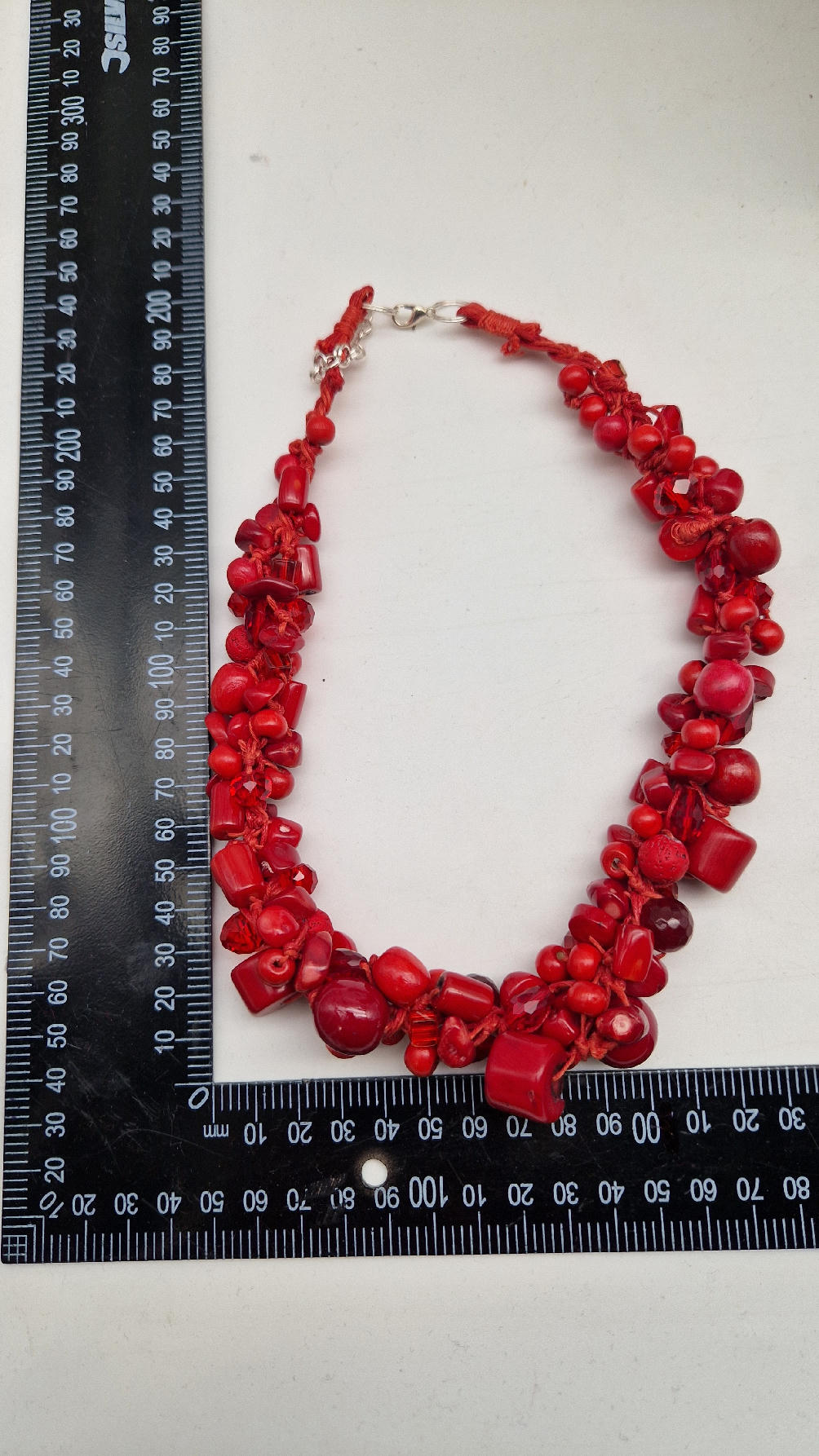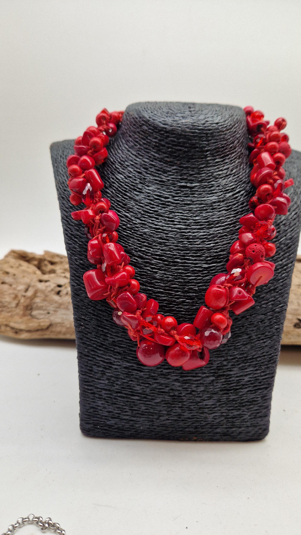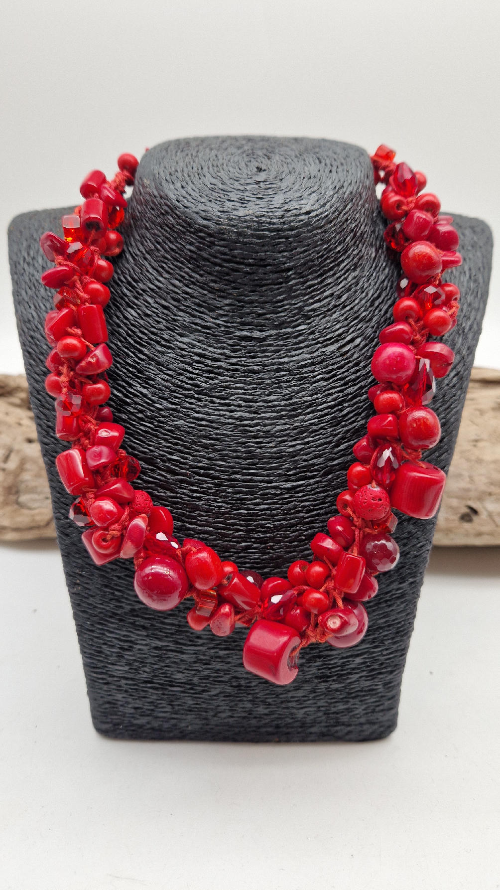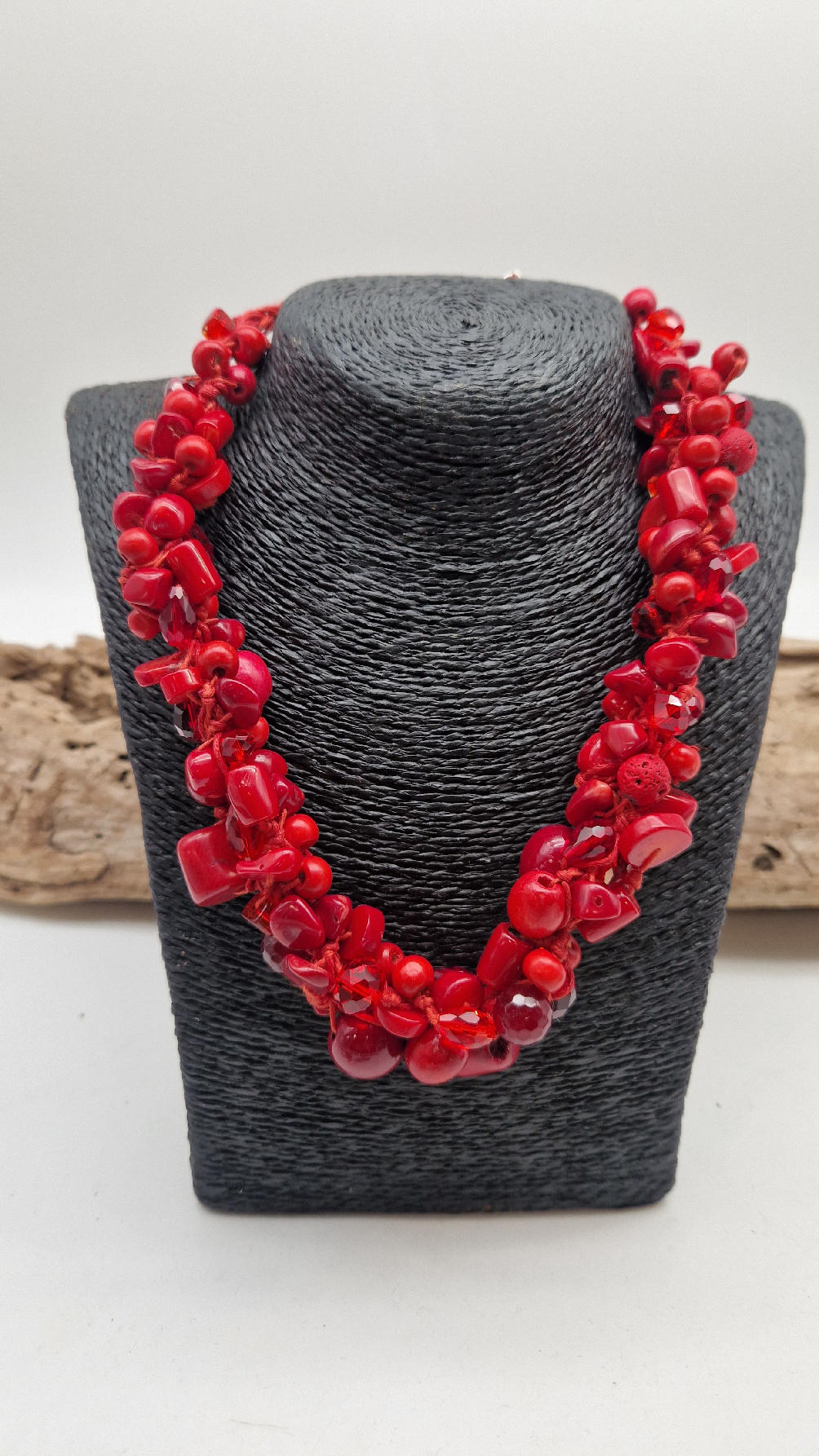 Elegancki, mega-czerwony naszyjnik zrobiony z korali o różnych kształtach, poplątanych artystycznie z bawełnianym czerwonym sznurkiem i gdzieniegdzie szklanymi koralikami, żeby było ciut blasku …taka czysta energia