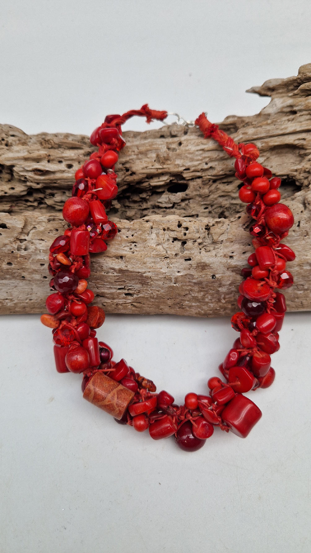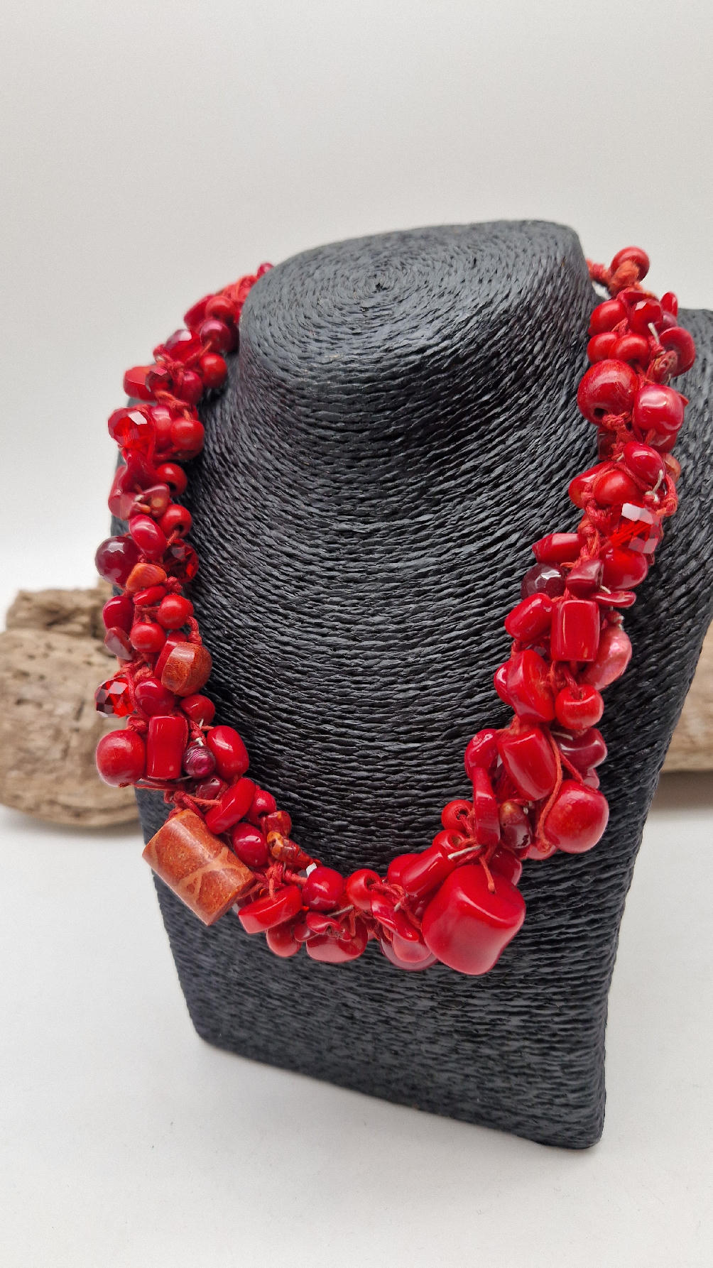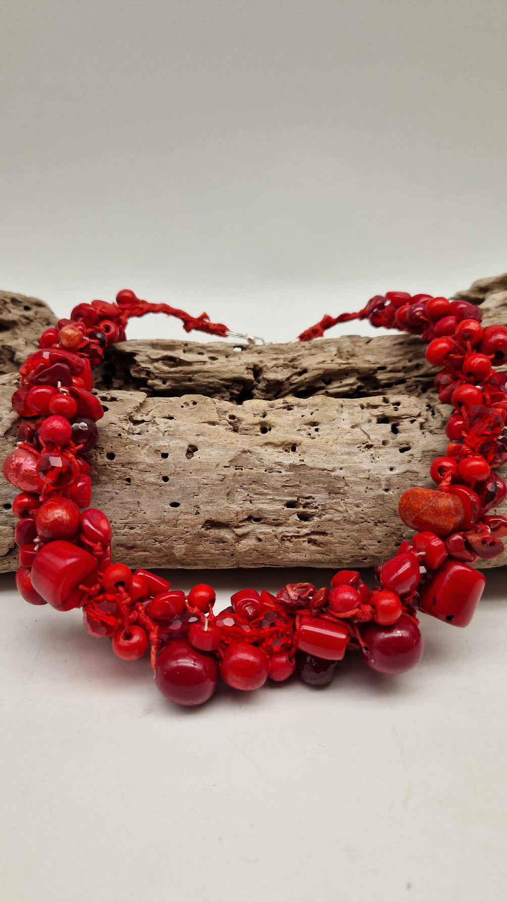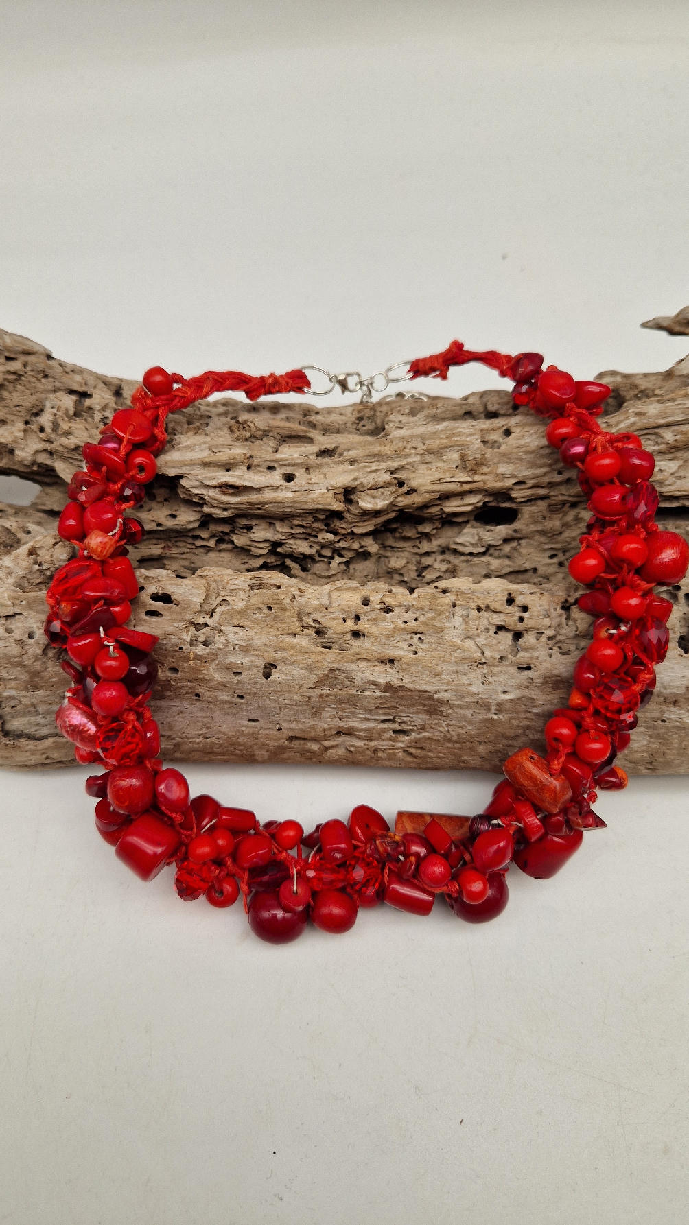 Elegancki, mega-czerwony naszyjnik zrobiony z korali o różnych kształtach, poplątanych artystycznie z bawełnianym czerwonym sznurkiem i gdzieniegdzie szklanymi koralikami, żeby było ciut blasku …taka czysta energia
