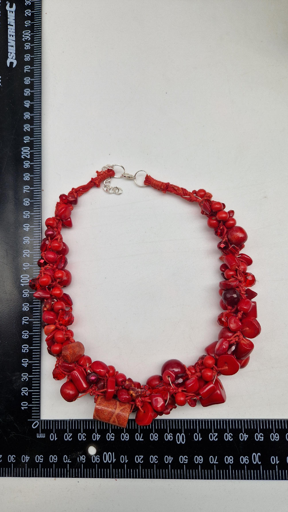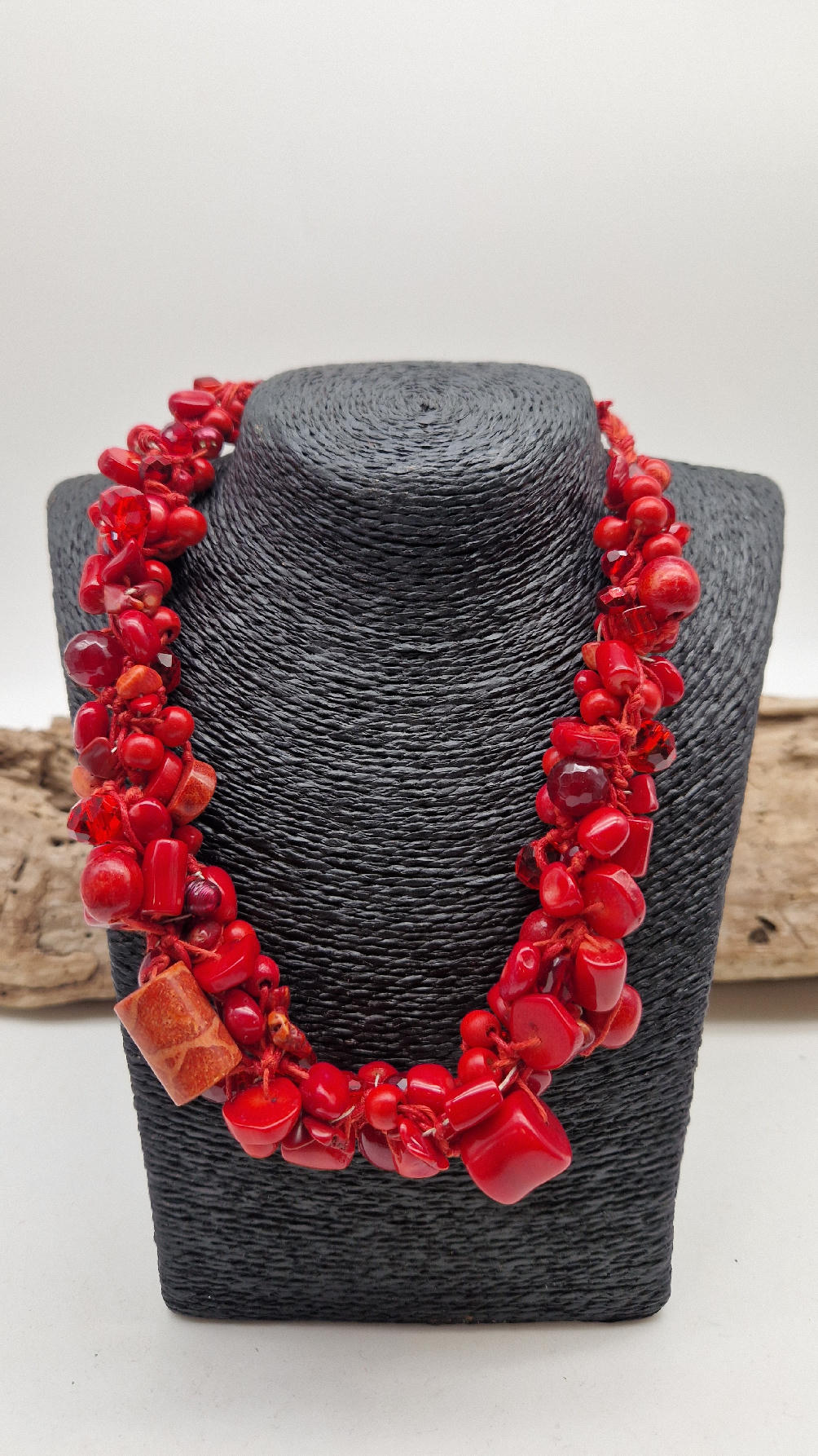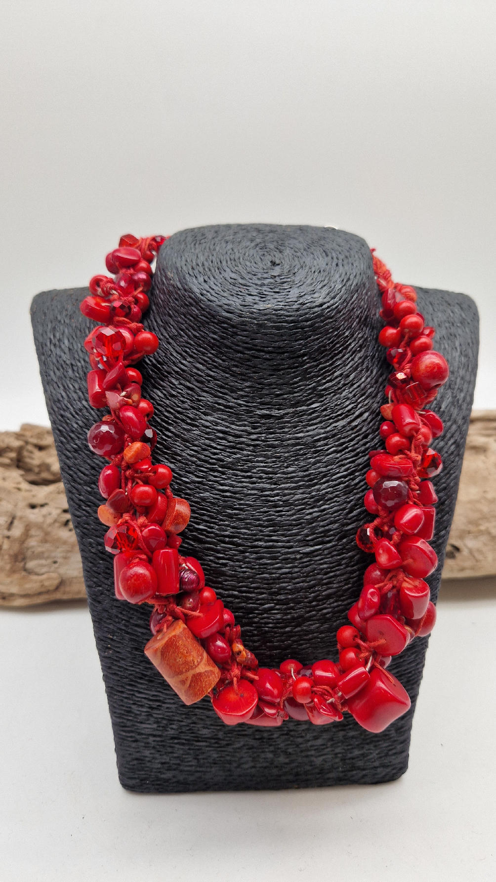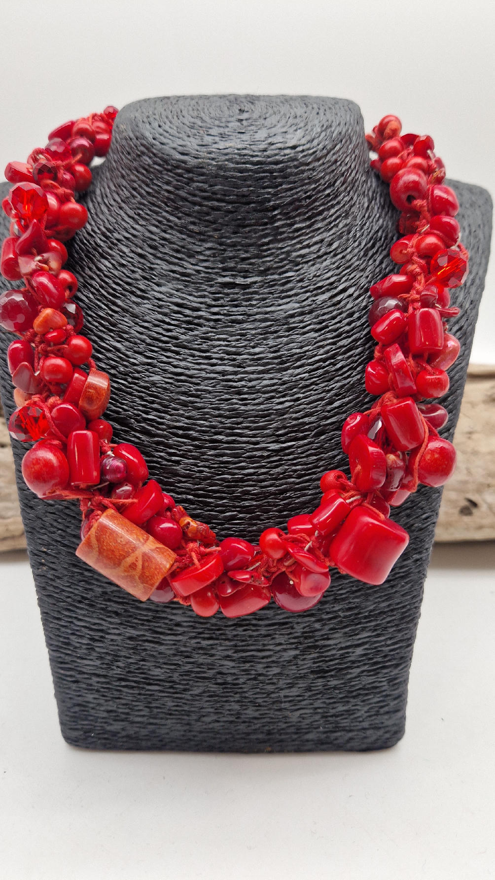 Elegancki, mega-czerwony naszyjnik zrobiony z korali o różnych kształtach, poplątanych artystycznie z bawełnianym czerwonym sznurkiem i gdzieniegdzie szklanymi koralikami, żeby było ciut blasku …taka czysta energia