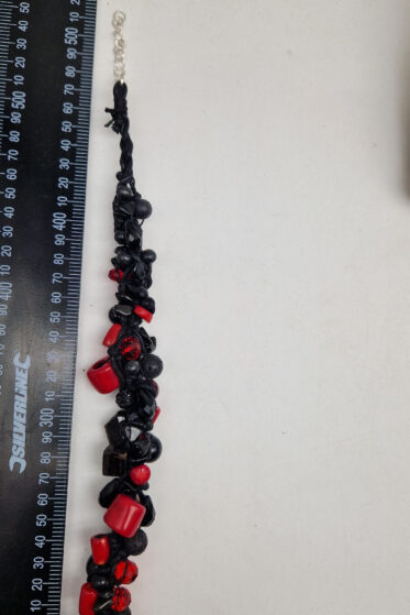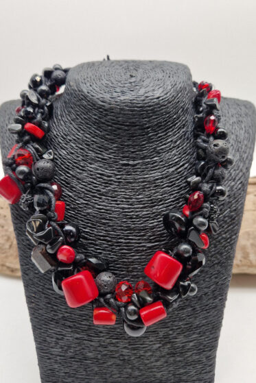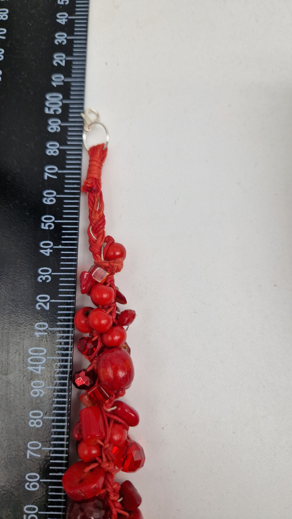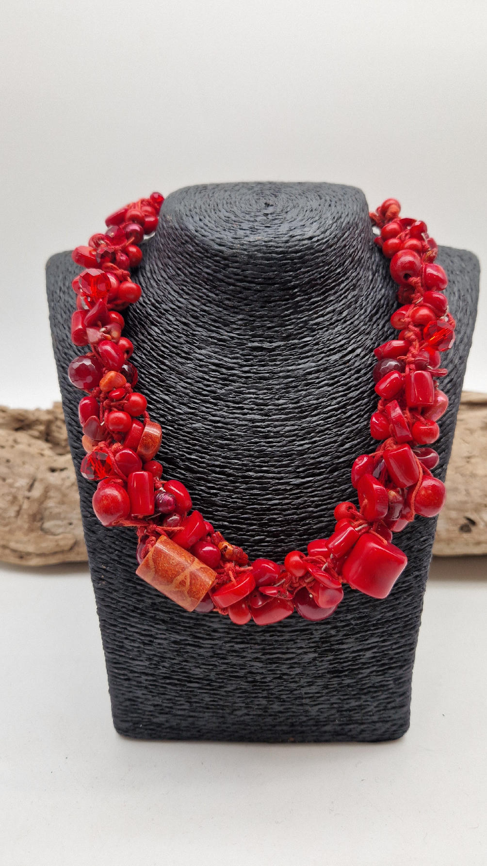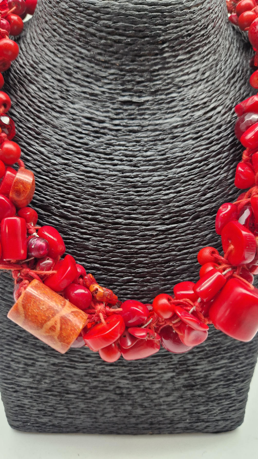 Elegancki, mega-czerwony naszyjnik zrobiony z korali o różnych kształtach, poplątanych artystycznie z bawełnianym czerwonym sznurkiem i gdzieniegdzie szklanymi koralikami, żeby było ciut blasku …taka czysta energia