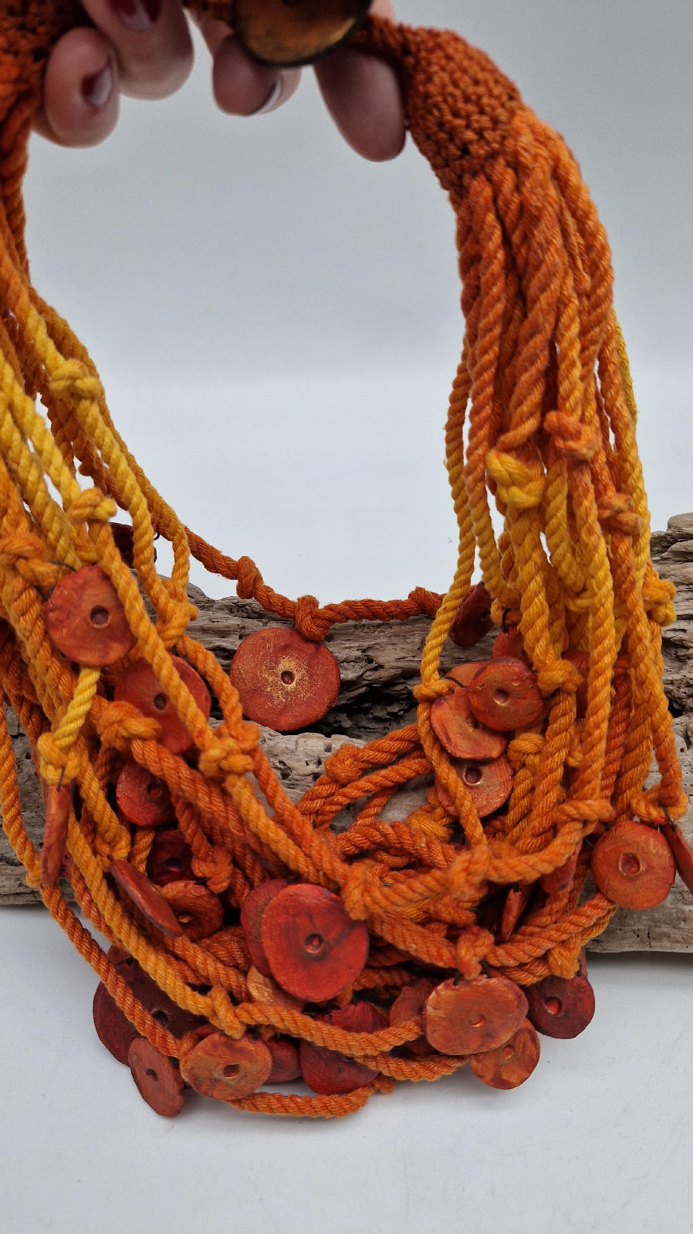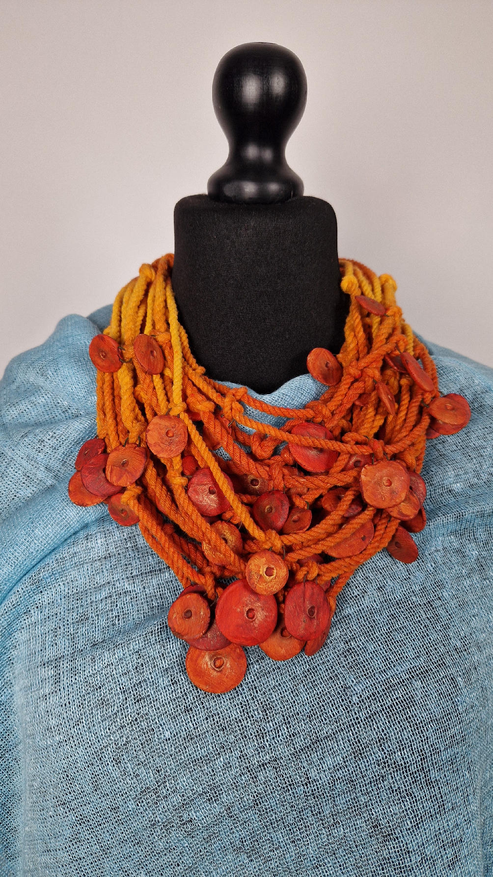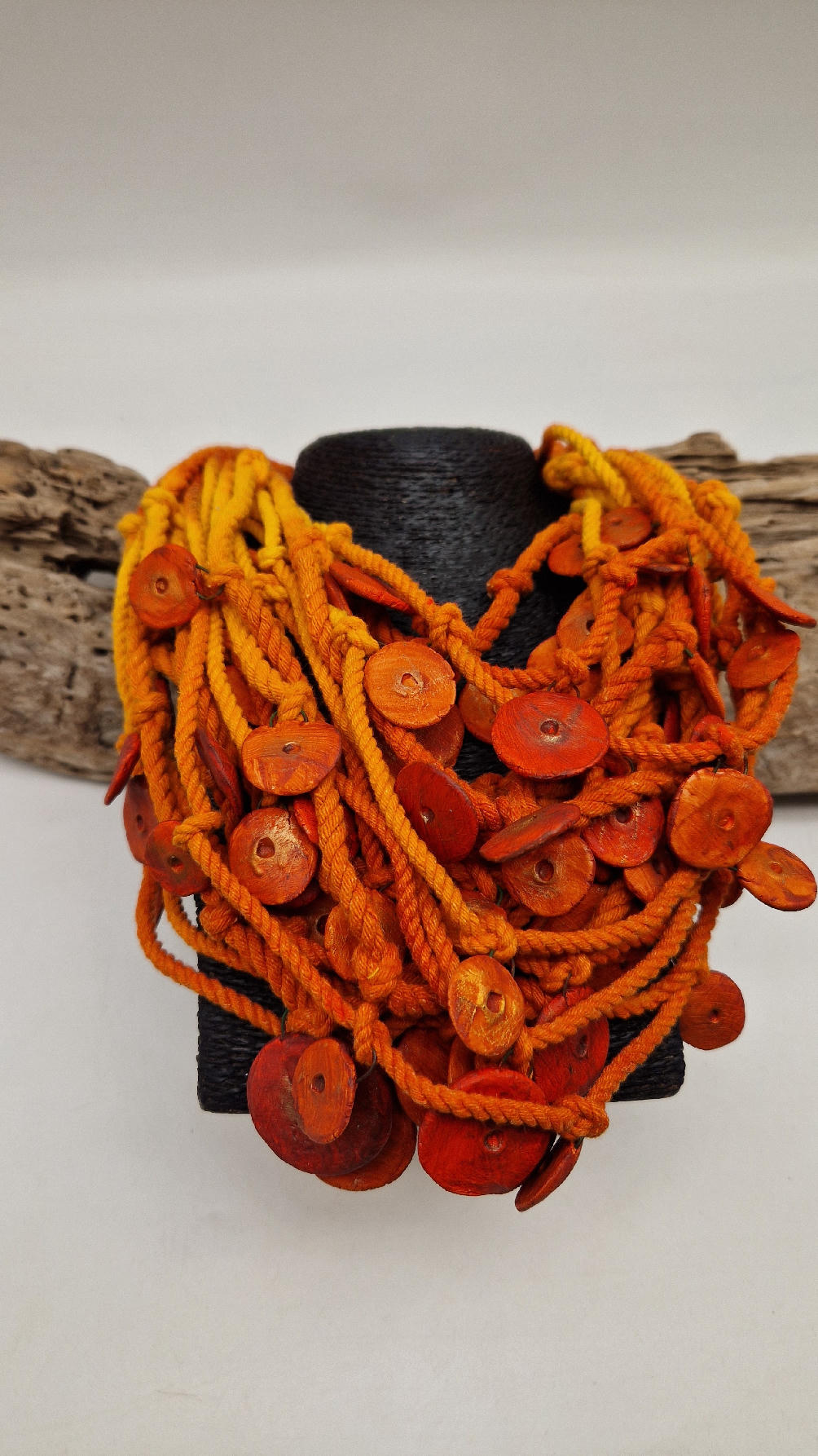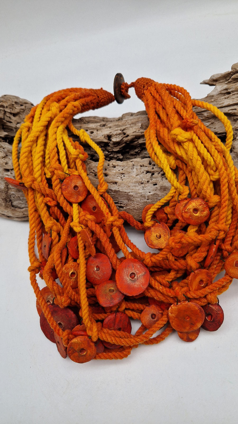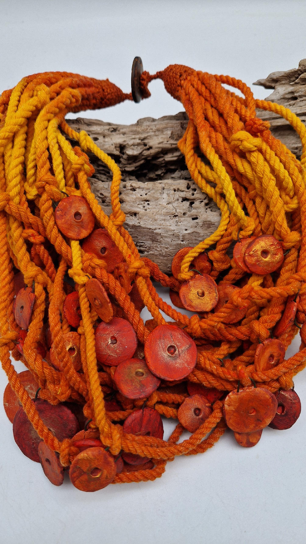 Gorący , energetyczny , przepiękny naszyjnik, wykonany z bawełnianych, ręcznie farbowanych sznurków , w kolorach ognia, zachodu słońca nad morzem, pomarańczy… Do tych bawełnianych sznurków zostały przymocowane dziesiątki uformowanych ręcznie, wypalonych i zabarwionych niemal magicznie koralików.