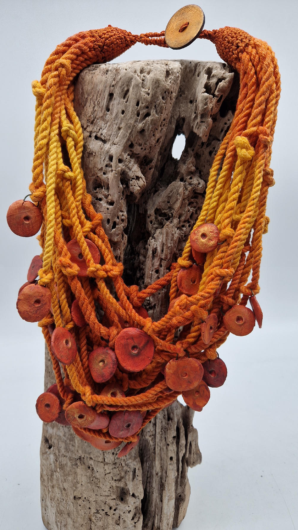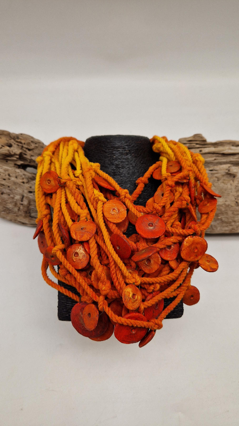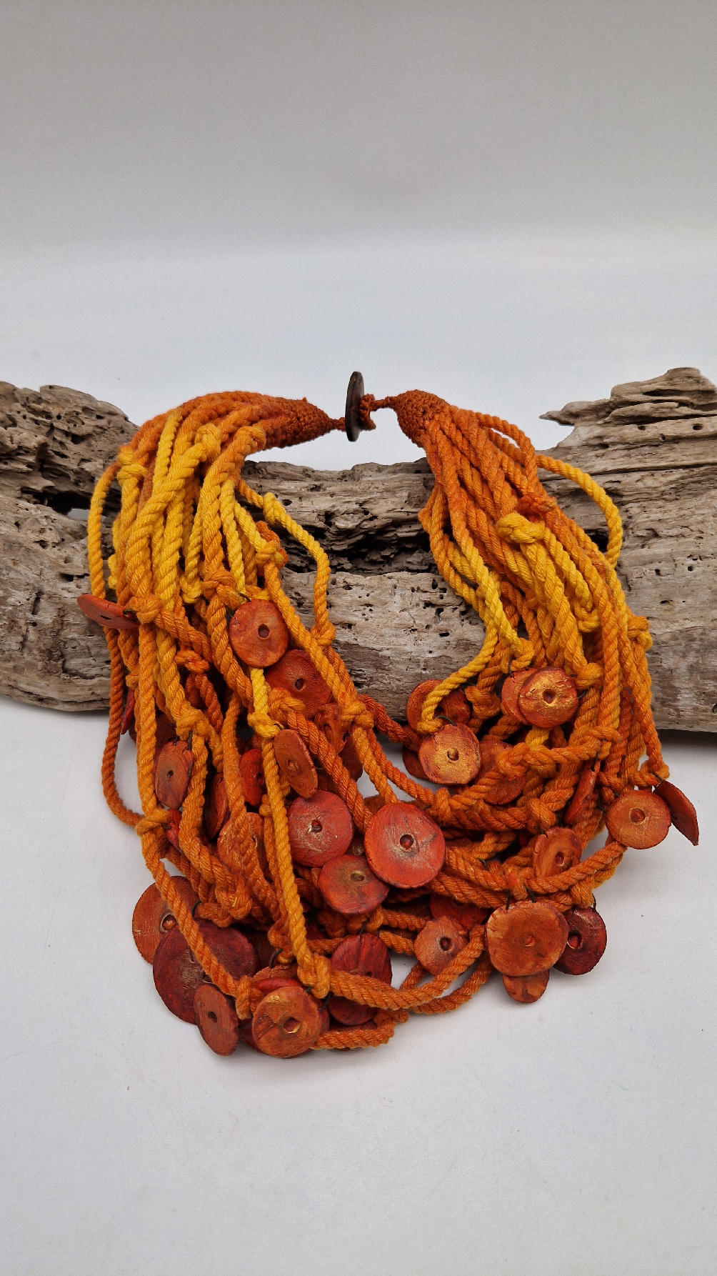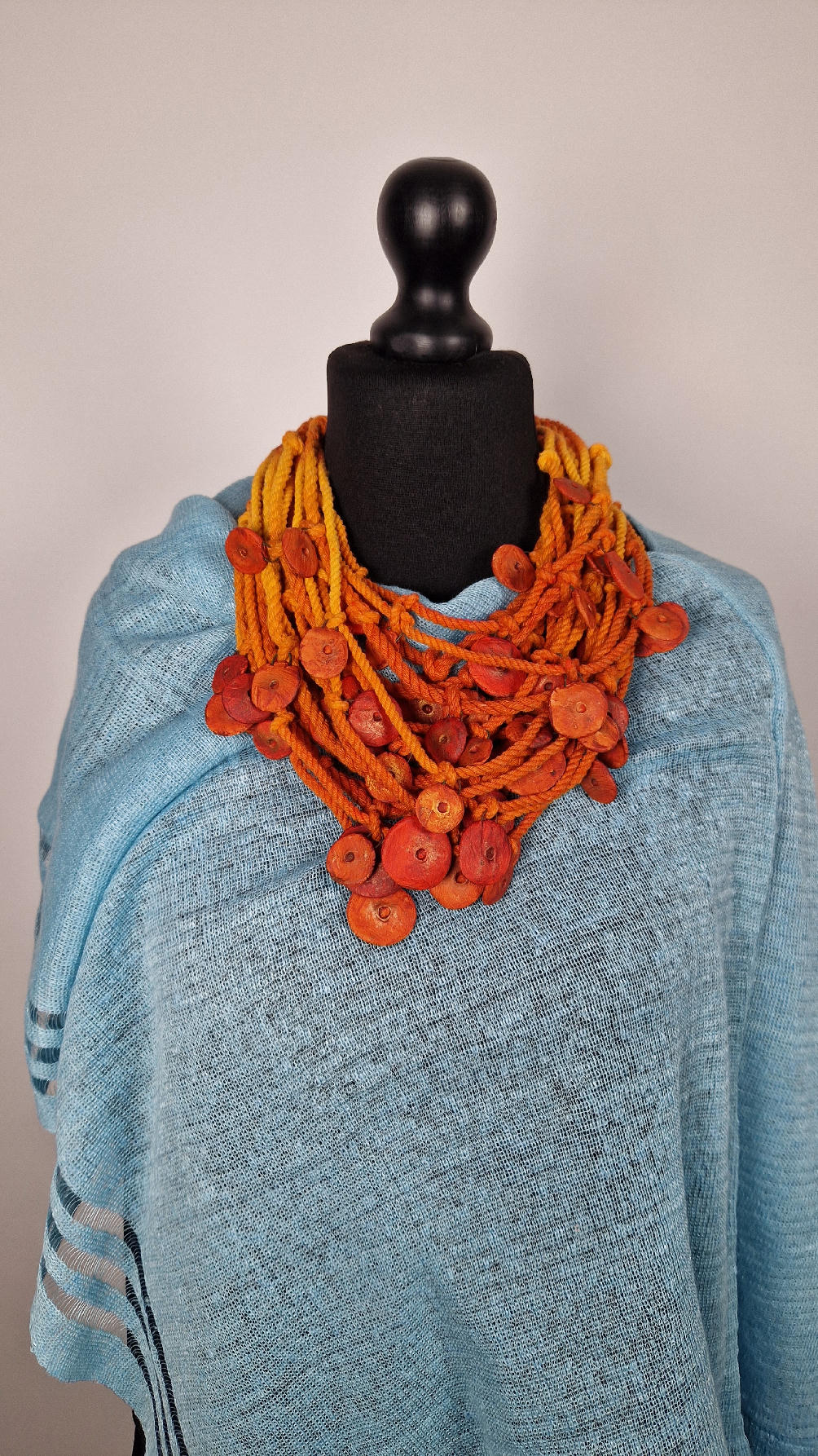 Gorący , energetyczny , przepiękny naszyjnik, wykonany z bawełnianych, ręcznie farbowanych sznurków , w kolorach ognia, zachodu słońca nad morzem, pomarańczy… Do tych bawełnianych sznurków zostały przymocowane dziesiątki uformowanych ręcznie, wypalonych i zabarwionych niemal magicznie koralików.