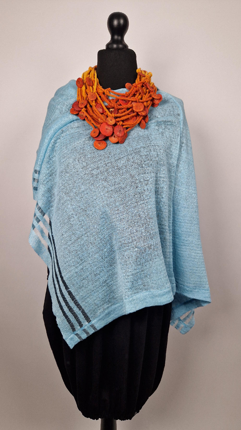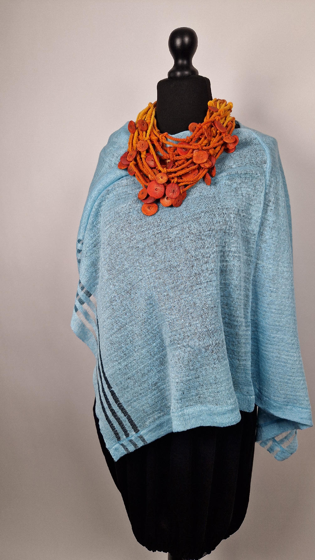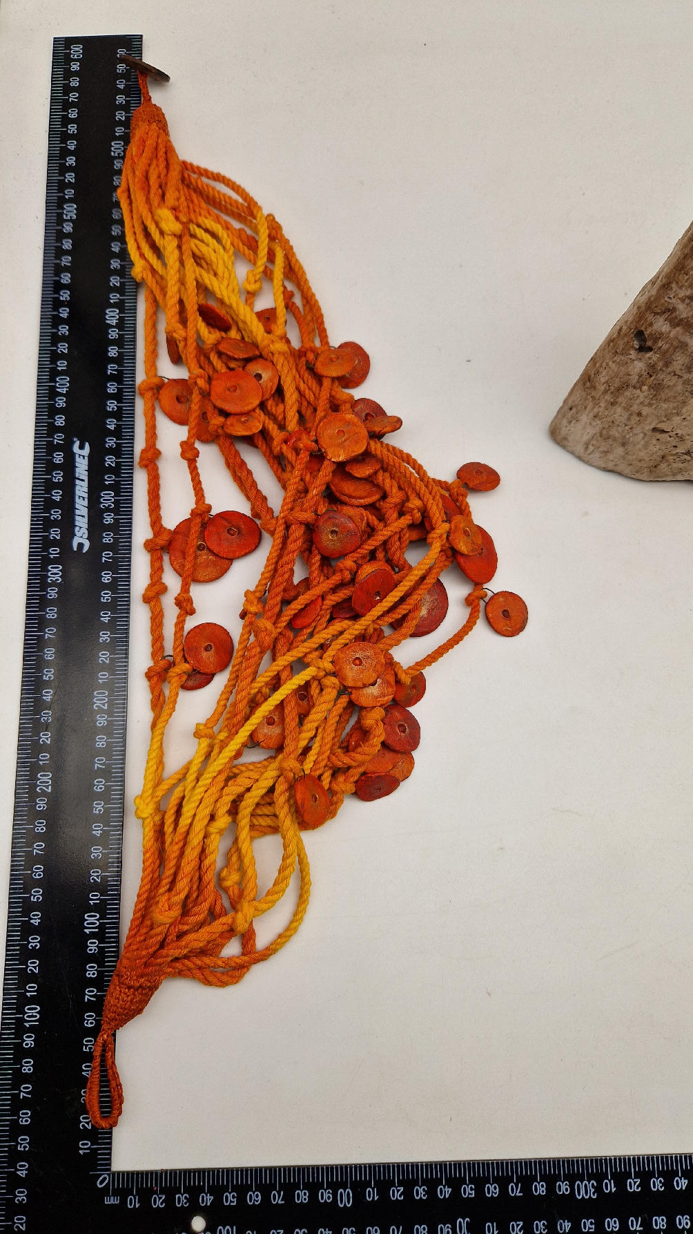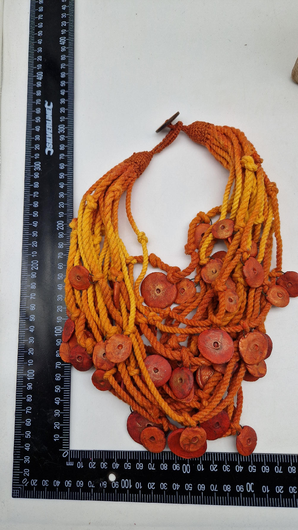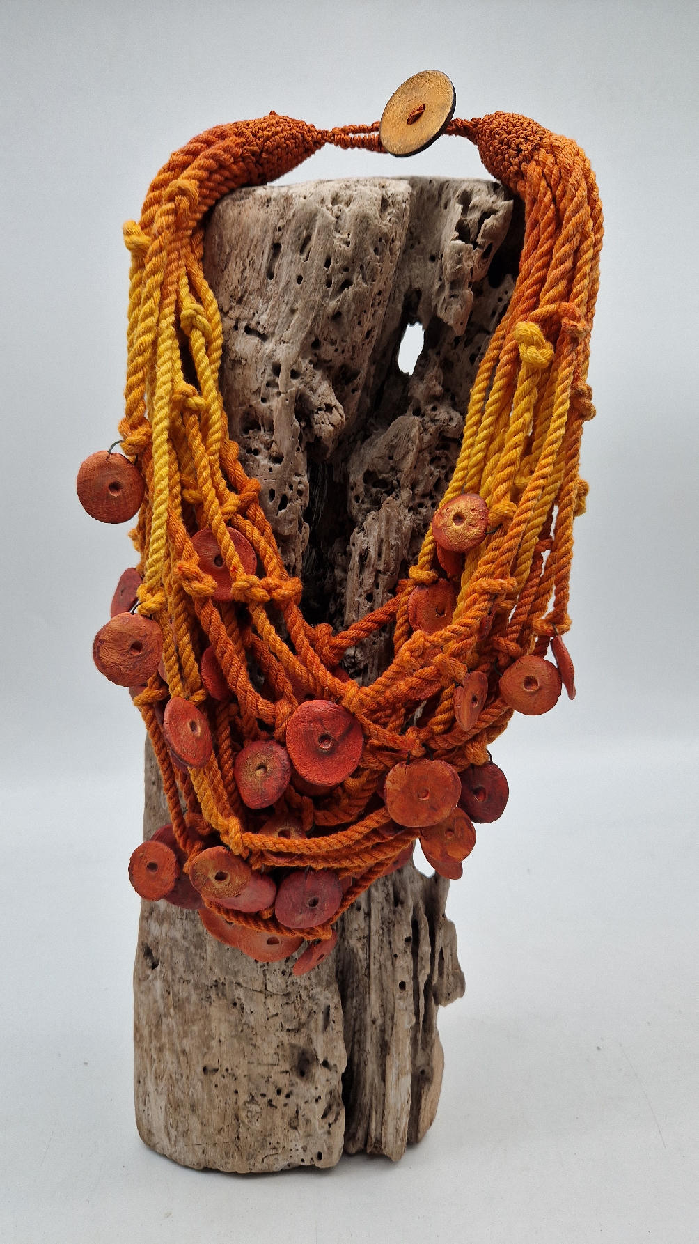 Gorący , energetyczny , przepiękny naszyjnik, wykonany z bawełnianych, ręcznie farbowanych sznurków , w kolorach ognia, zachodu słońca nad morzem, pomarańczy… Do tych bawełnianych sznurków zostały przymocowane dziesiątki uformowanych ręcznie, wypalonych i zabarwionych niemal magicznie koralików.