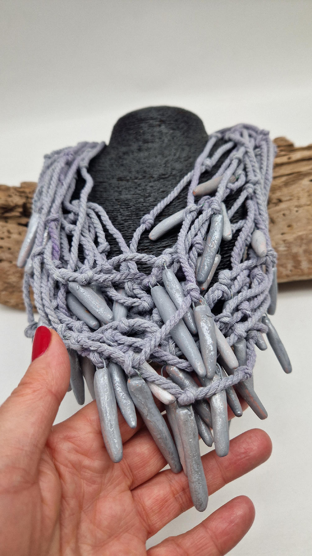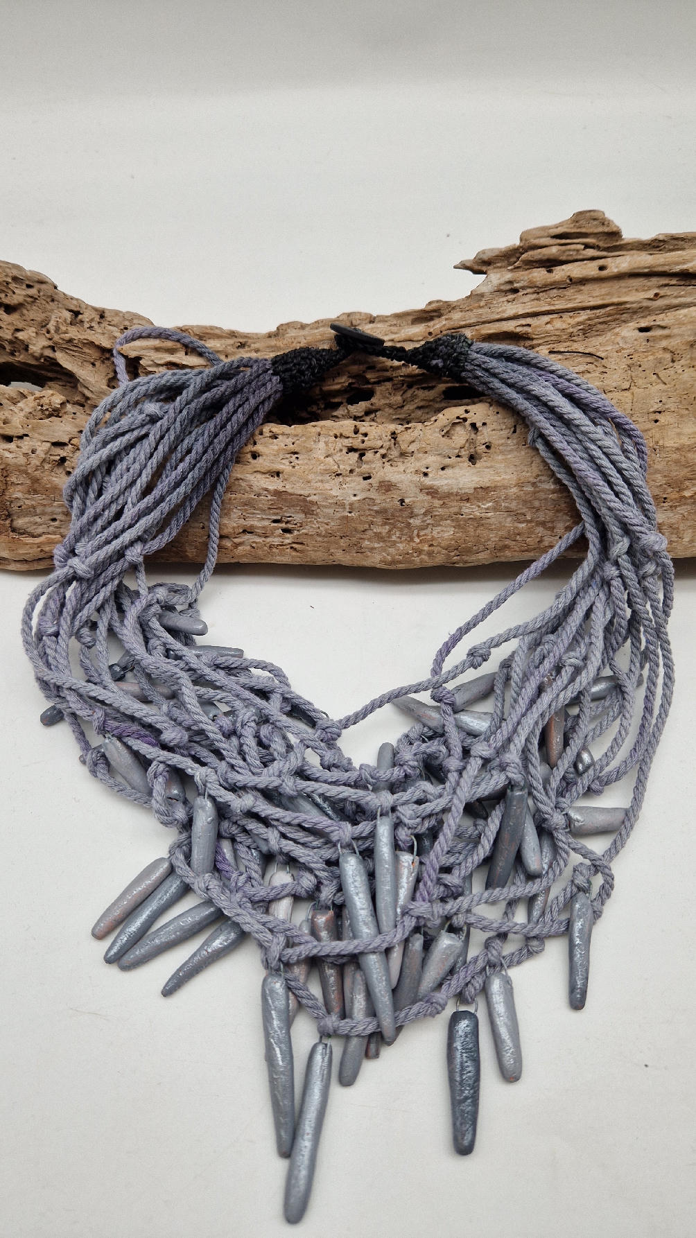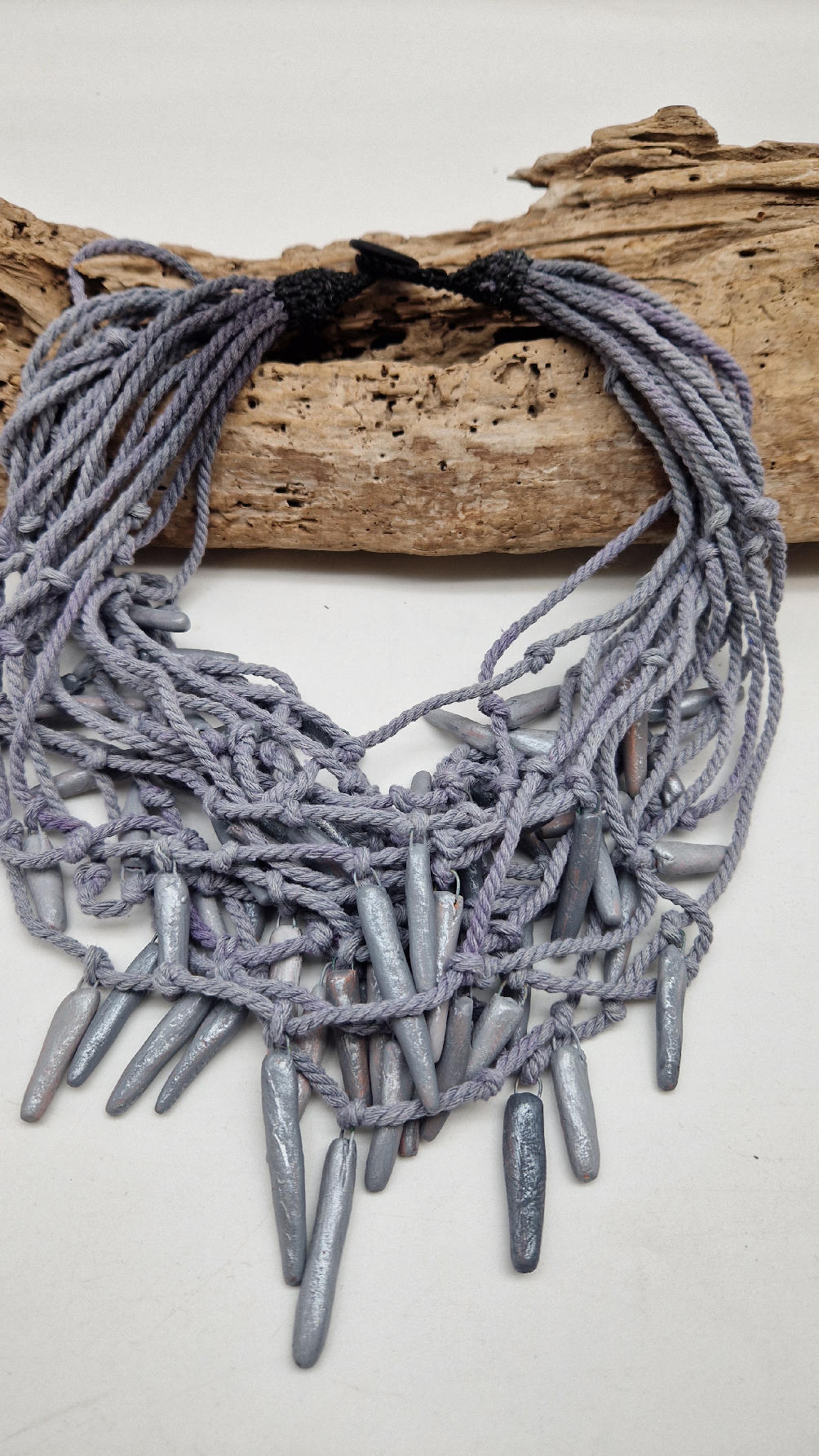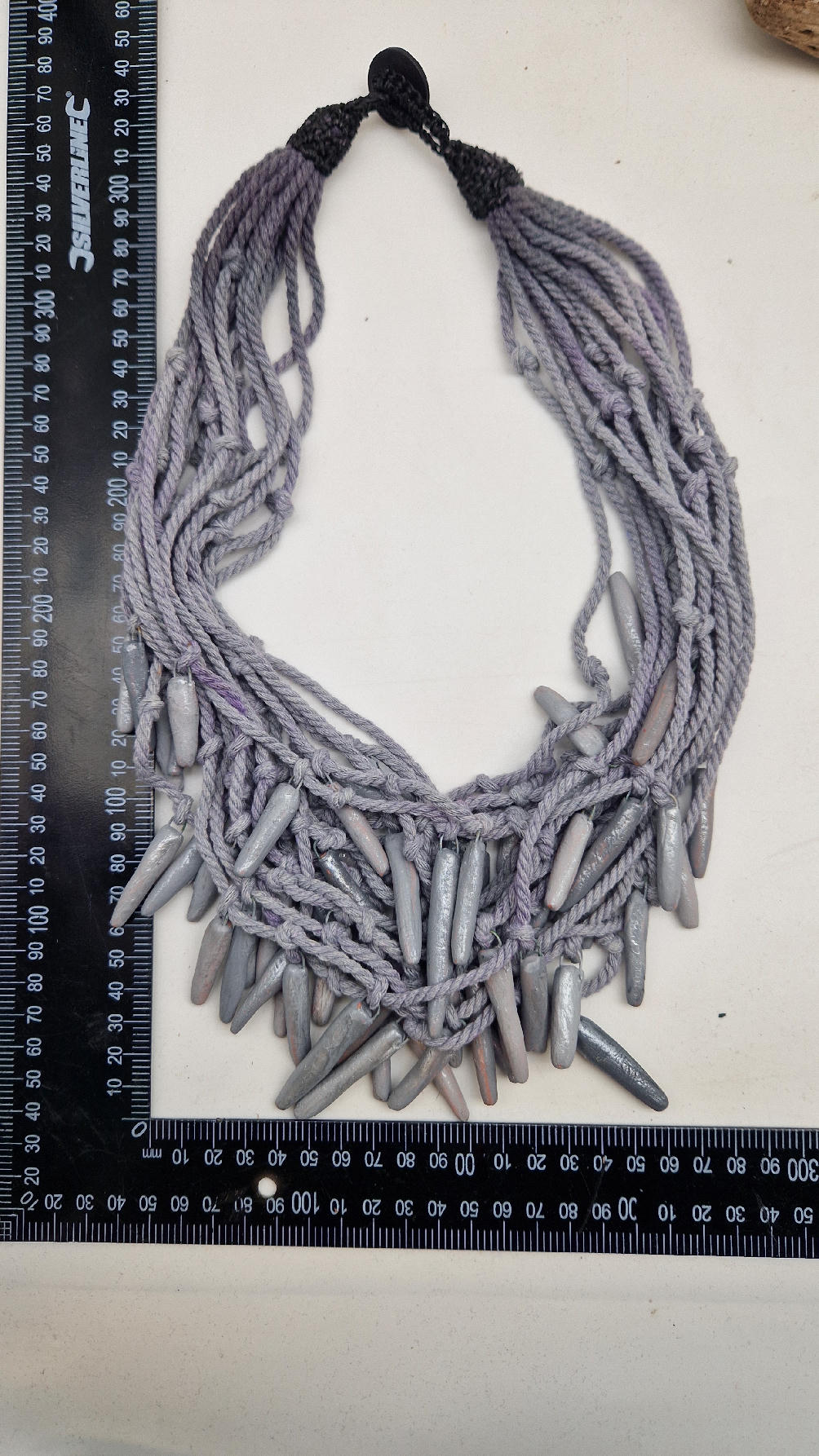 Naszyjnik zrobiony z bawełnianego, ręcznie farbowanego sznurka i ułożonych w misterną kompozycję ceramicznych , podłużnych , jak sople koralików, które również są uformowane ręcznie, następnie wypalone, pomalowane i przymocowane do sznurków, które tworzą przestrzenny naszyjnik. mnóstwo pracy, miłości i wyobraźni w jednym DZIELE. Kocham ten naszyjnik, cudownie zdobi nawet najprostszy T-shirt, a do czarnej sukienki jest po prostu idealny.( idealnie układa się na dekolcie mojej sukienki)