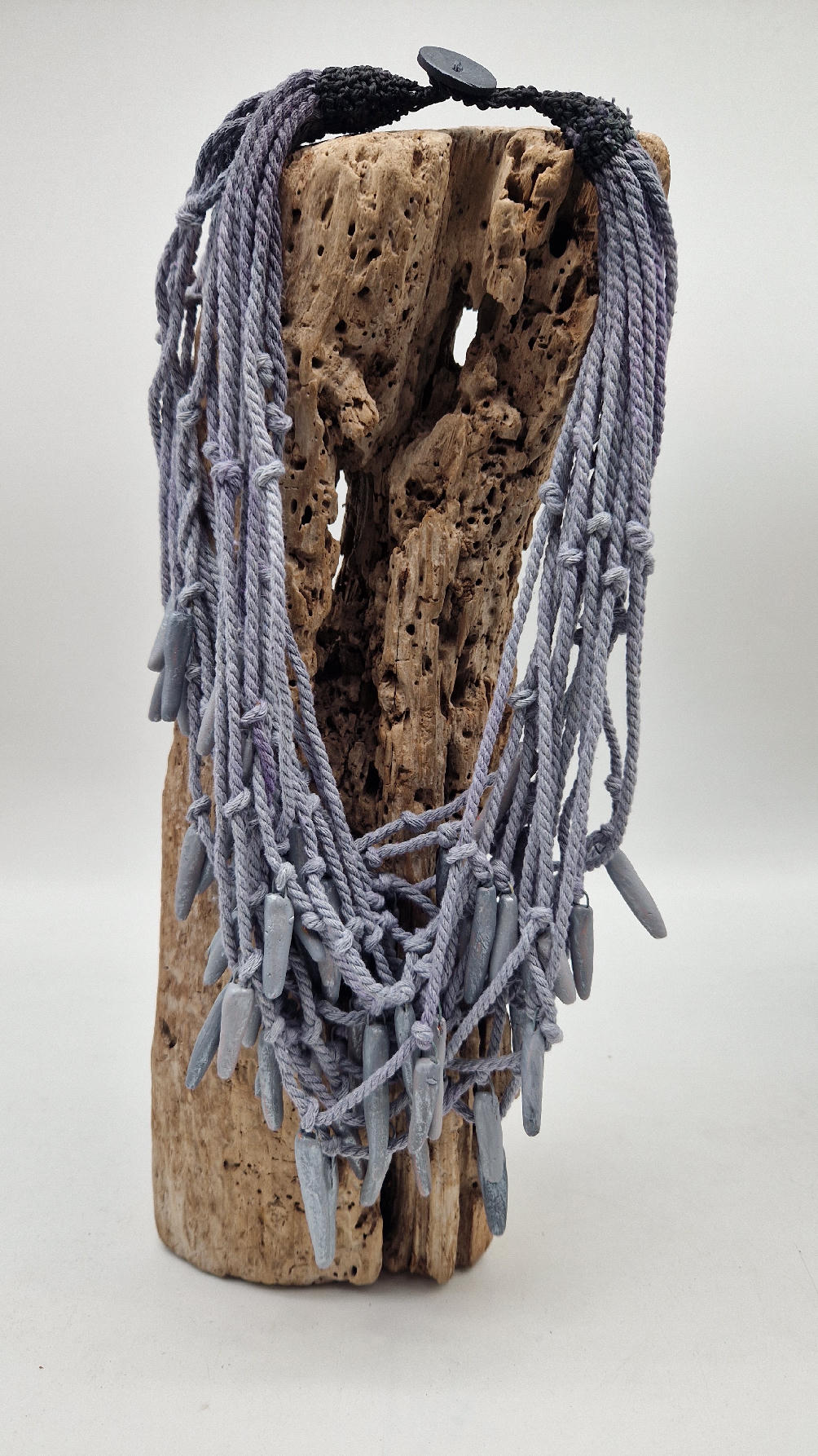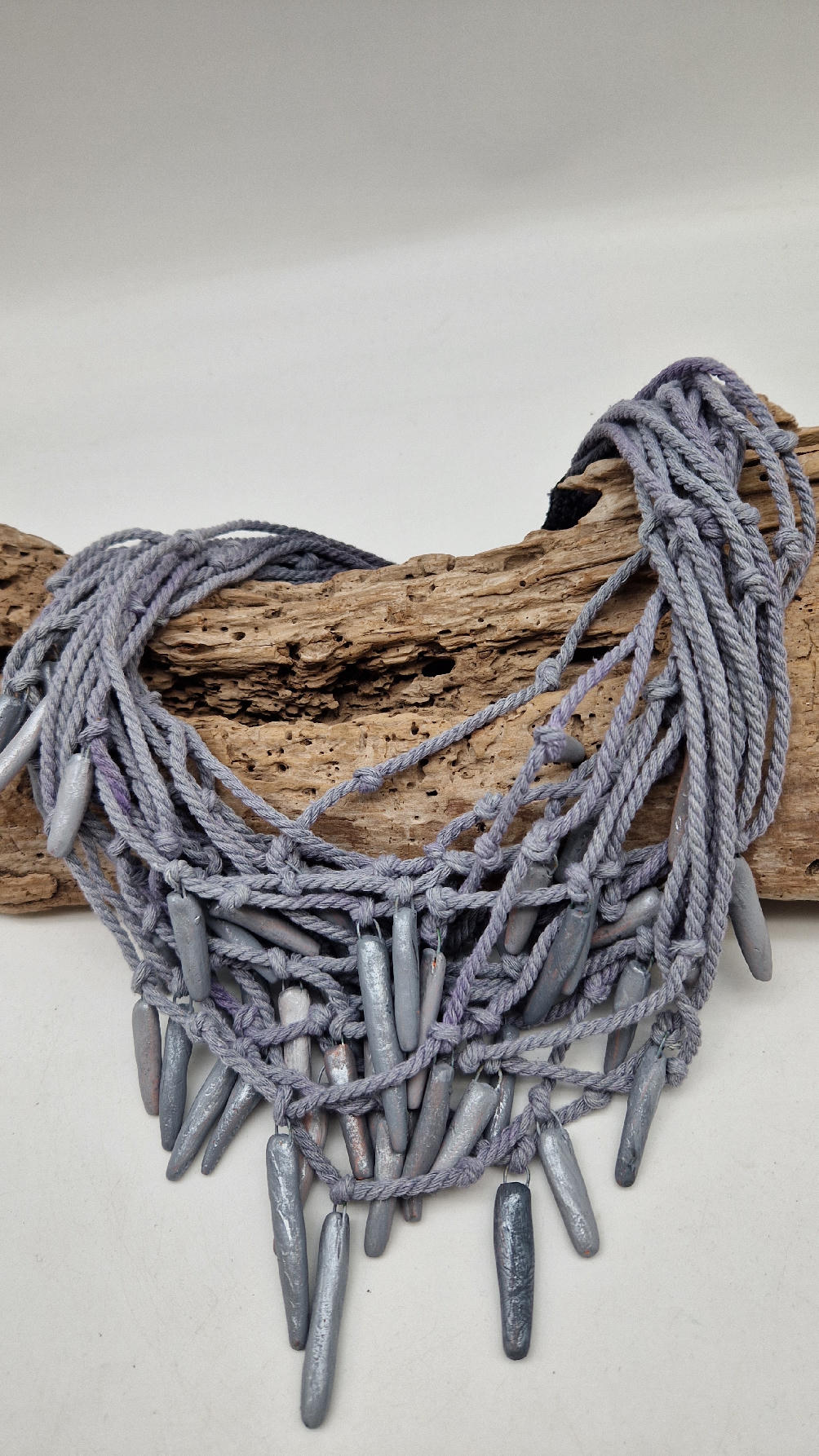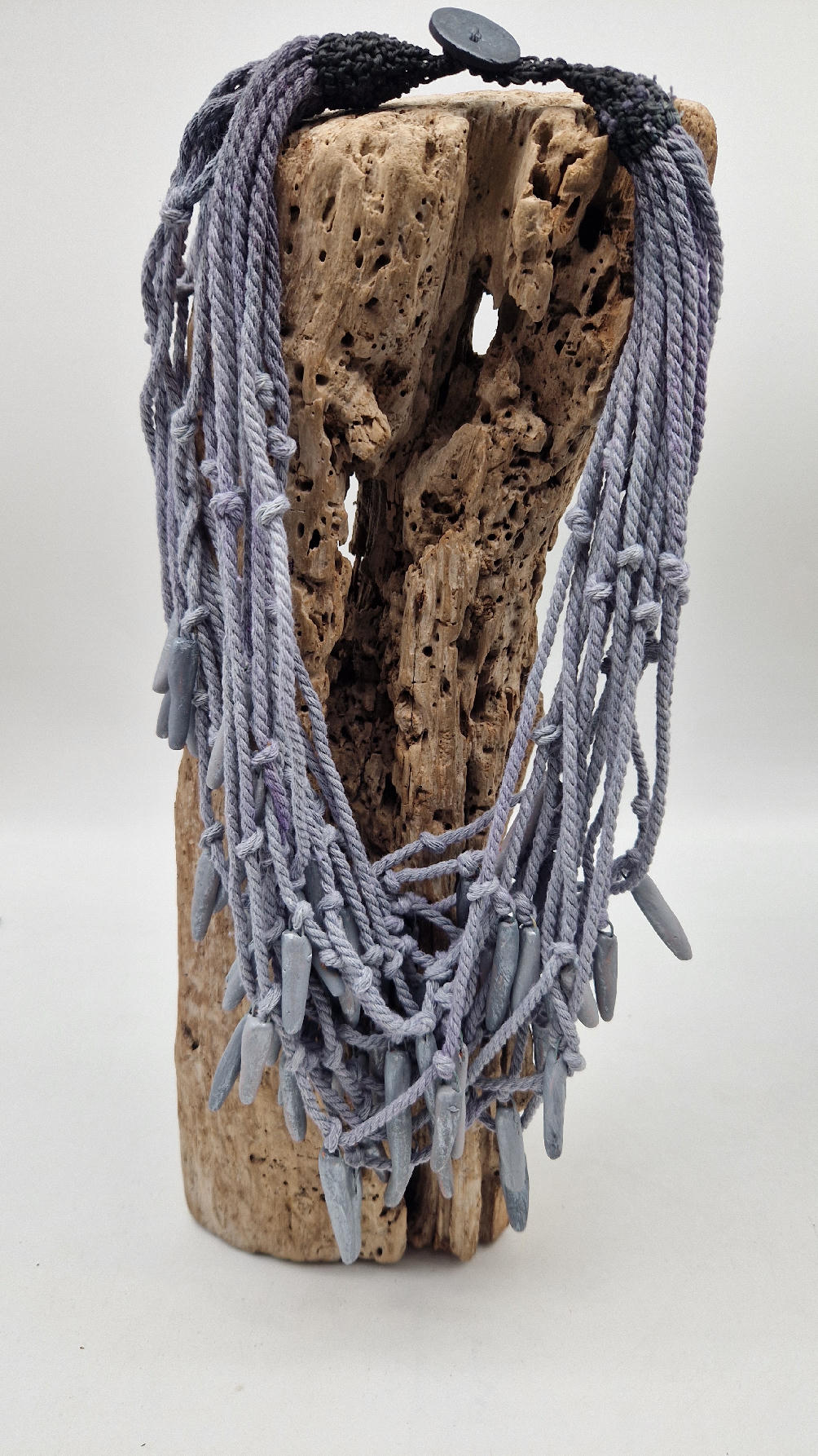 Naszyjnik zrobiony z bawełnianego, ręcznie farbowanego sznurka i ułożonych w misterną kompozycję ceramicznych , podłużnych , jak sople koralików, które również są uformowane ręcznie, następnie wypalone, pomalowane i przymocowane do sznurków, które tworzą przestrzenny naszyjnik. mnóstwo pracy, miłości i wyobraźni w jednym DZIELE. Kocham ten naszyjnik, cudownie zdobi nawet najprostszy T-shirt, a do czarnej sukienki jest po prostu idealny.( idealnie układa się na dekolcie mojej sukienki)
