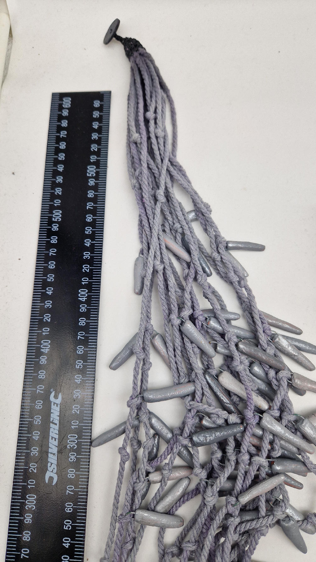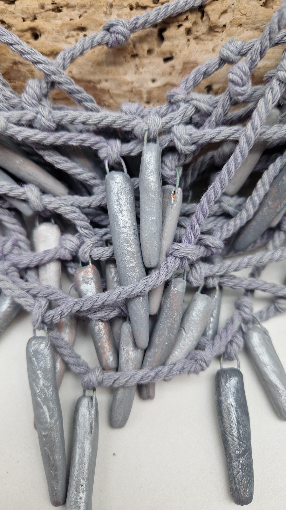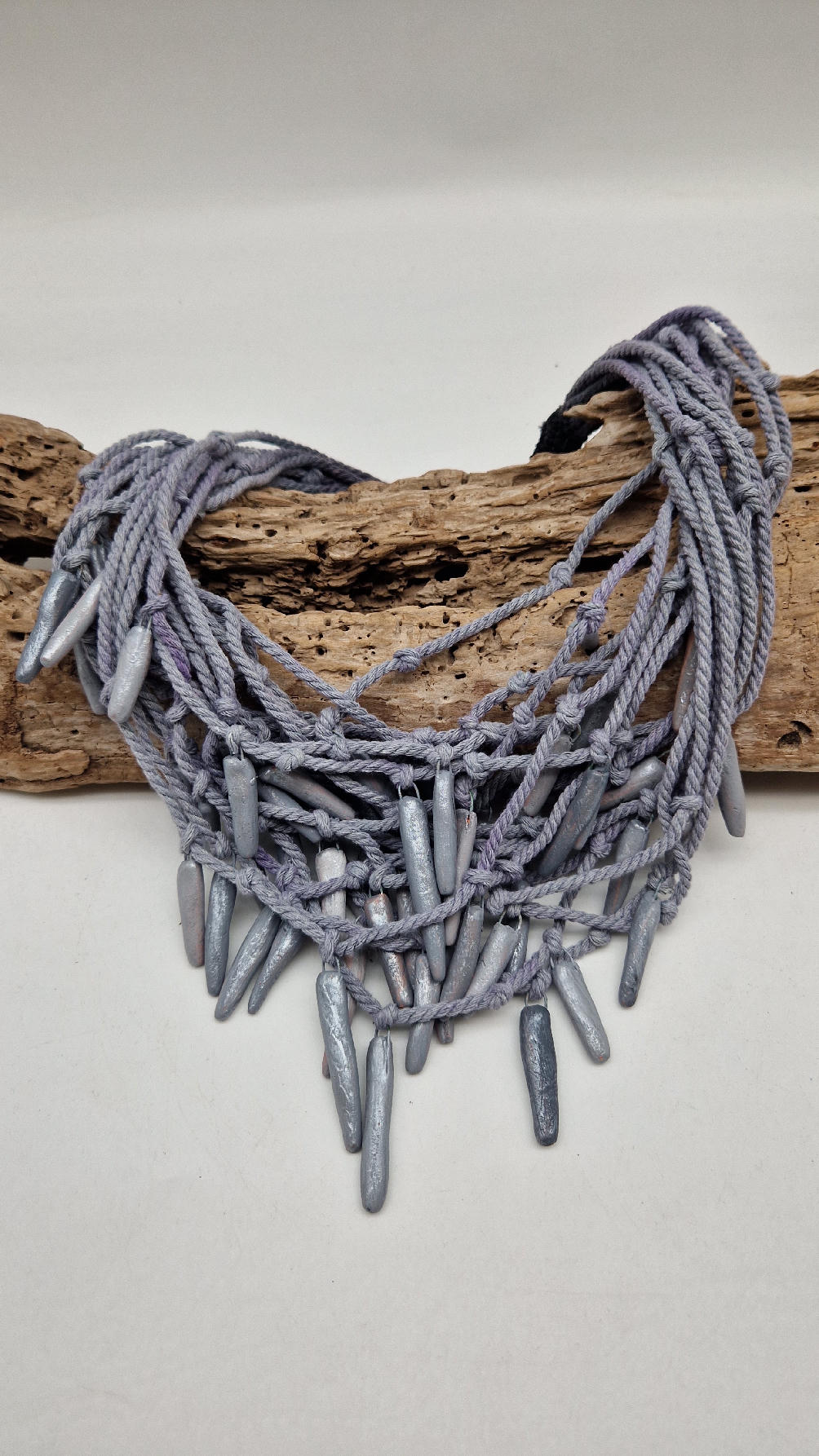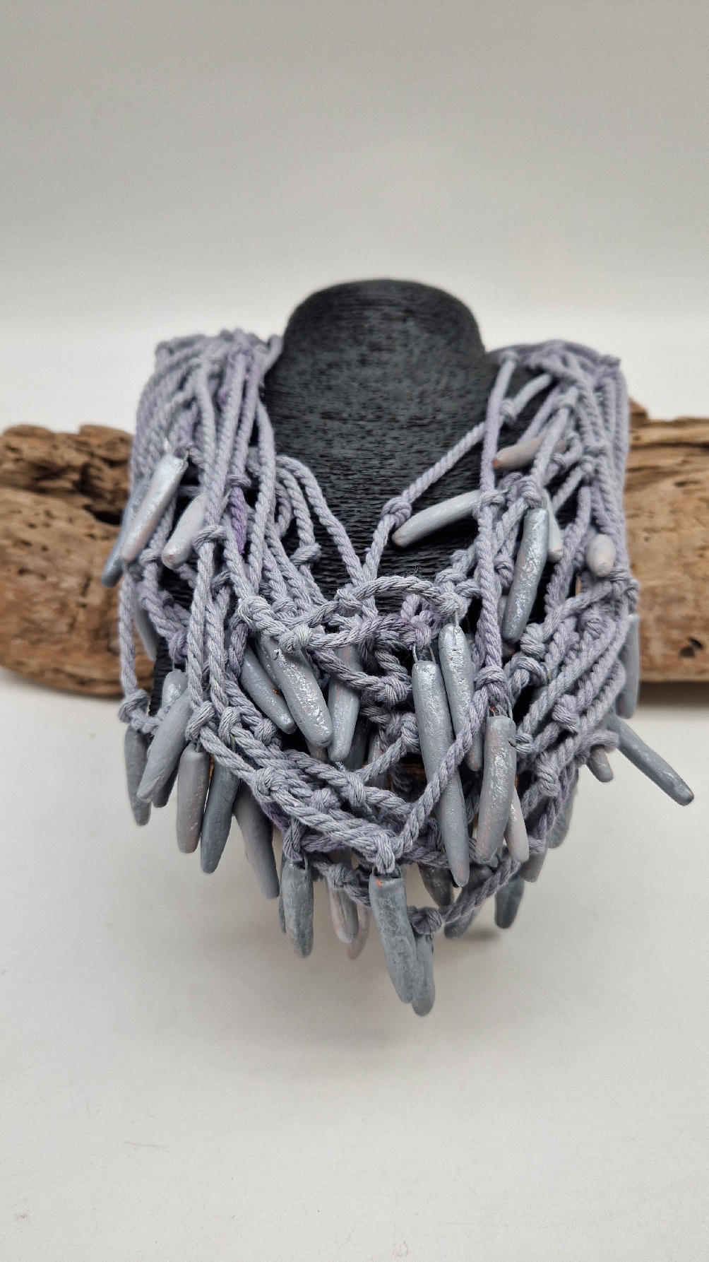 Naszyjnik zrobiony z bawełnianego, ręcznie farbowanego sznurka i ułożonych w misterną kompozycję ceramicznych , podłużnych , jak sople koralików, które również są uformowane ręcznie, następnie wypalone, pomalowane i przymocowane do sznurków, które tworzą przestrzenny naszyjnik. mnóstwo pracy, miłości i wyobraźni w jednym DZIELE. Kocham ten naszyjnik, cudownie zdobi nawet najprostszy T-shirt, a do czarnej sukienki jest po prostu idealny.( idealnie układa się na dekolcie mojej sukienki)