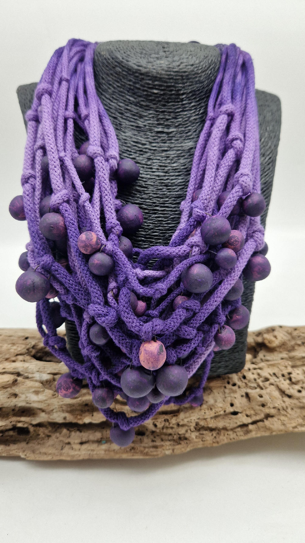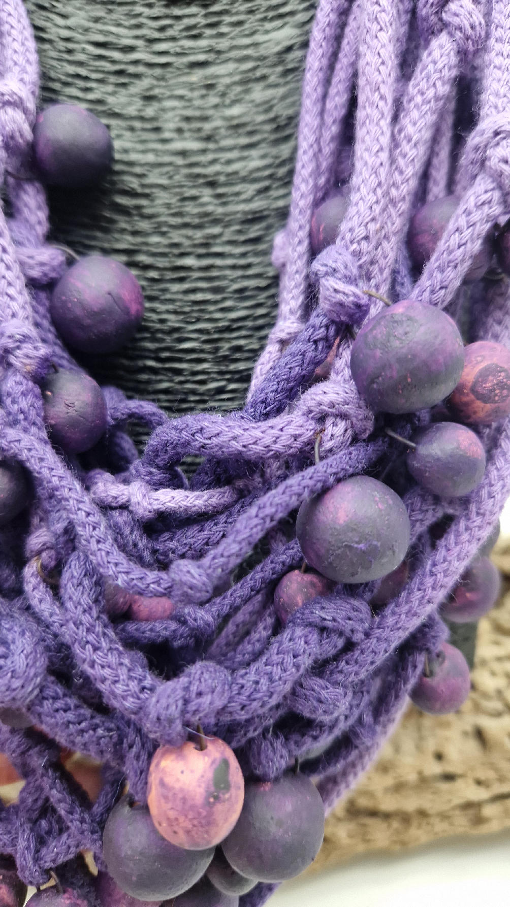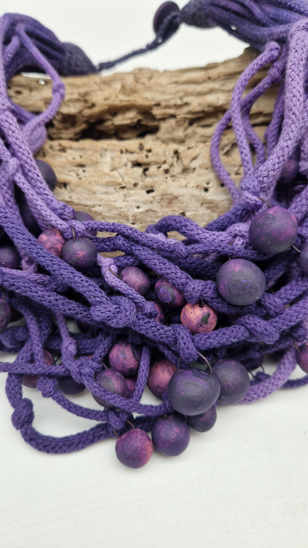 Piękny mega fioletowy, duży, przestrzenny, ale lekki,  energetyczny  naszyjnik, wykonany z bawełnianych, ręcznie farbowanych sznurków ,.. Do tych bawełnianych sznurków zostały przymocowane dziesiątki uformowanych ręcznie, wypalonych i zabarwionych niemal magicznie różnej wielkości  koralików w odcieniach fioletu