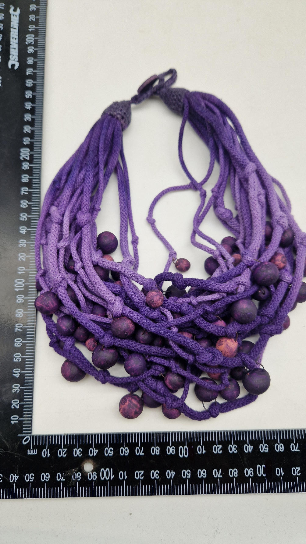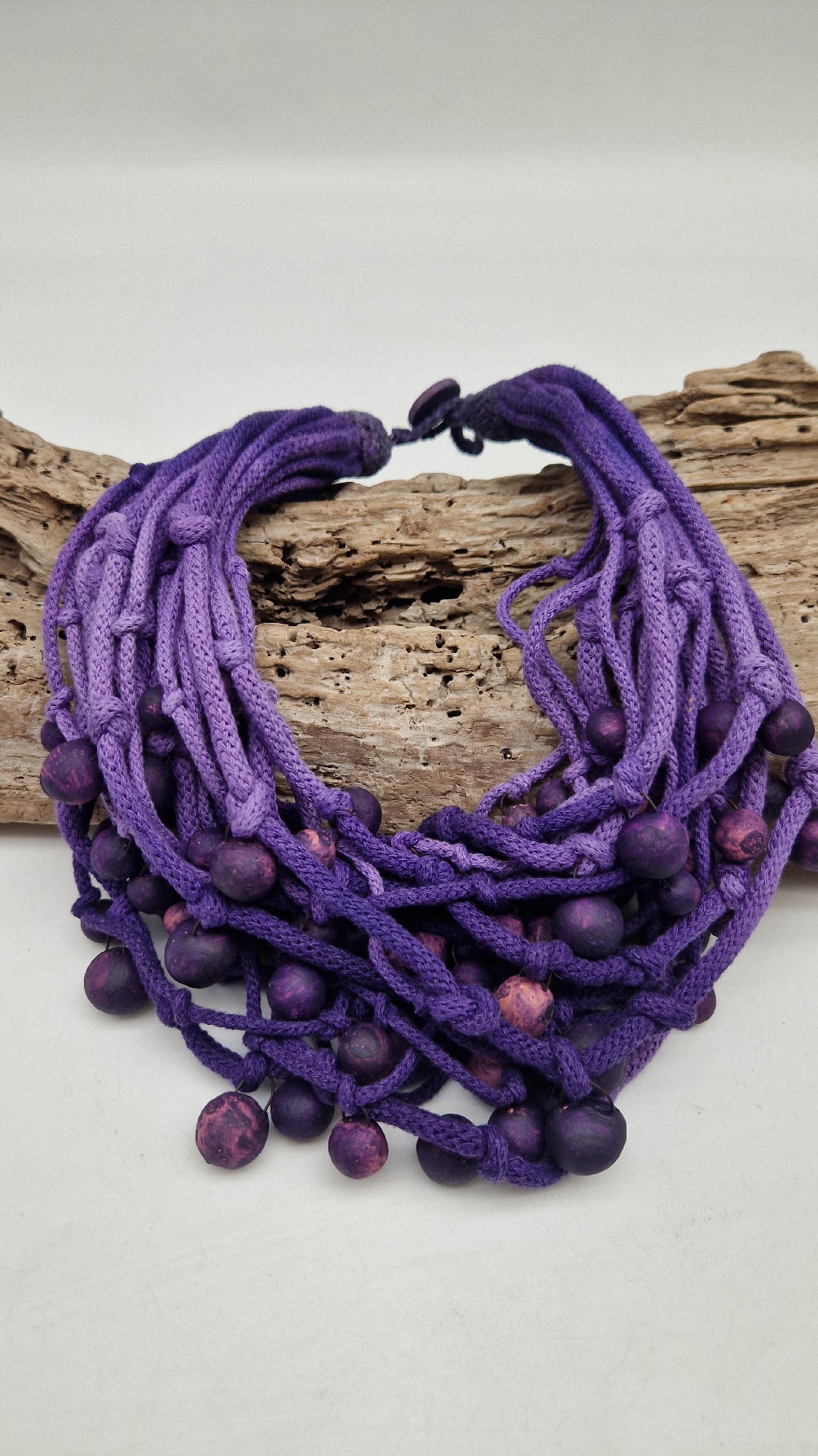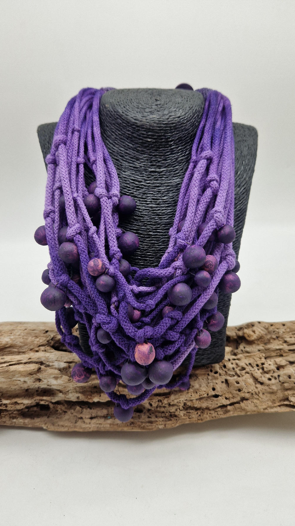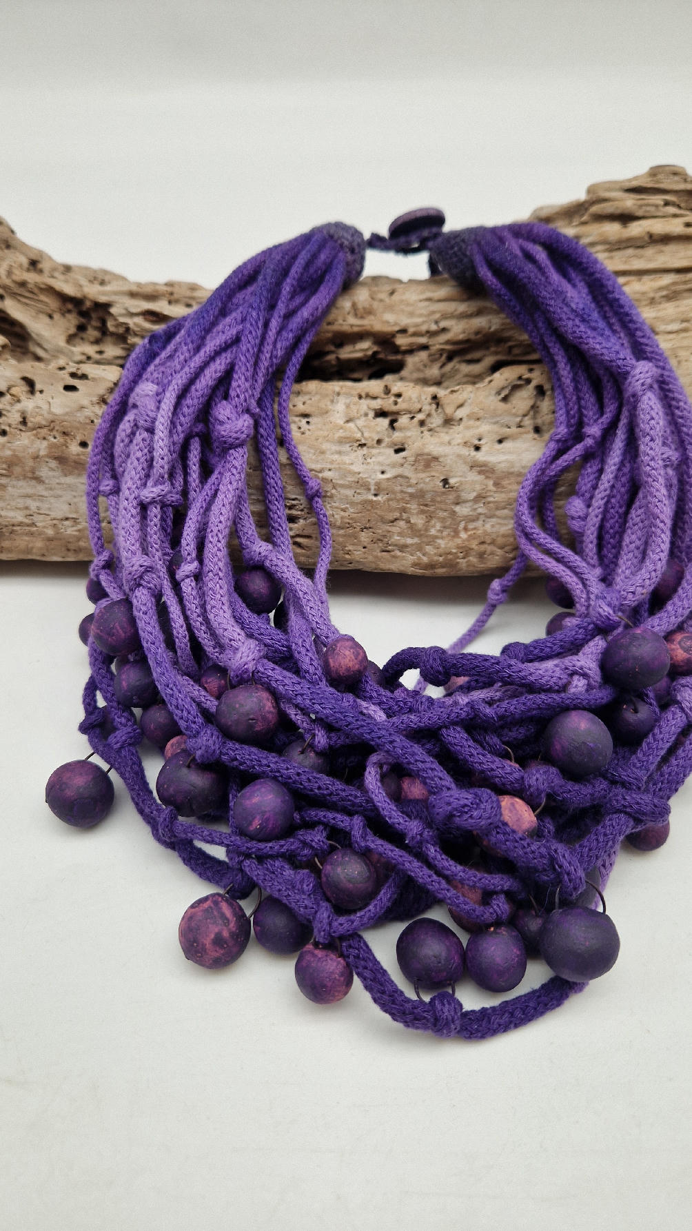 Piękny mega fioletowy, duży, przestrzenny, ale lekki,  energetyczny  naszyjnik, wykonany z bawełnianych, ręcznie farbowanych sznurków ,.. Do tych bawełnianych sznurków zostały przymocowane dziesiątki uformowanych ręcznie, wypalonych i zabarwionych niemal magicznie różnej wielkości  koralików w odcieniach fioletu