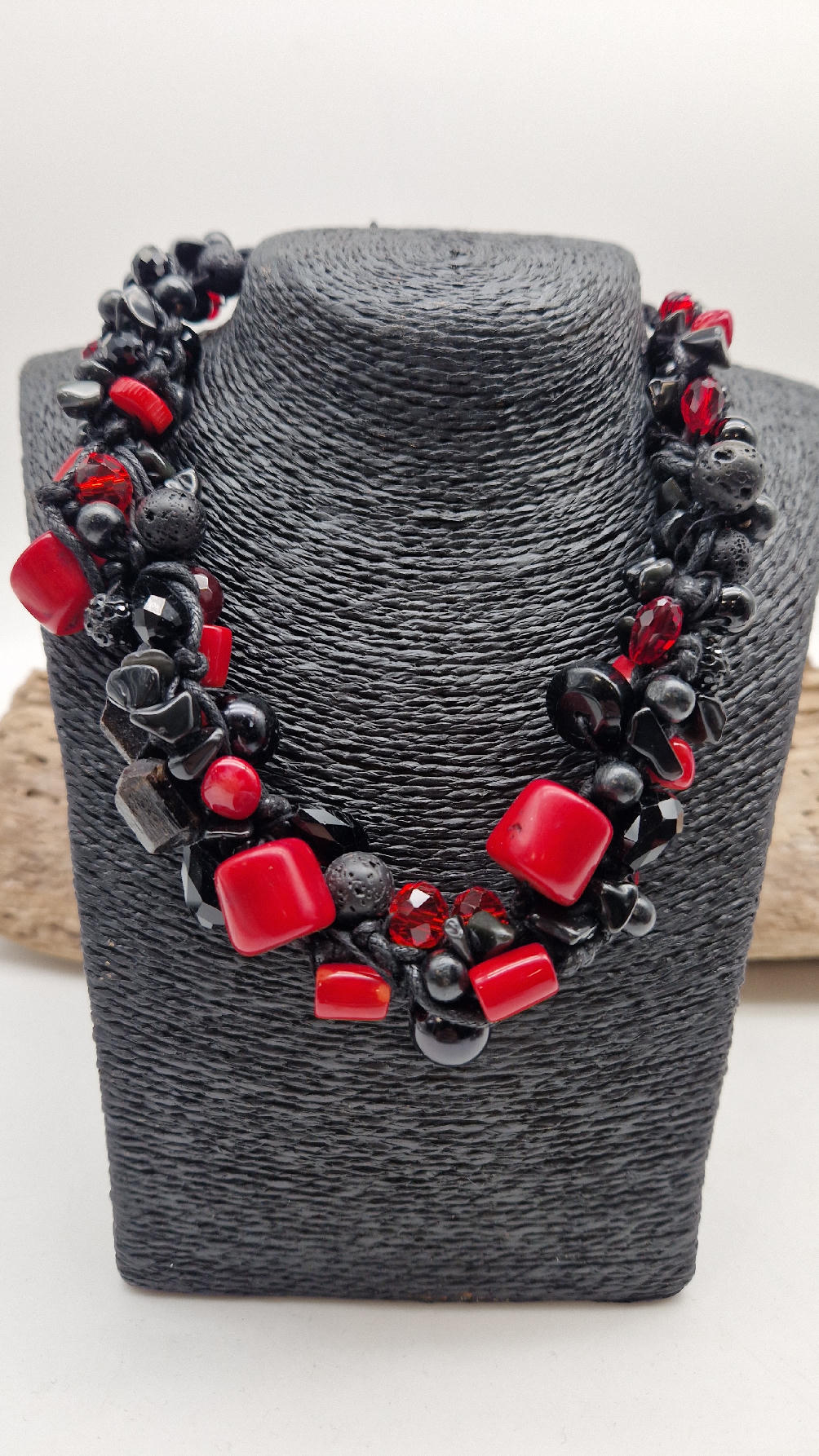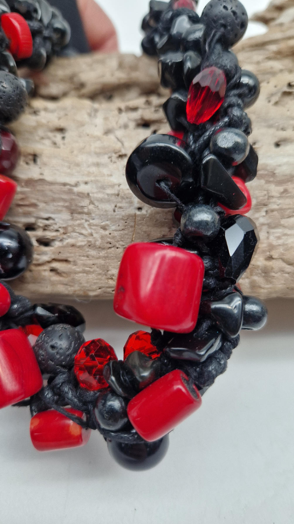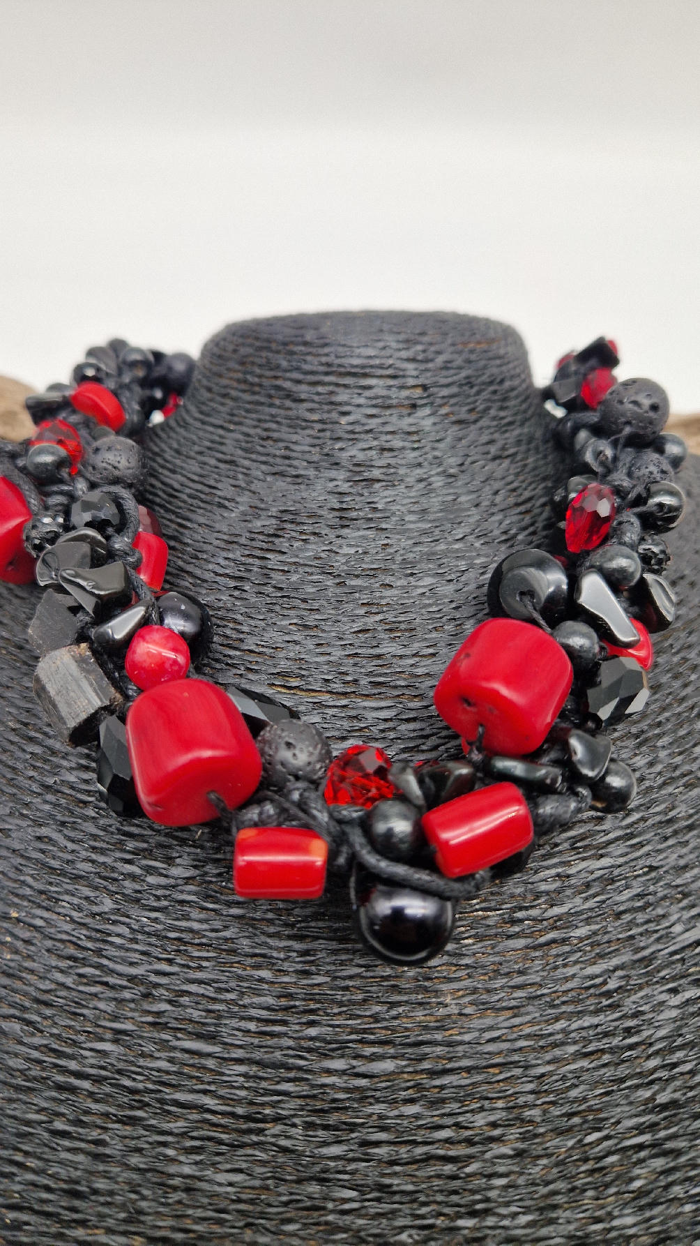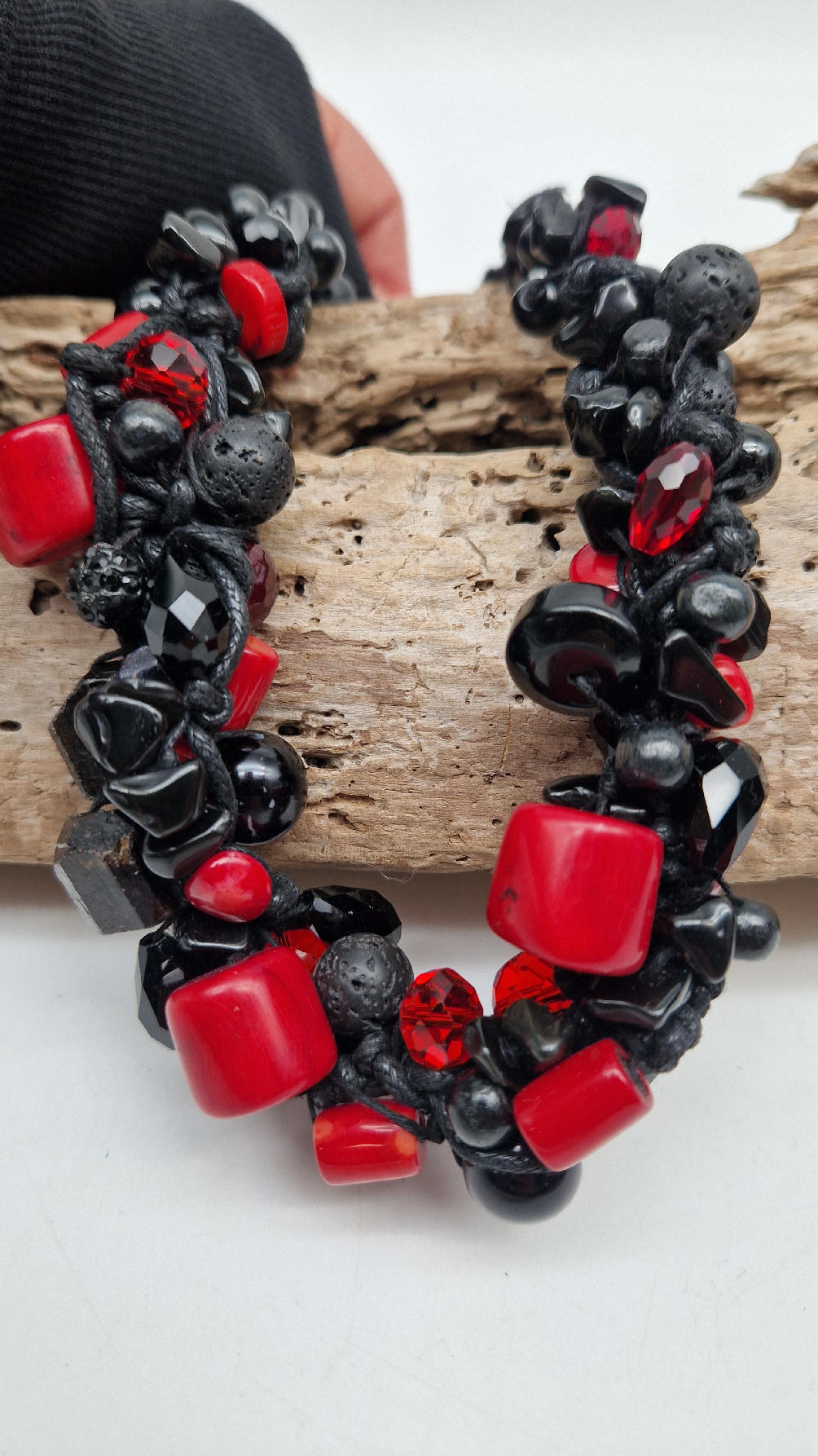 bardzo dekoracyjny, elegancki i megaenergetyczny naszyjnik zrobiony z czerwonych korali, onyksów, lawy i szklanych koralików poplątanych artystycznie z bawełnianym sznurkiem , żeby było ciut blasku …taka czysta radość ,elegancja i energia