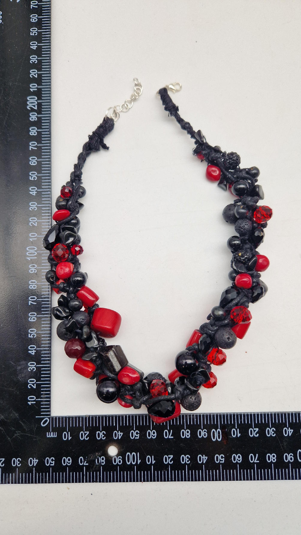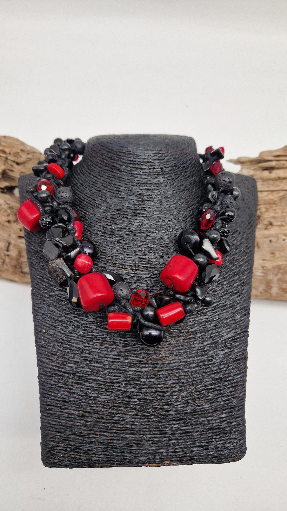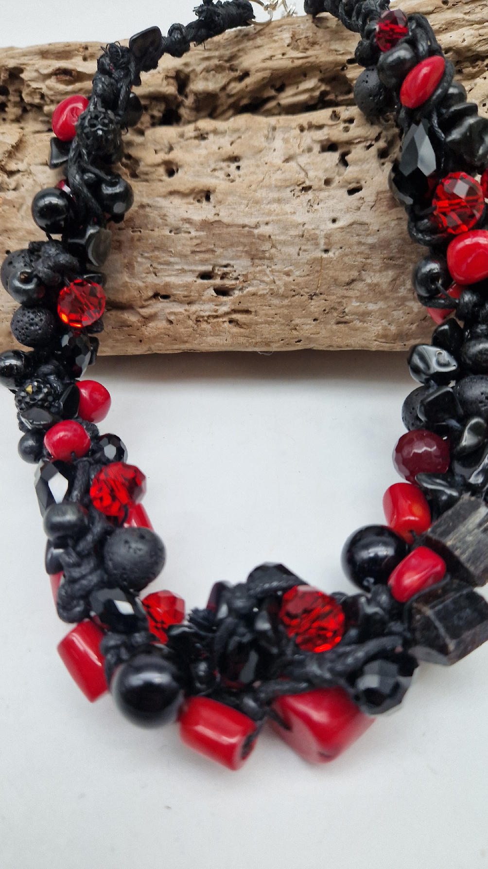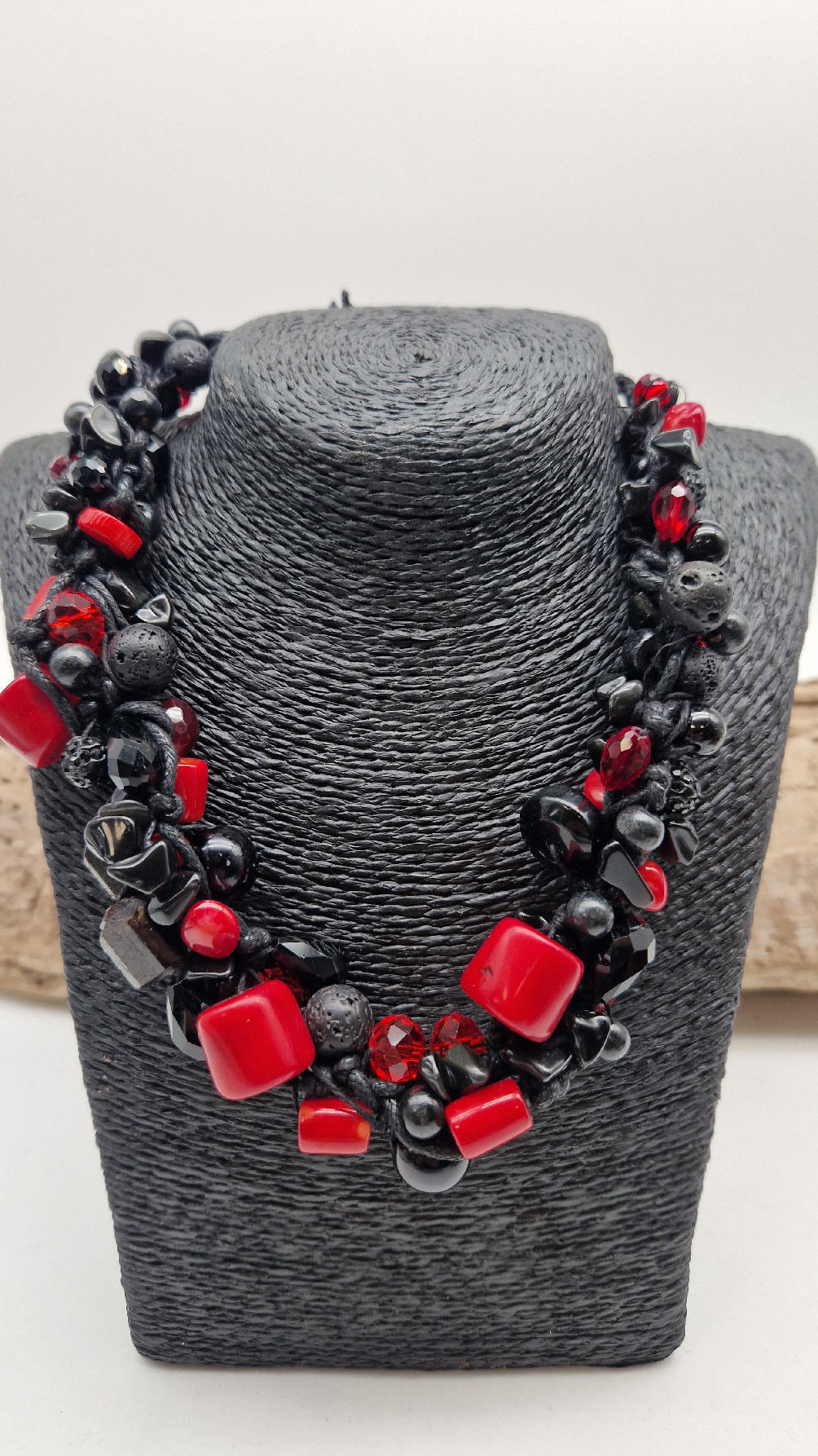 bardzo dekoracyjny, elegancki i megaenergetyczny naszyjnik zrobiony z czerwonych korali, onyksów, lawy i szklanych koralików poplątanych artystycznie z bawełnianym sznurkiem , żeby było ciut blasku …taka czysta radość ,elegancja i energia
