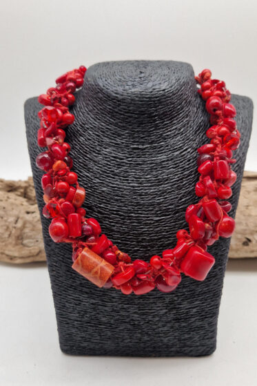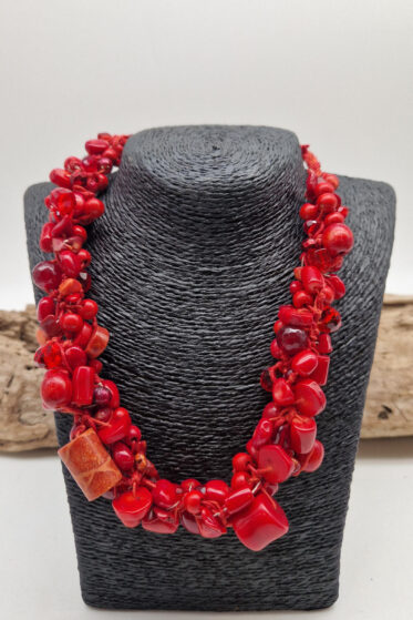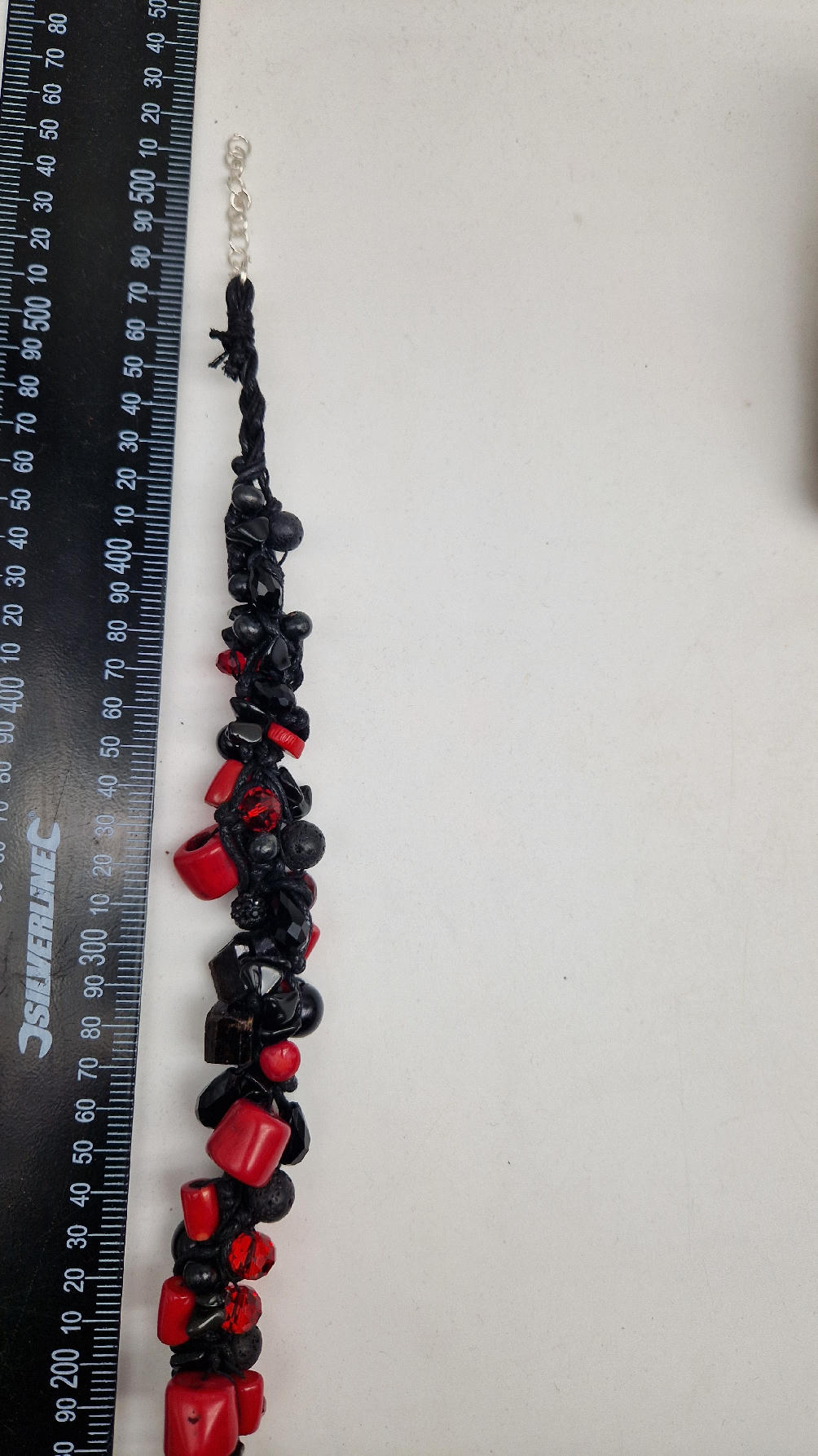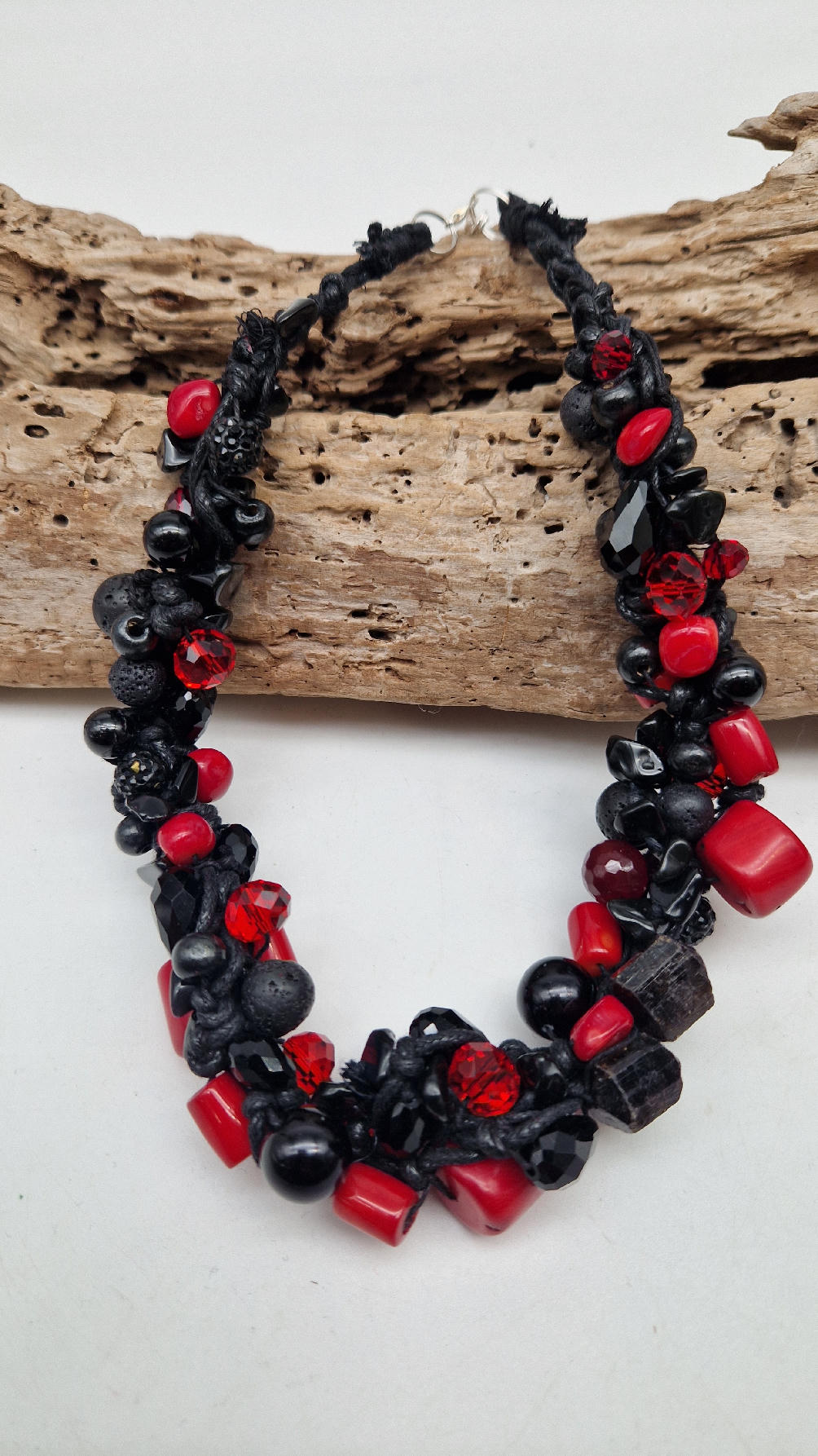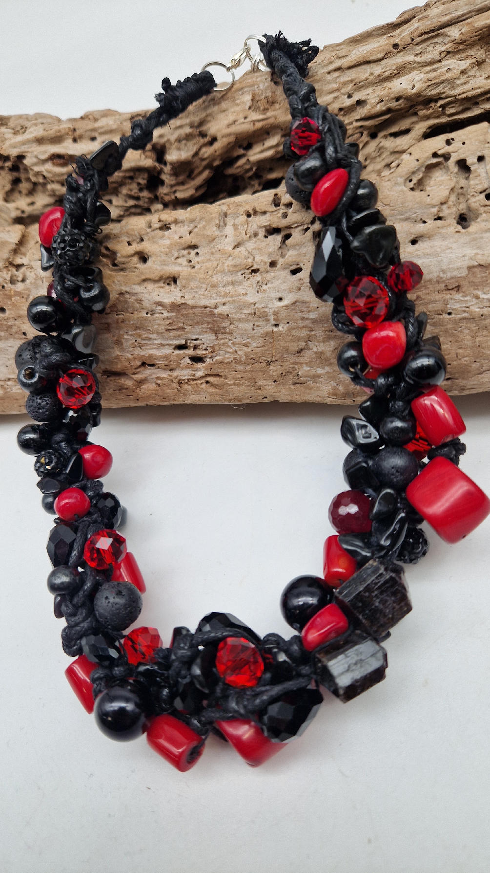 bardzo dekoracyjny, elegancki i megaenergetyczny naszyjnik zrobiony z czerwonych korali, onyksów, lawy i szklanych koralików poplątanych artystycznie z bawełnianym sznurkiem , żeby było ciut blasku …taka czysta radość ,elegancja i energia