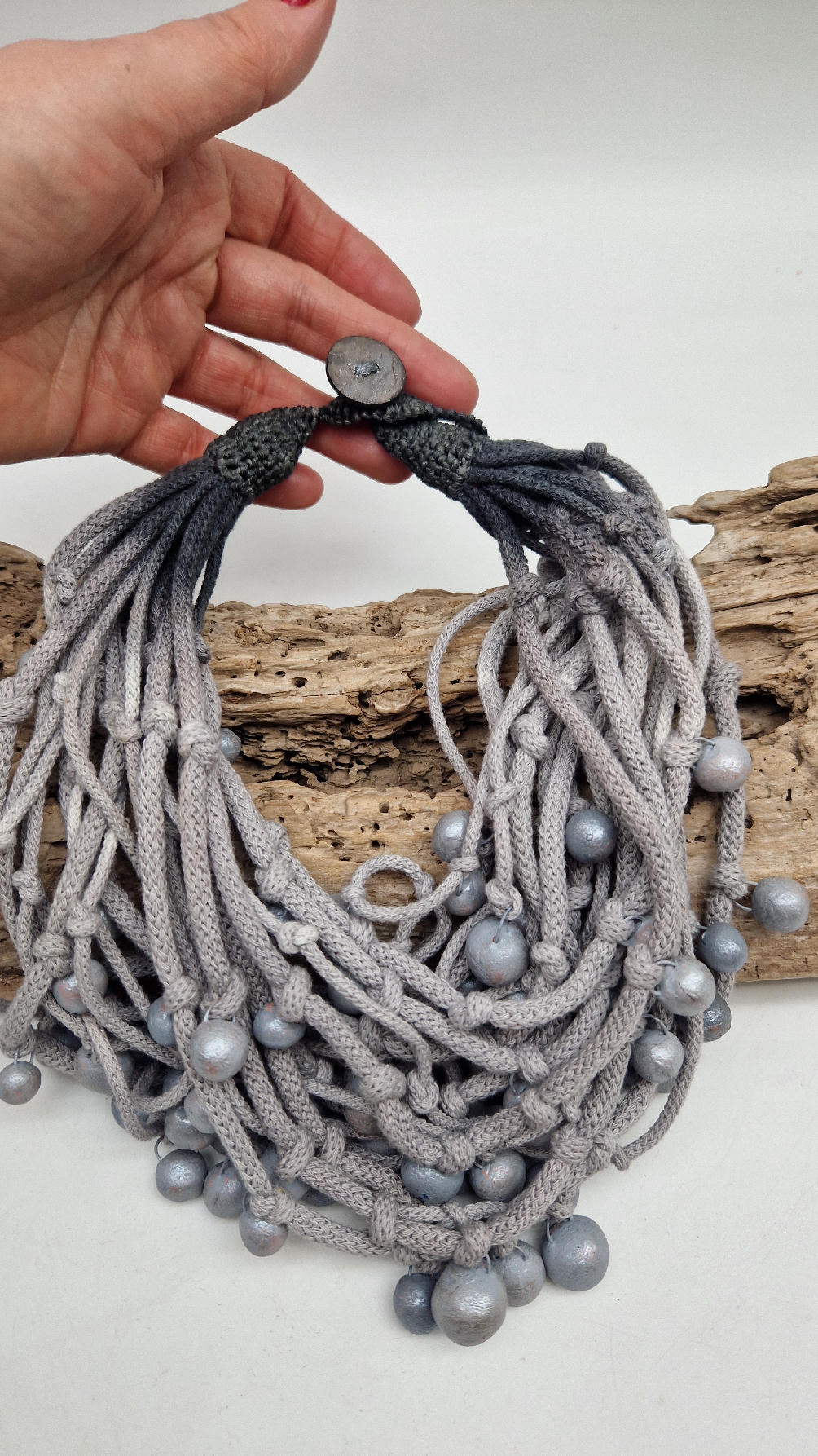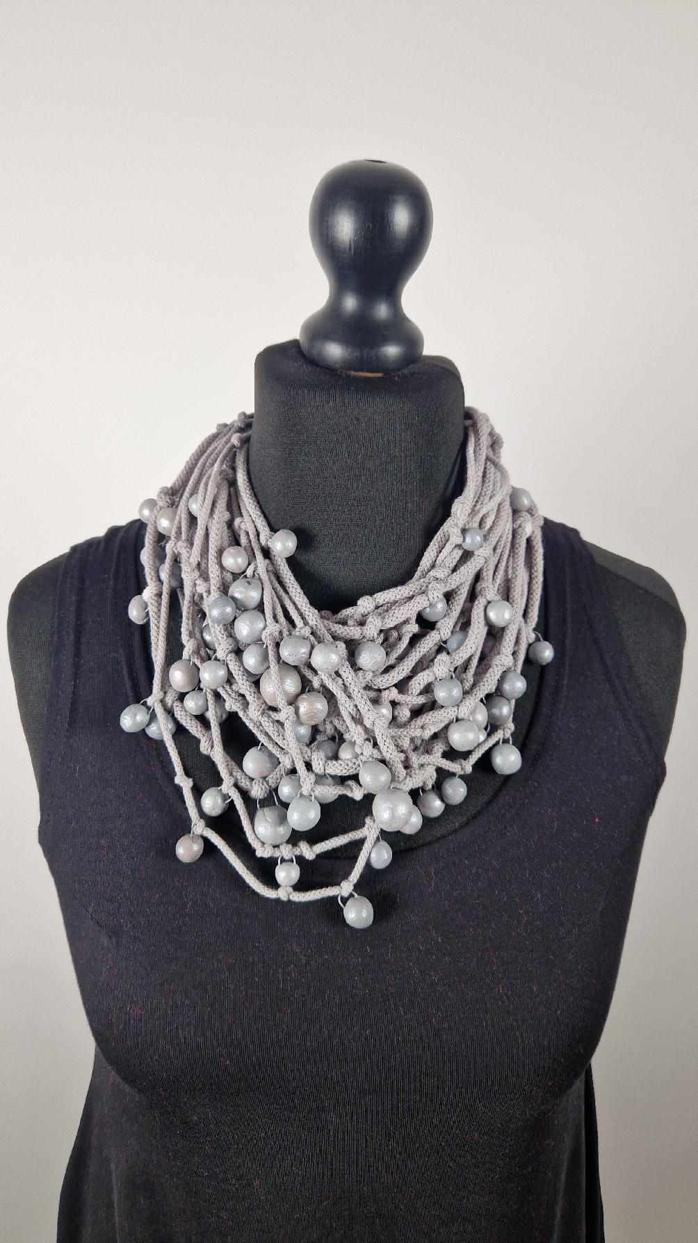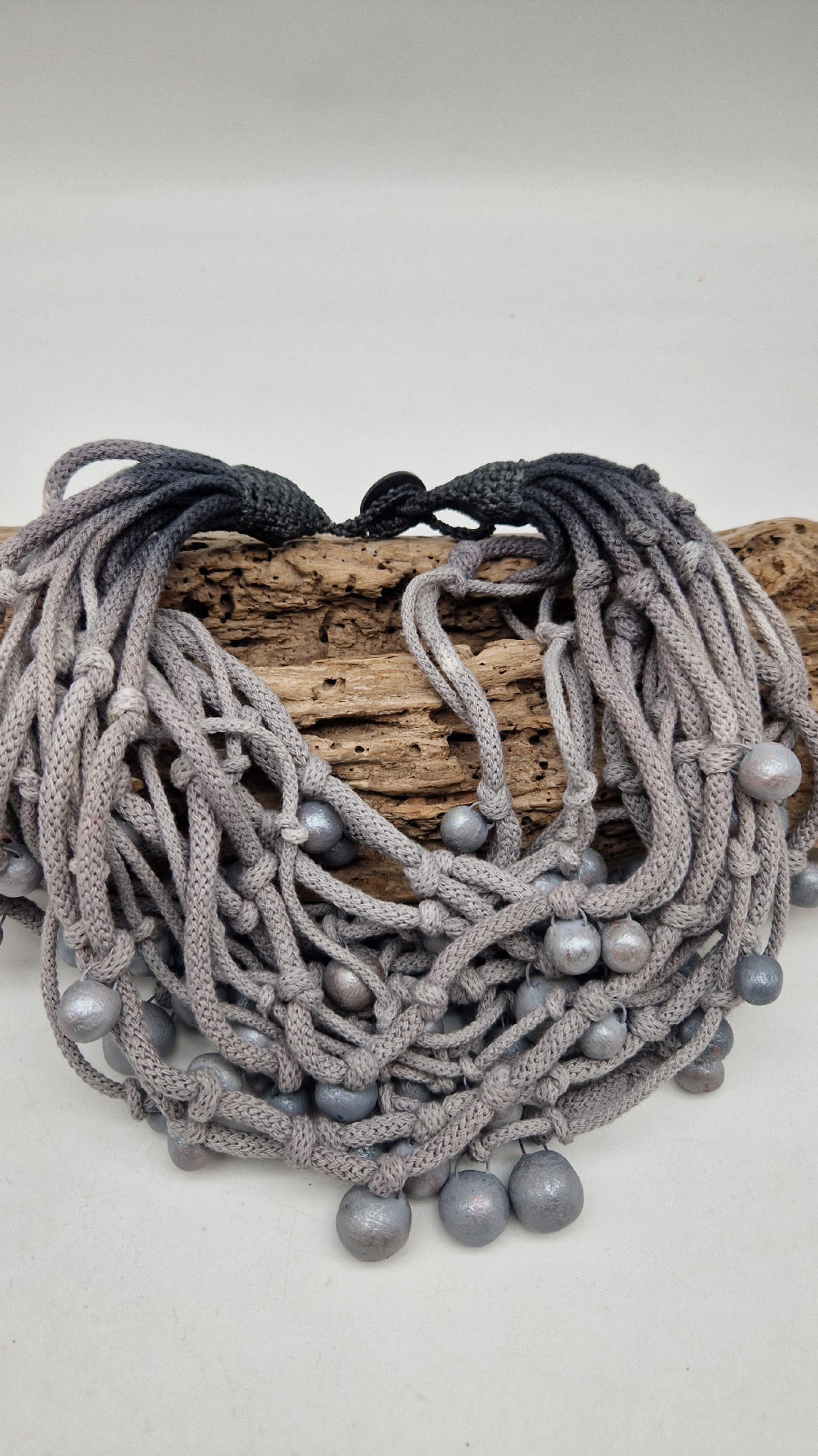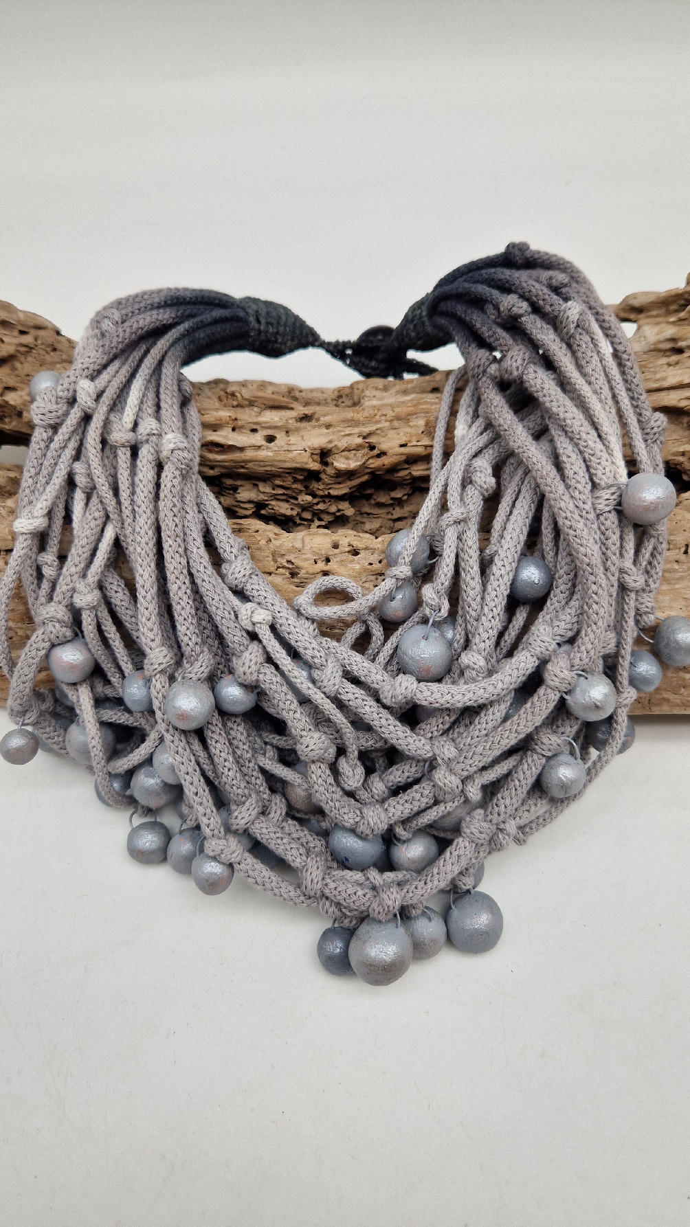 Naszyjnik wykonany z bawełnianych, ręcznie farbowanych sznurków , w odcieniach mgły nad Wenecją. W odcieniach szarości i zachmurzonego nieba z ociupiną czerni …do których zostały przymocowane zabarwione na jasno-szaro okrągłe, różnej wielkości śliczne kulki. Naszyjnik jest lekki i świetnie pasuje nie tylko do czarnych kiecek…