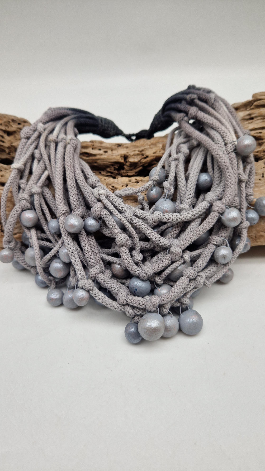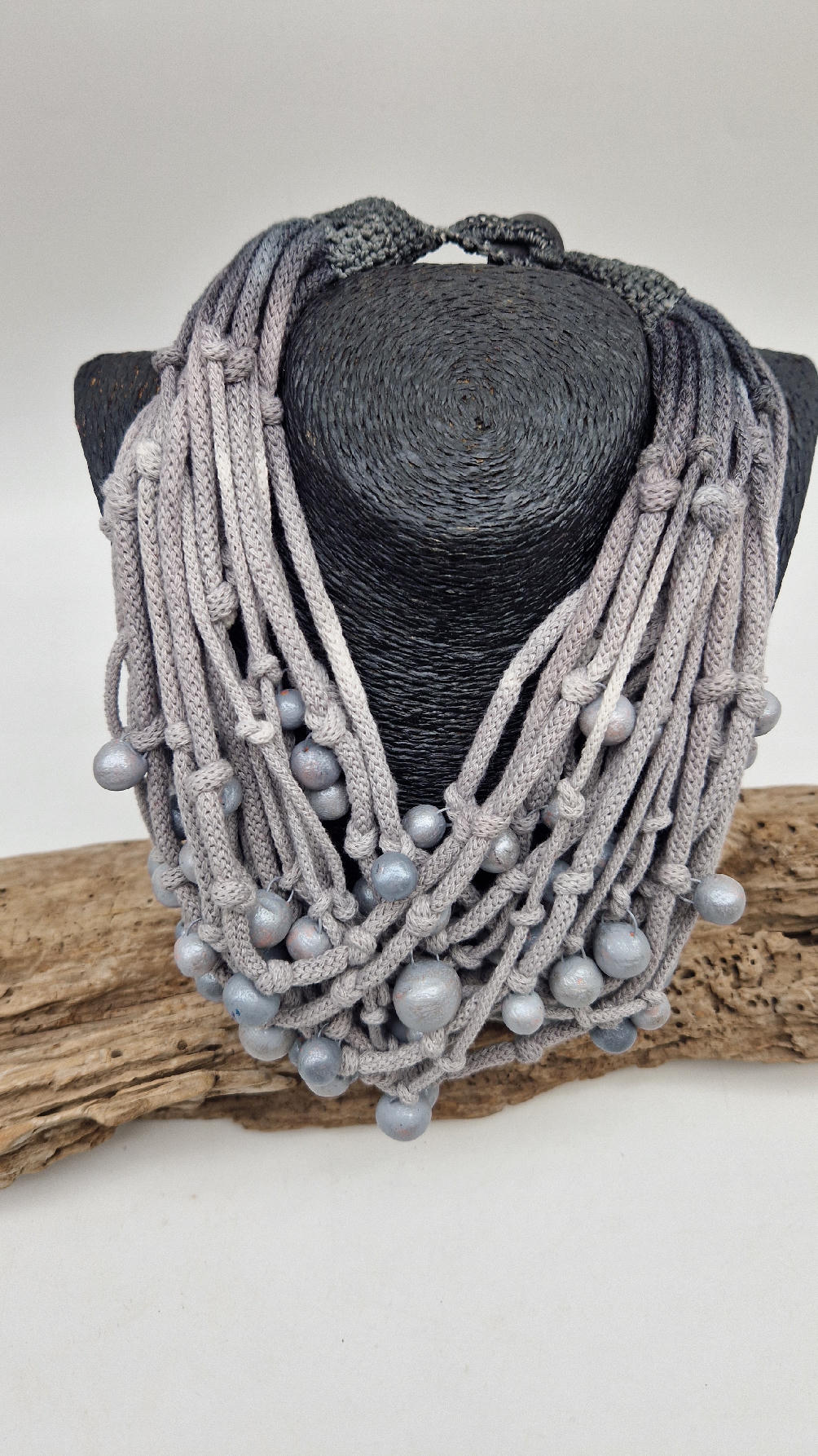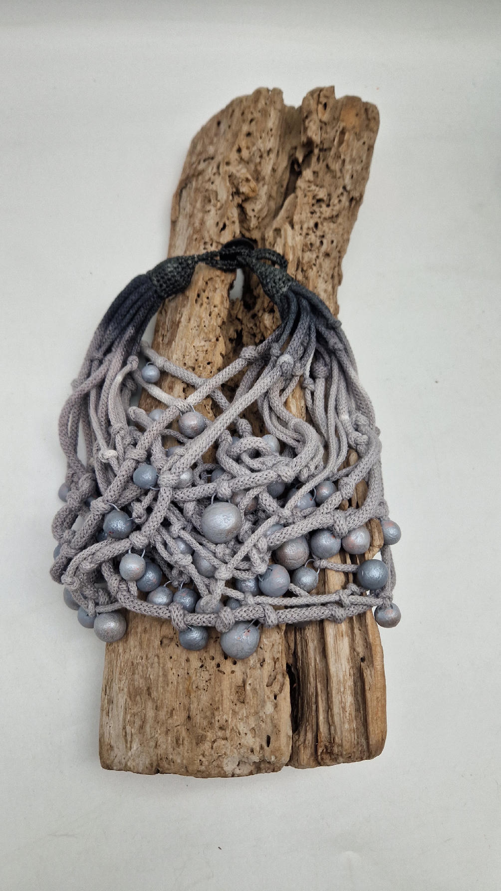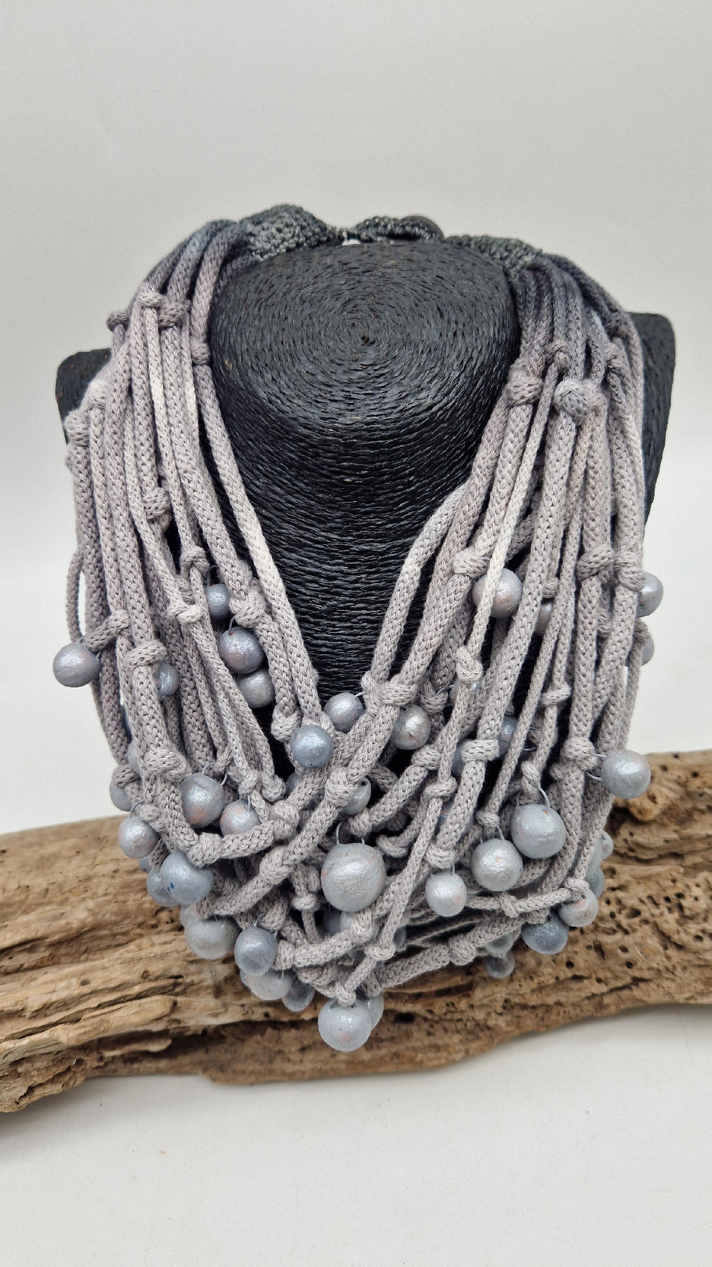 Naszyjnik wykonany z bawełnianych, ręcznie farbowanych sznurków , w odcieniach mgły nad Wenecją. W odcieniach szarości i zachmurzonego nieba z ociupiną czerni …do których zostały przymocowane zabarwione na jasno-szaro okrągłe, różnej wielkości śliczne kulki. Naszyjnik jest lekki i świetnie pasuje nie tylko do czarnych kiecek…