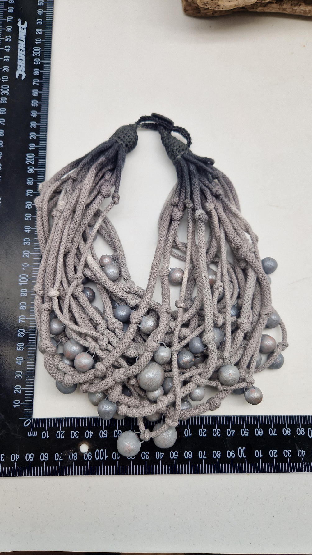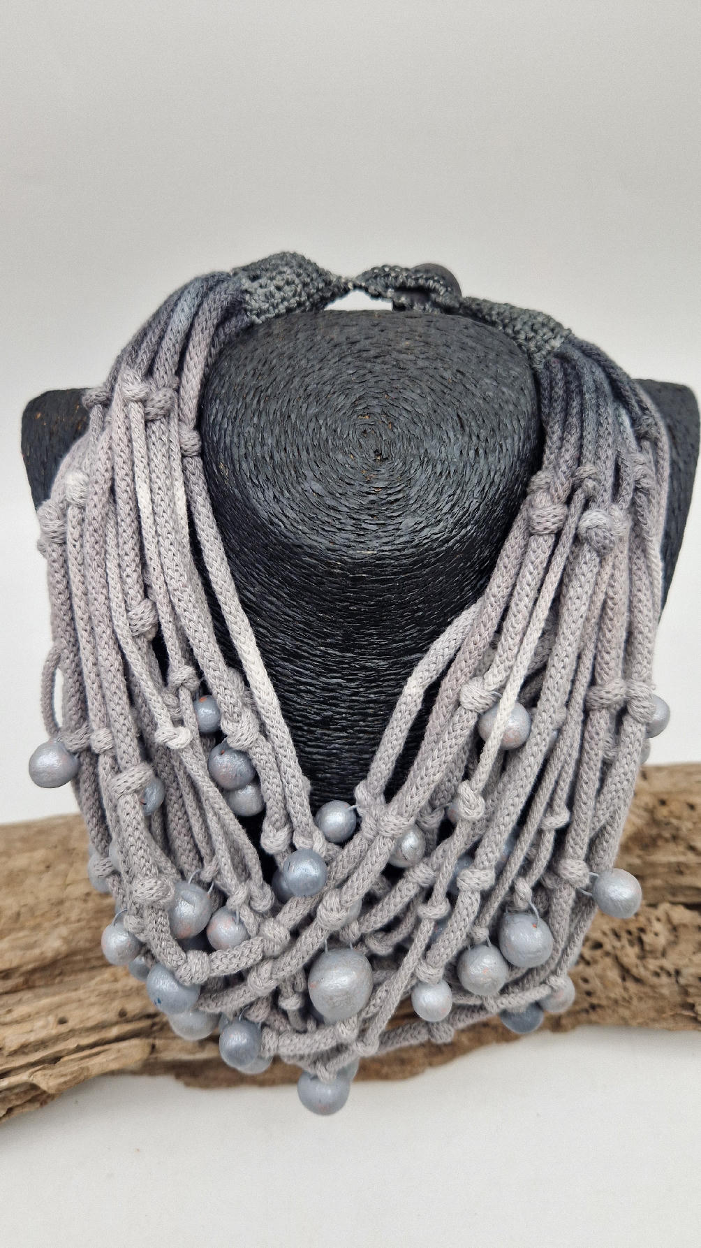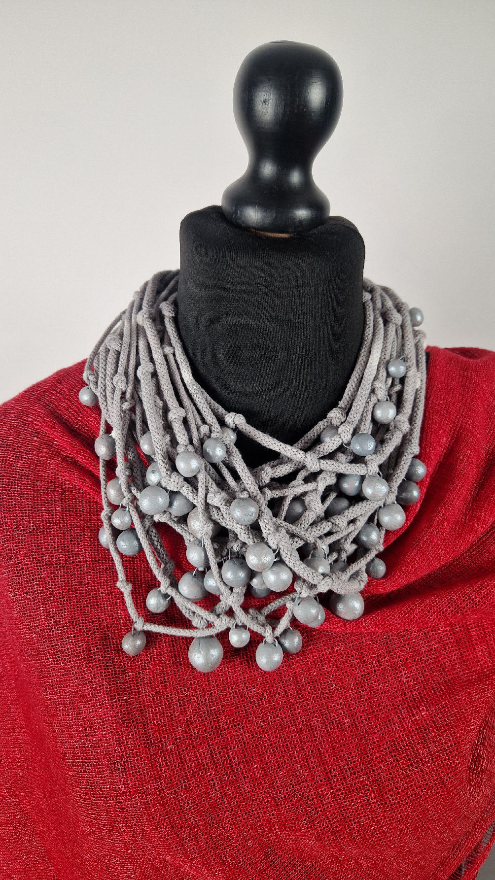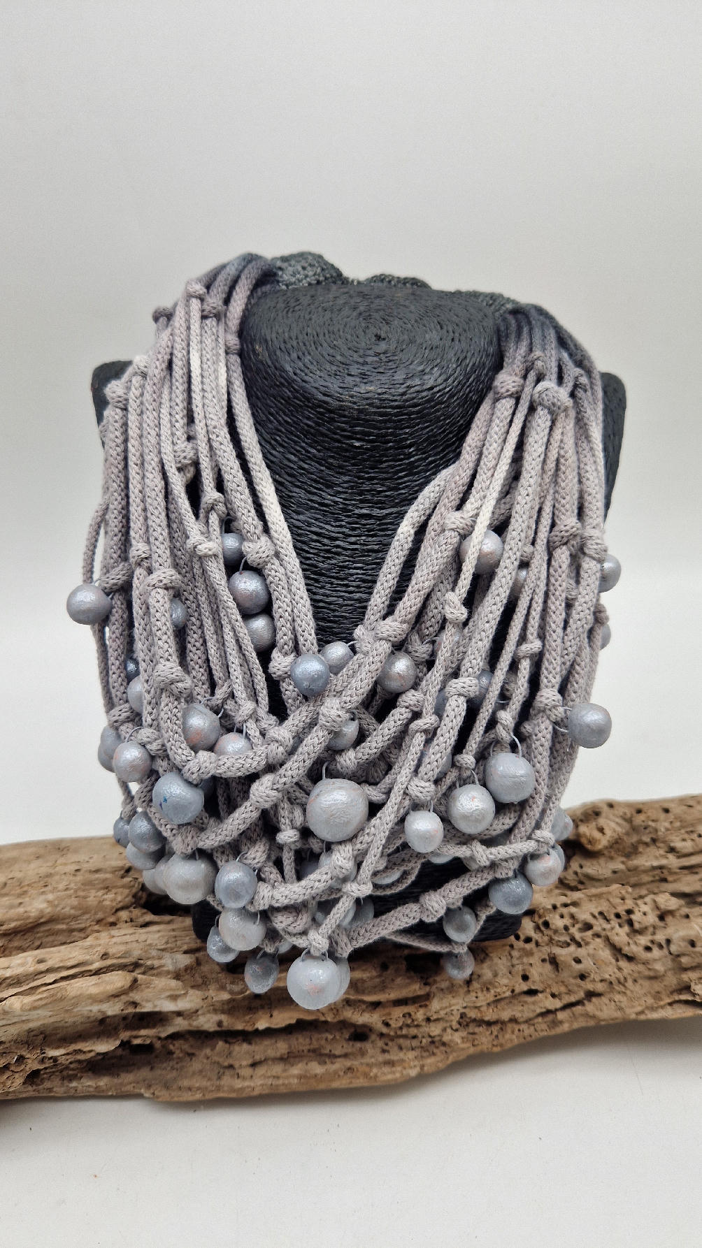 Naszyjnik wykonany z bawełnianych, ręcznie farbowanych sznurków , w odcieniach mgły nad Wenecją. W odcieniach szarości i zachmurzonego nieba z ociupiną czerni …do których zostały przymocowane zabarwione na jasno-szaro okrągłe, różnej wielkości śliczne kulki. Naszyjnik jest lekki i świetnie pasuje nie tylko do czarnych kiecek…