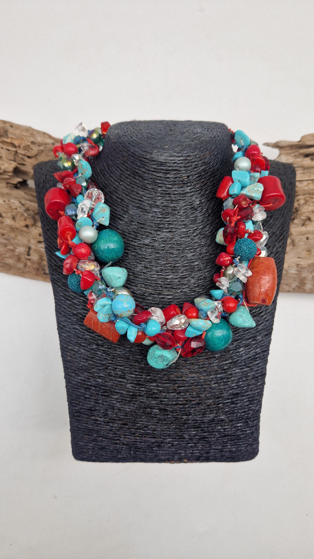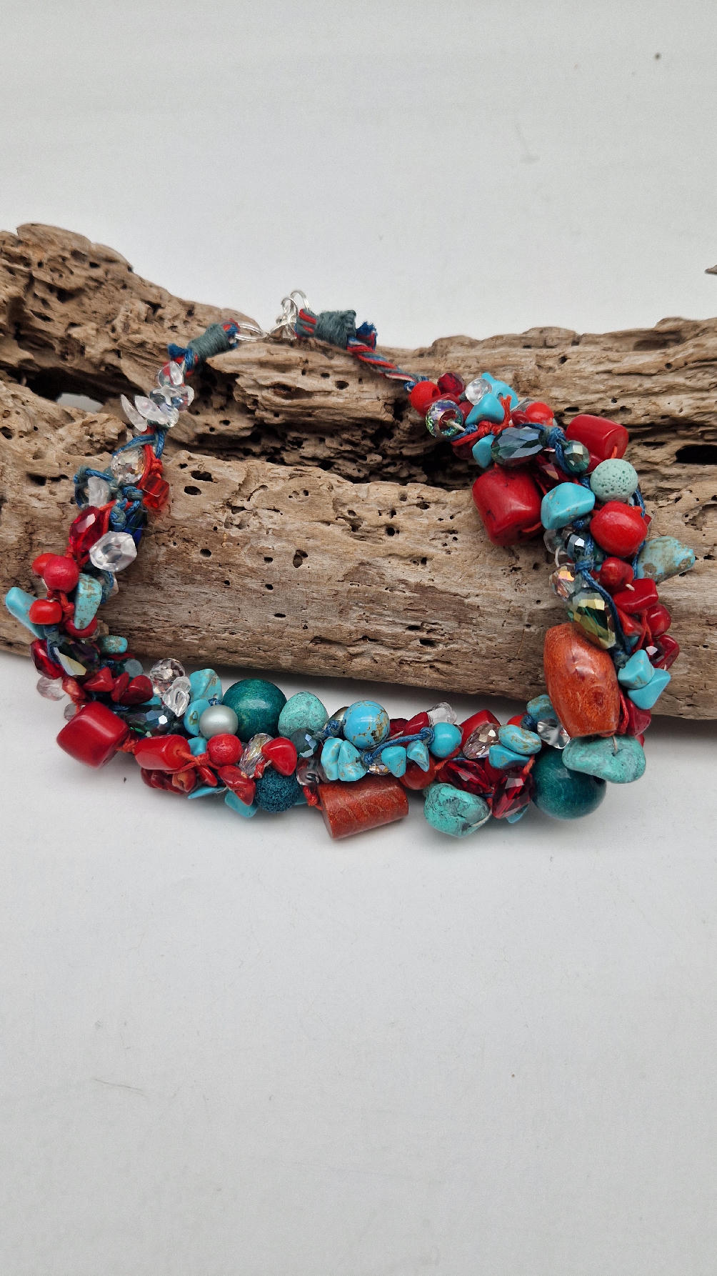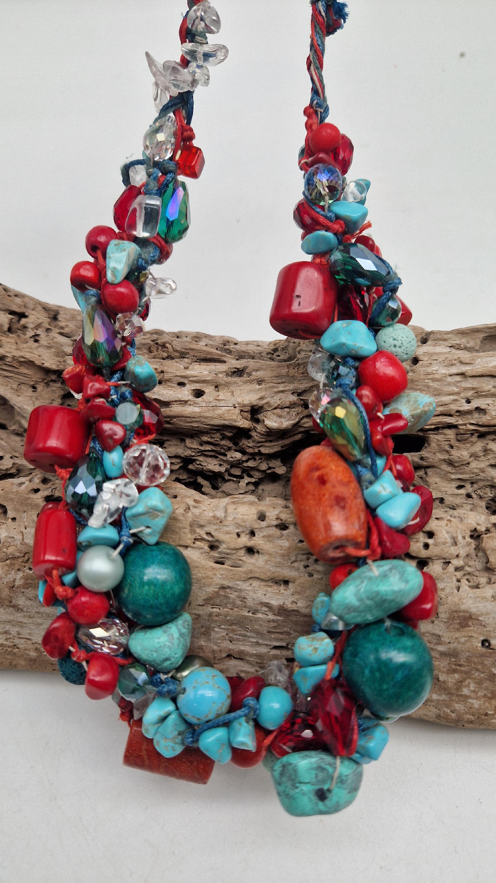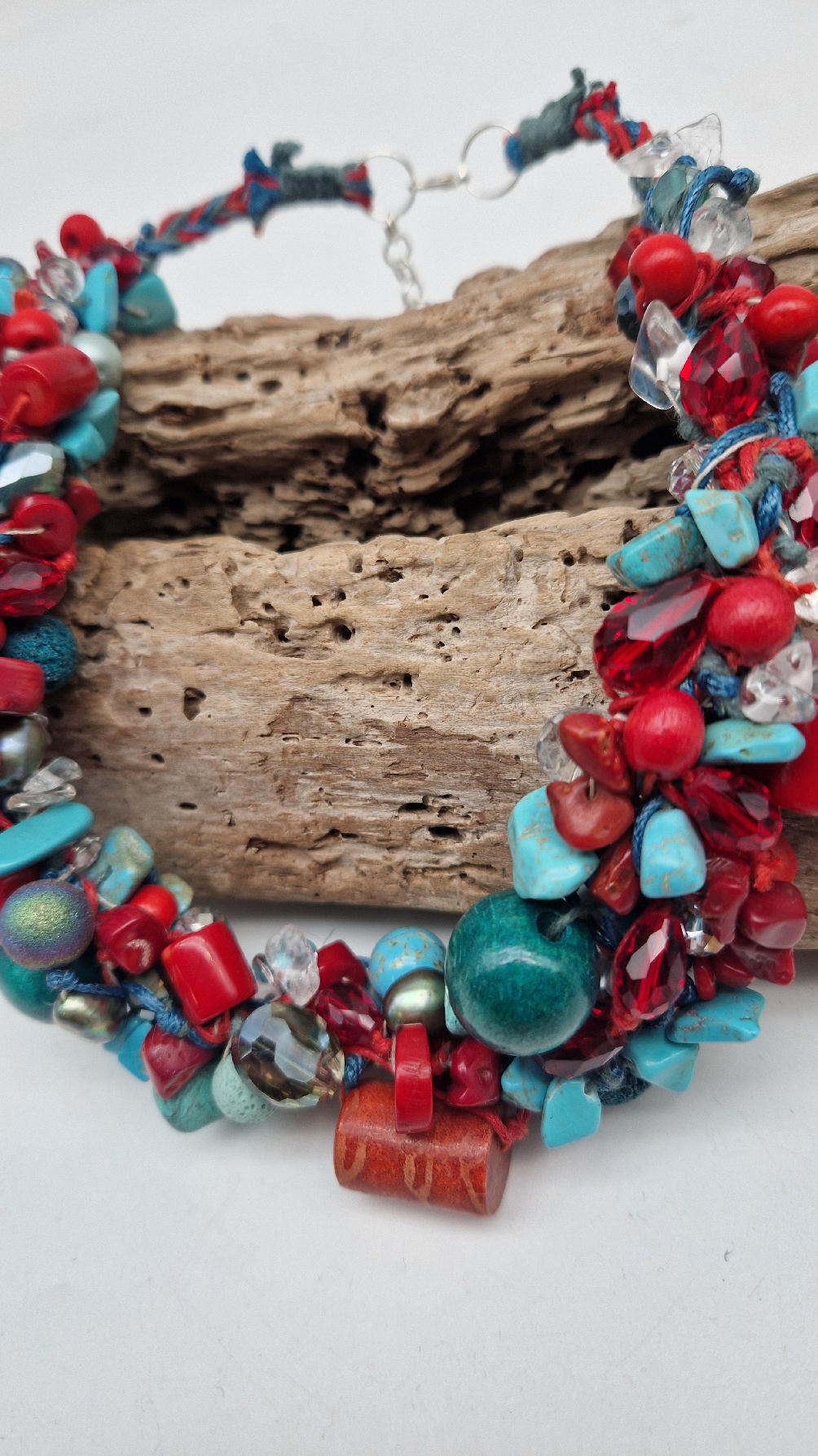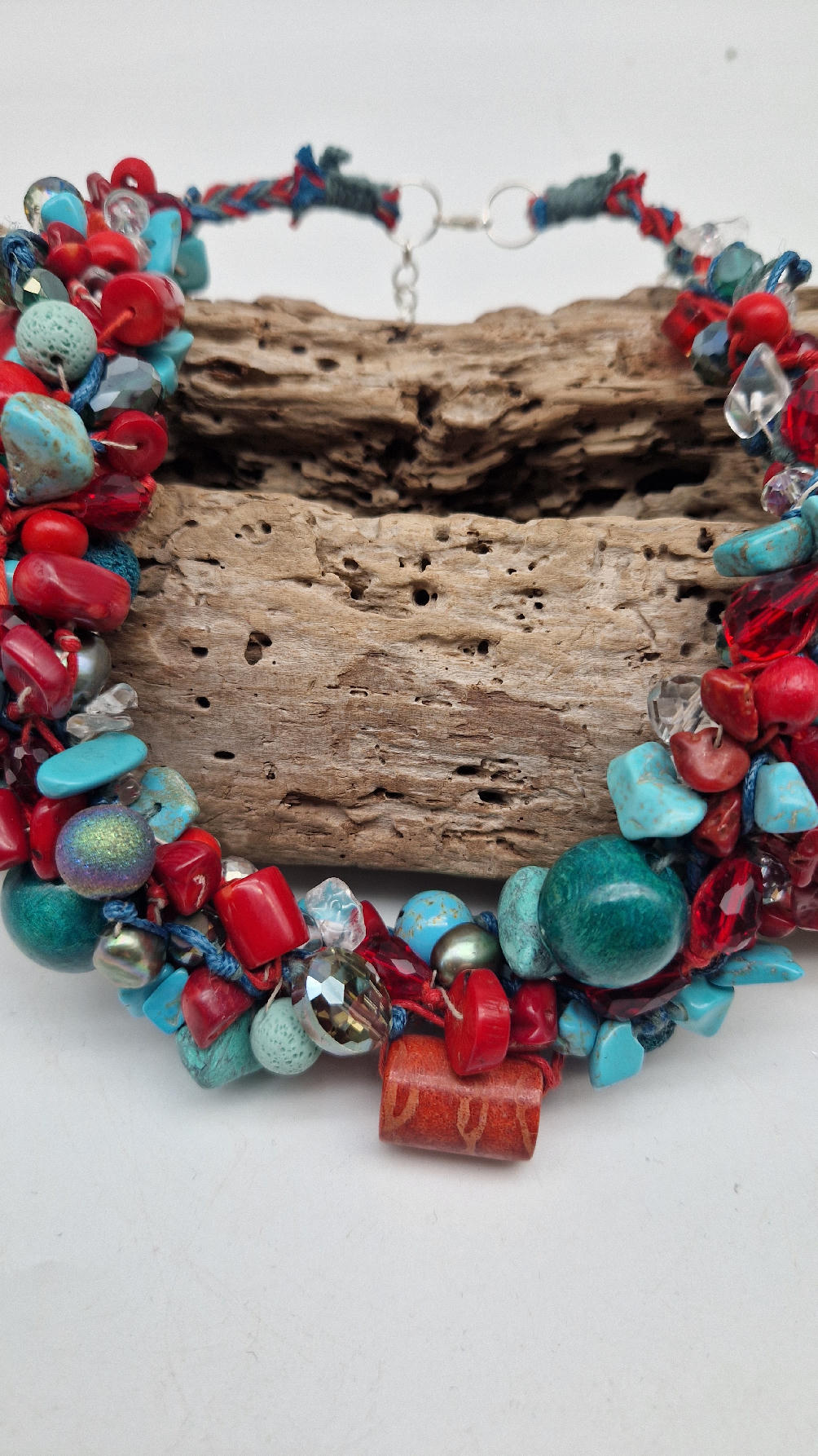 Zwariowany, mega-kolorowy naszyjnik zrobiony z czerwonych korali o różnych kształtach, z turkusów, turkmenitów, poplątanych artystycznie z bawełnianym sznurkiem i gdzieniegdzie szklanymi koralikami, żeby było ciut blasku …taka czysta radość i energia