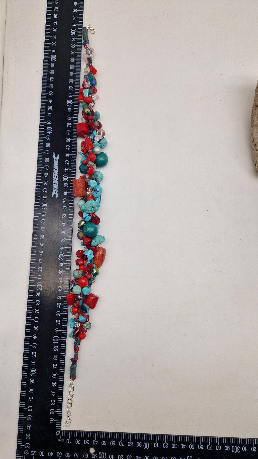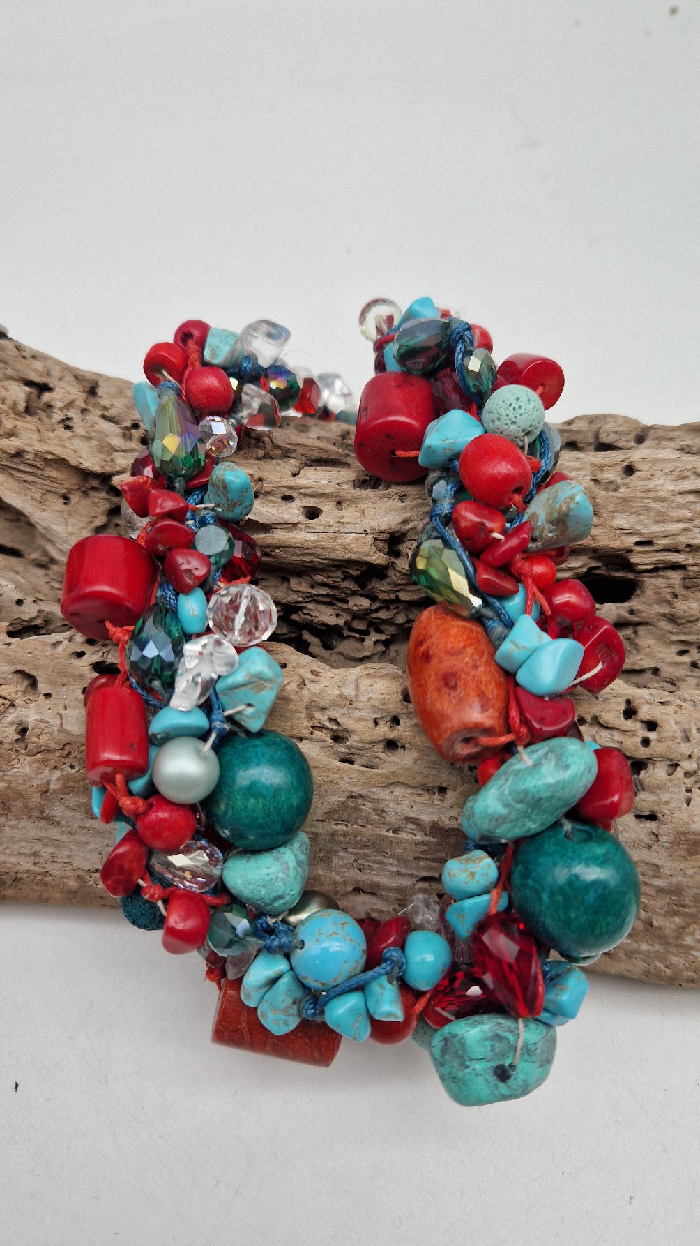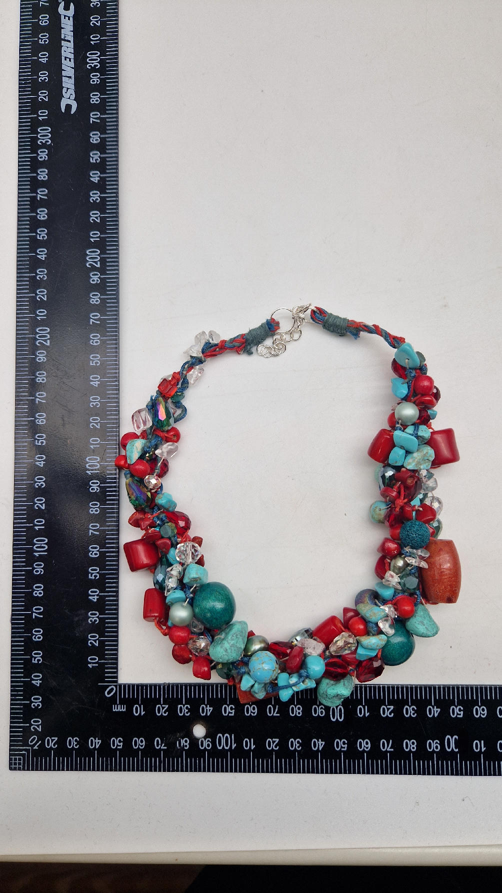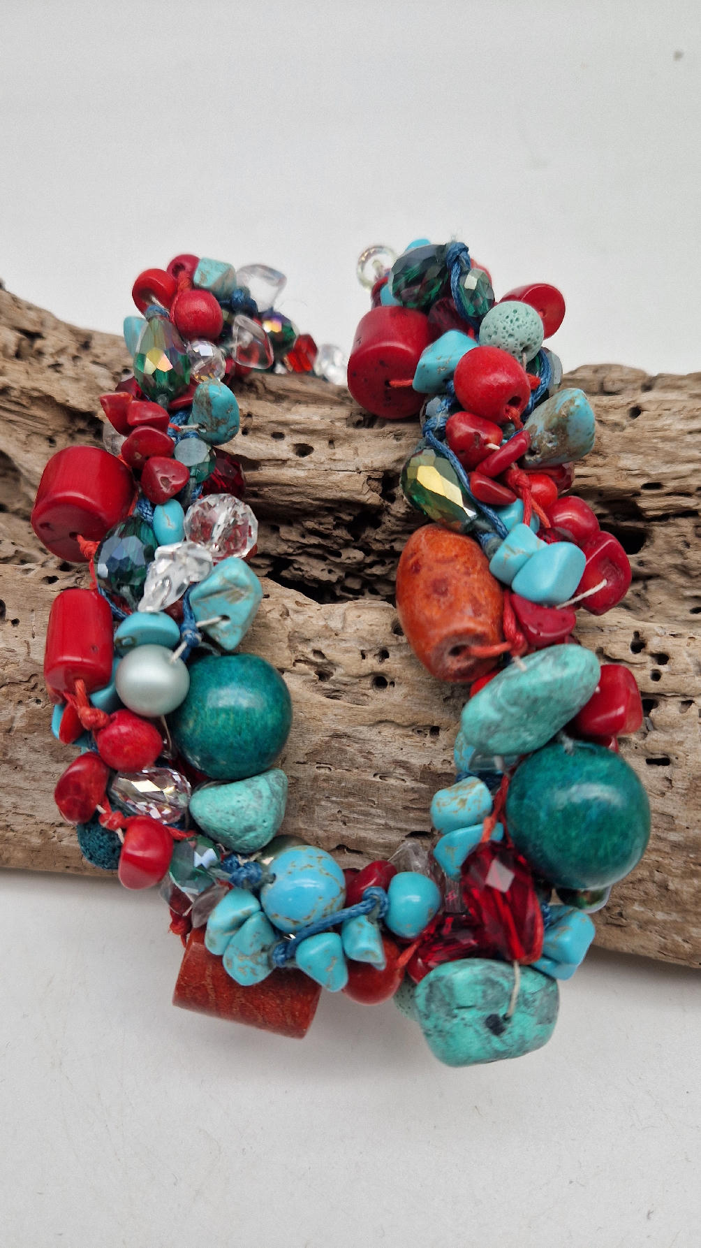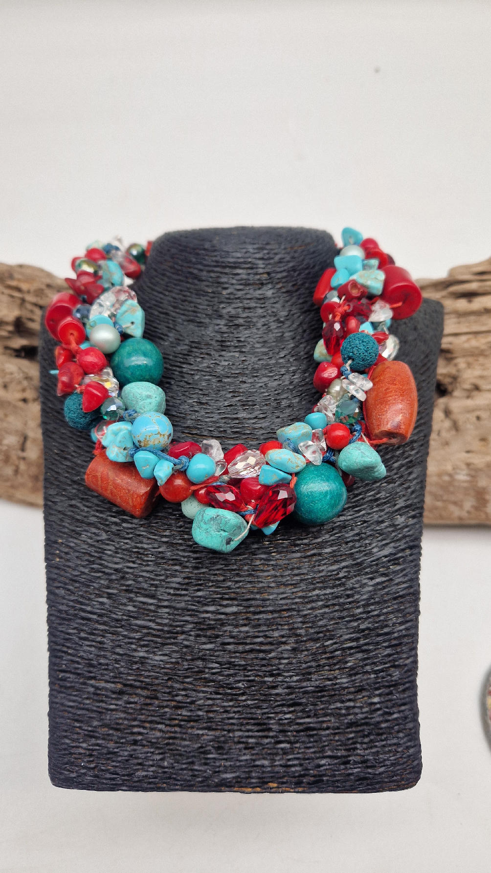 Zwariowany, mega-kolorowy naszyjnik zrobiony z czerwonych korali o różnych kształtach, z turkusów, turkmenitów, poplątanych artystycznie z bawełnianym sznurkiem i gdzieniegdzie szklanymi koralikami, żeby było ciut blasku …taka czysta radość i energia