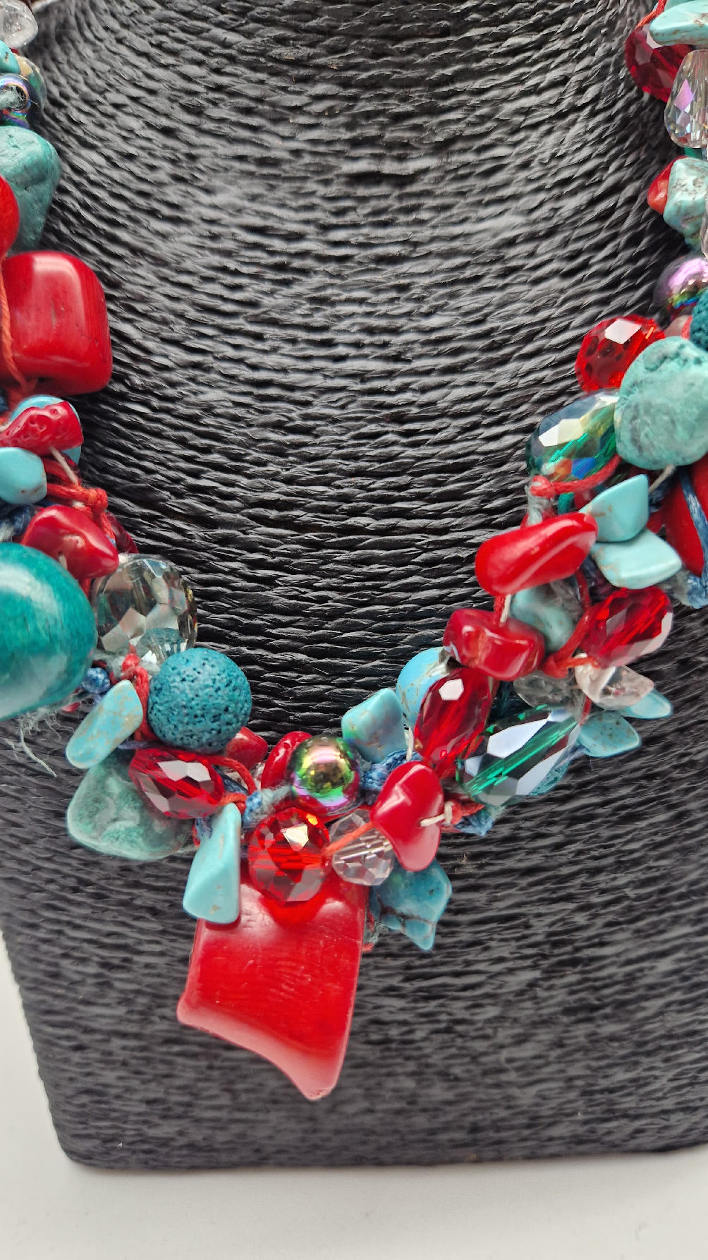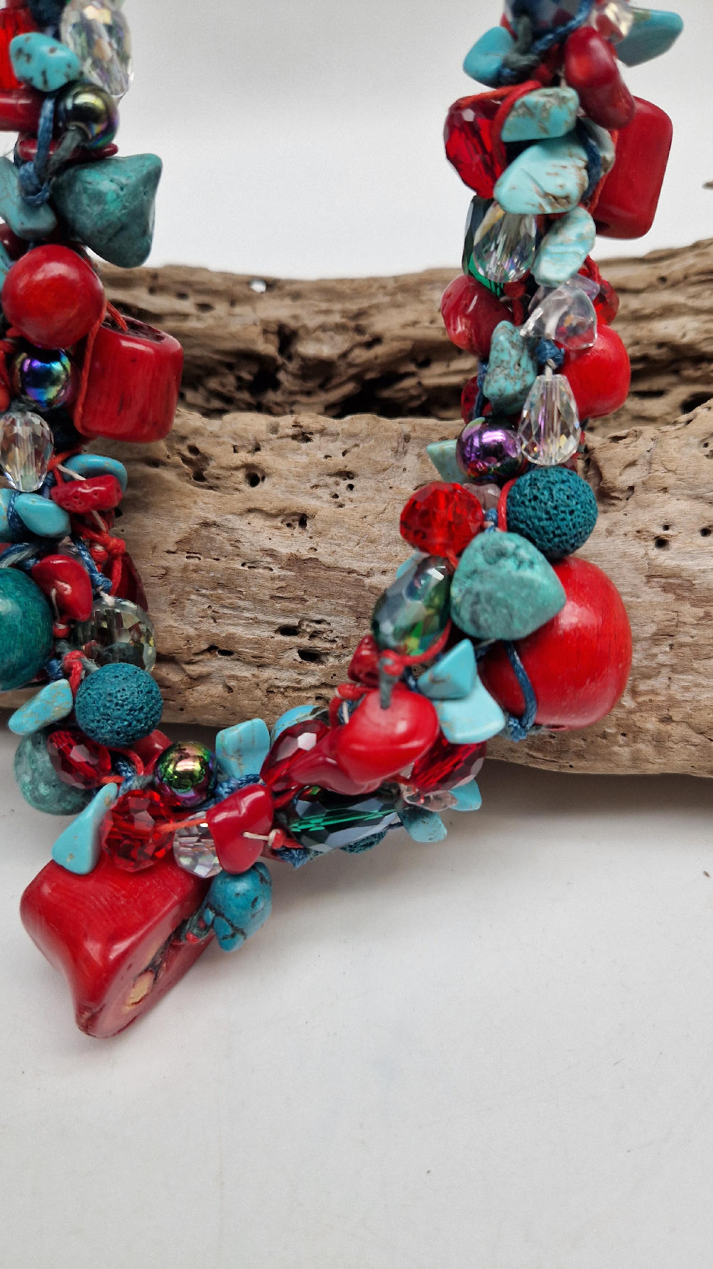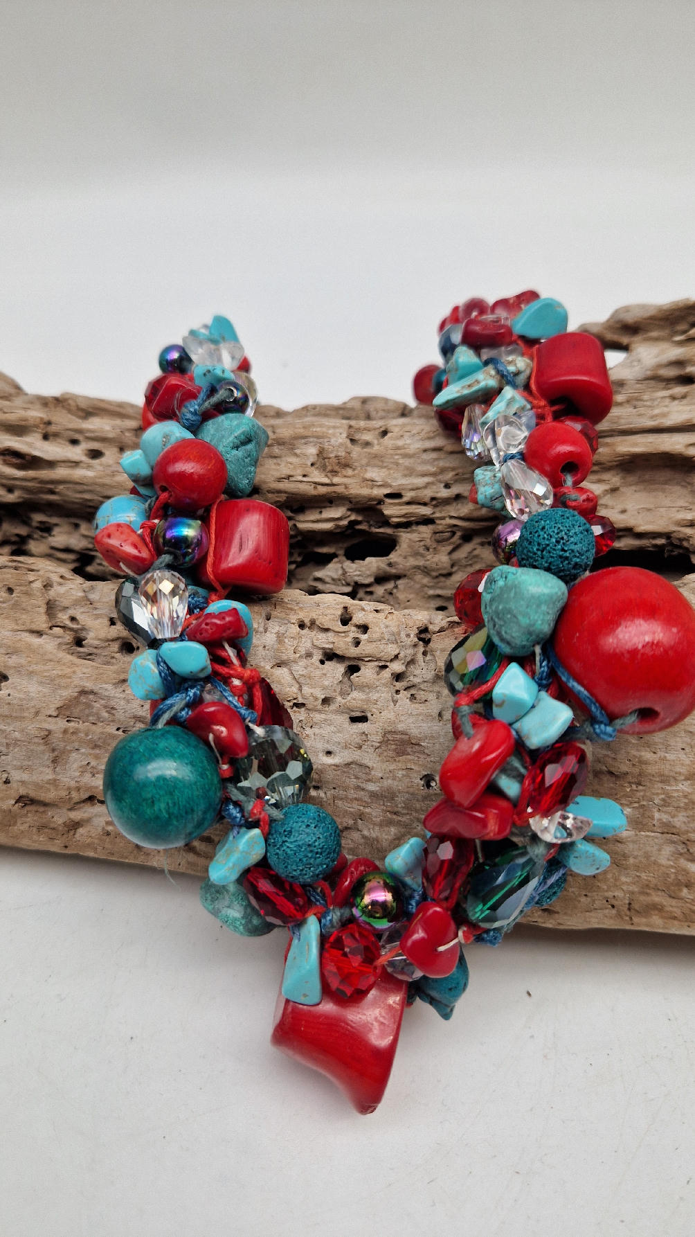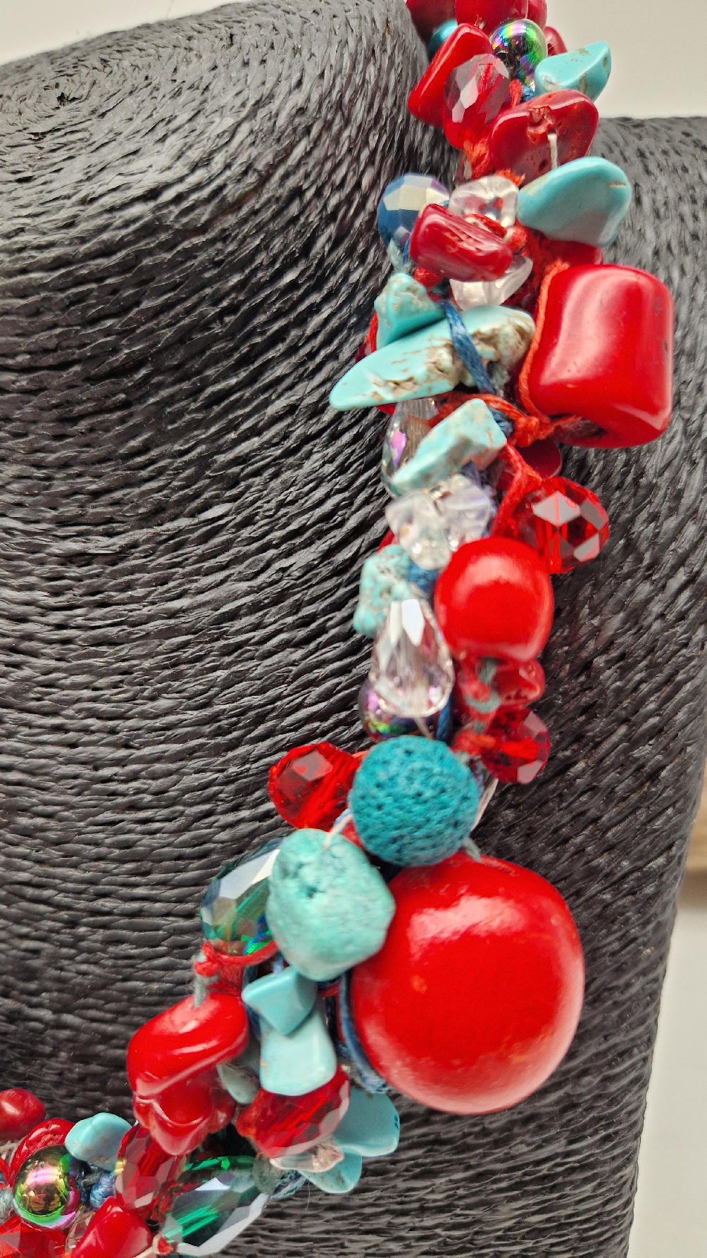 Zwariowany, mega-kolorowy naszyjnik zrobiony z czerwonych korali o różnych kształtach, z turkusów, turkmenitów, poplątanych artystycznie z bawełnianym sznurkiem i gdzieniegdzie szklanymi koralikami, żeby było ciut blasku …taka czysta radość i energia