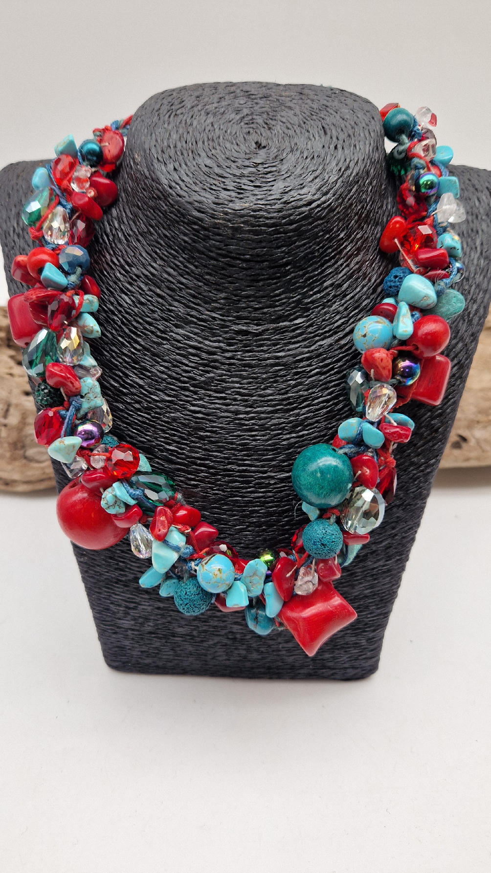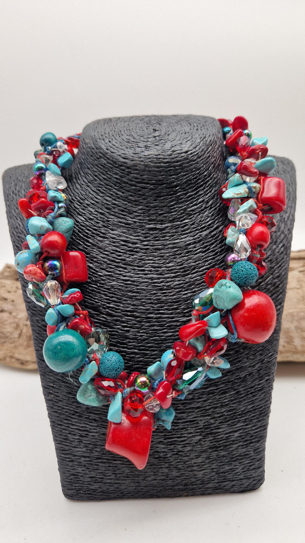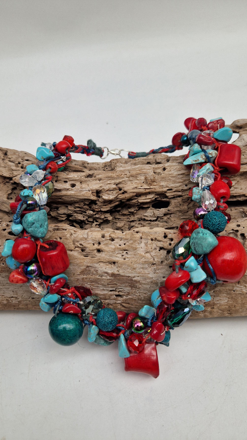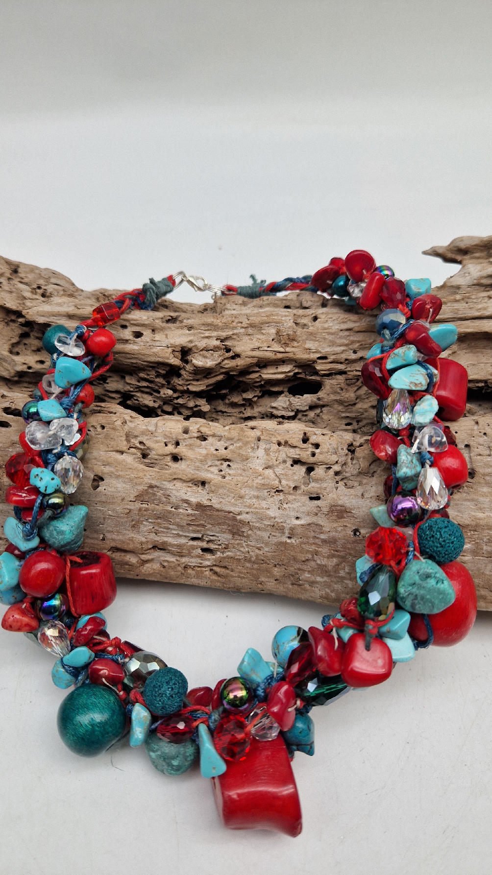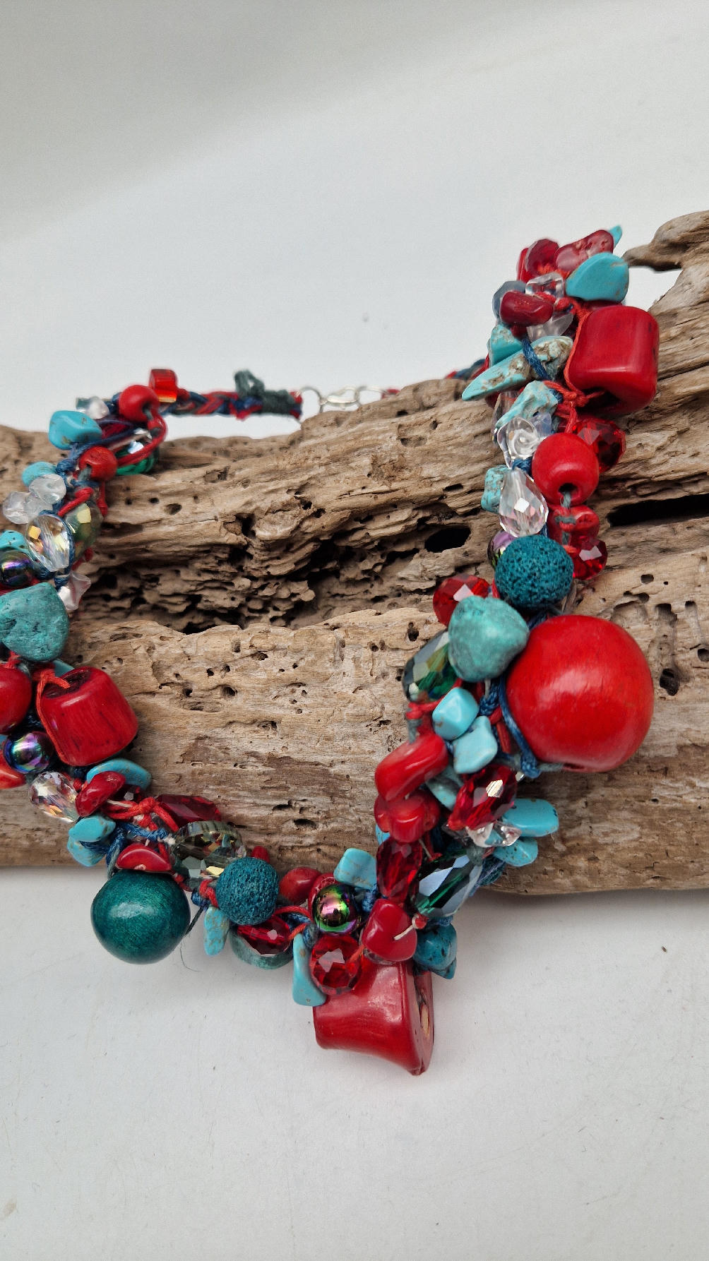 Zwariowany, mega-kolorowy naszyjnik zrobiony z czerwonych korali o różnych kształtach, z turkusów, turkmenitów, poplątanych artystycznie z bawełnianym sznurkiem i gdzieniegdzie szklanymi koralikami, żeby było ciut blasku …taka czysta radość i energia