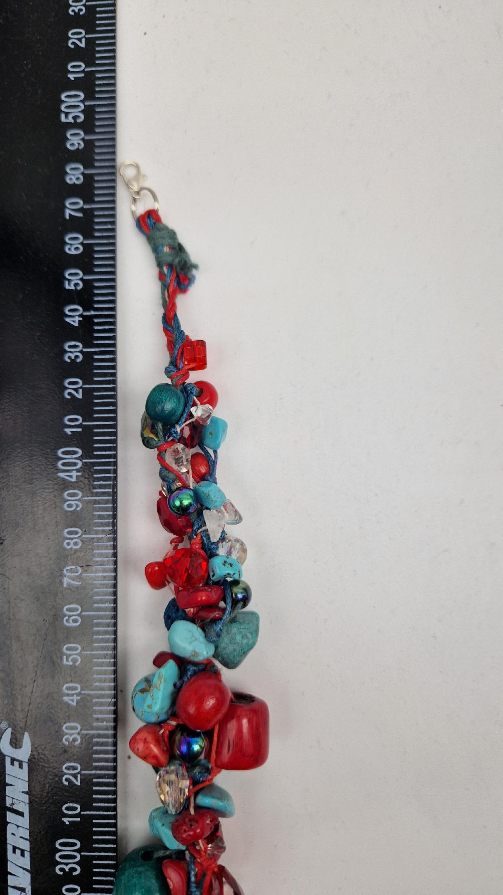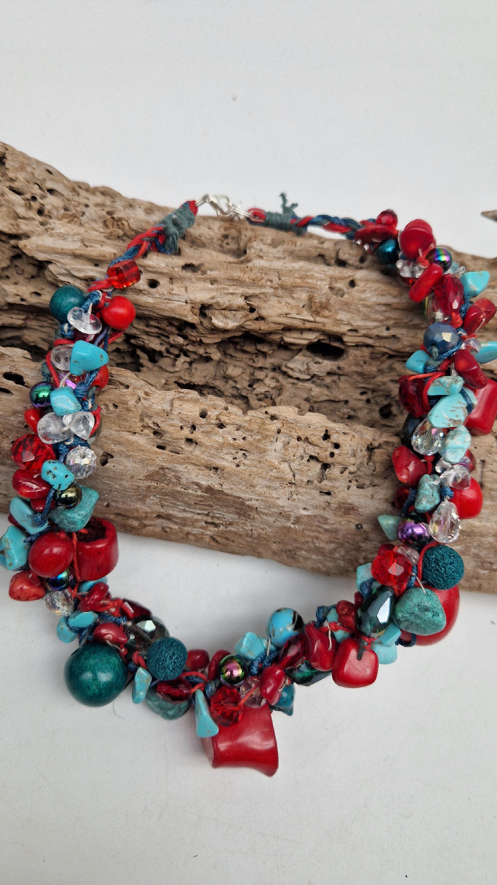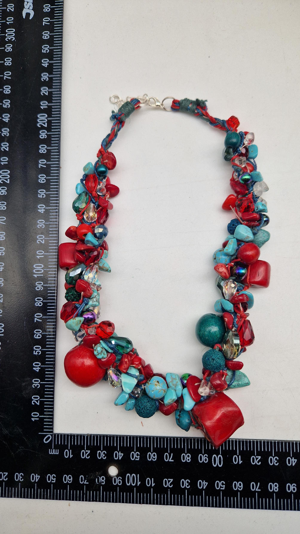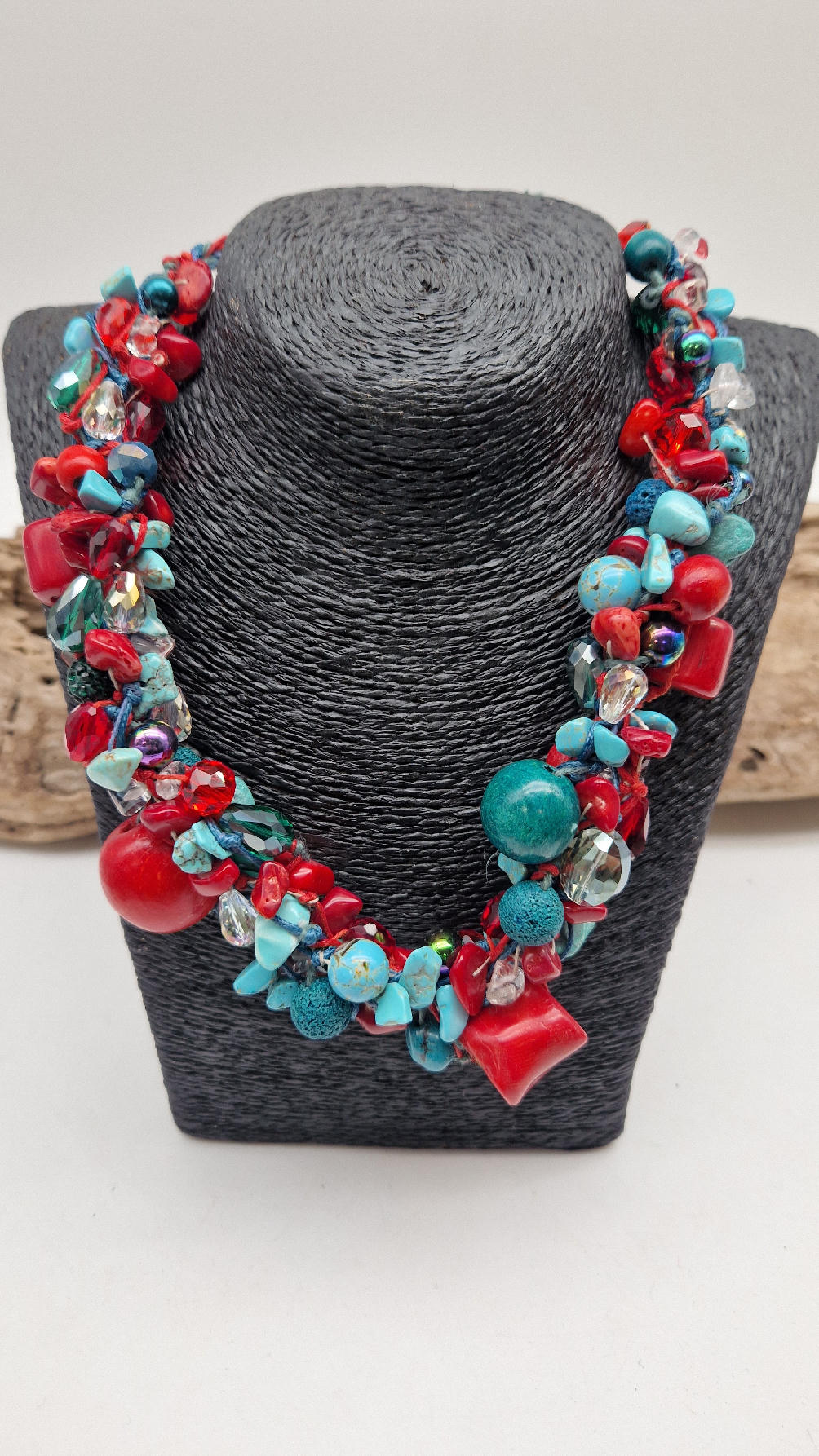 Zwariowany, mega-kolorowy naszyjnik zrobiony z czerwonych korali o różnych kształtach, z turkusów, turkmenitów, poplątanych artystycznie z bawełnianym sznurkiem i gdzieniegdzie szklanymi koralikami, żeby było ciut blasku …taka czysta radość i energia