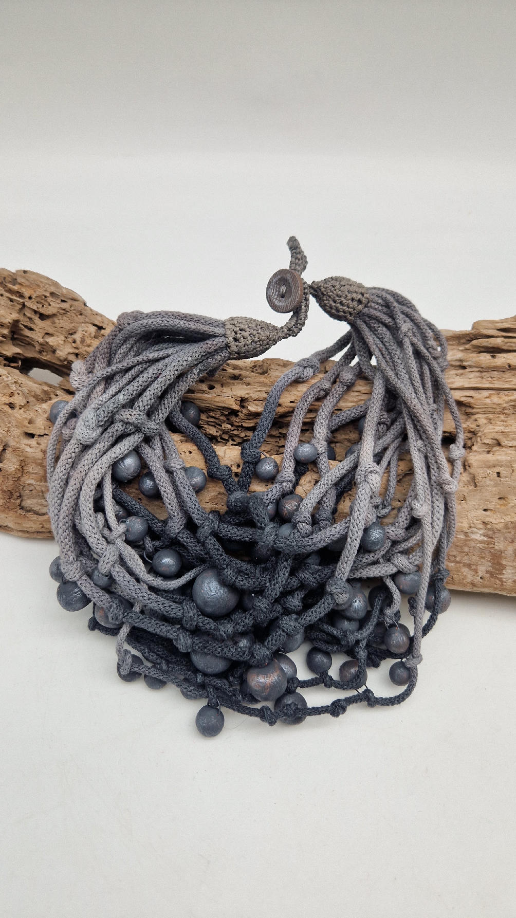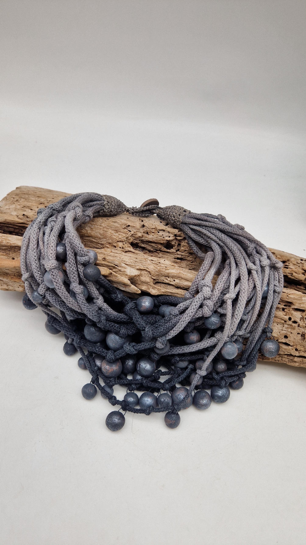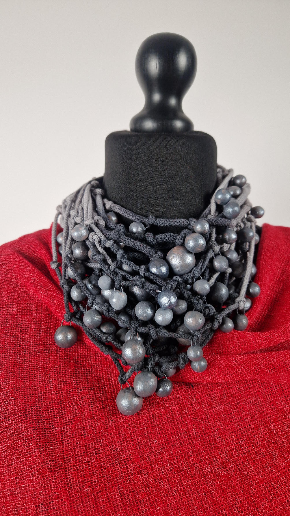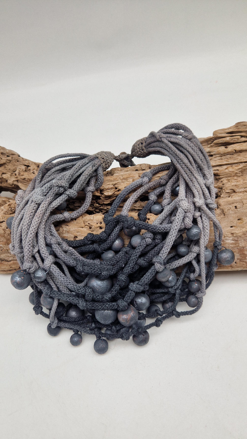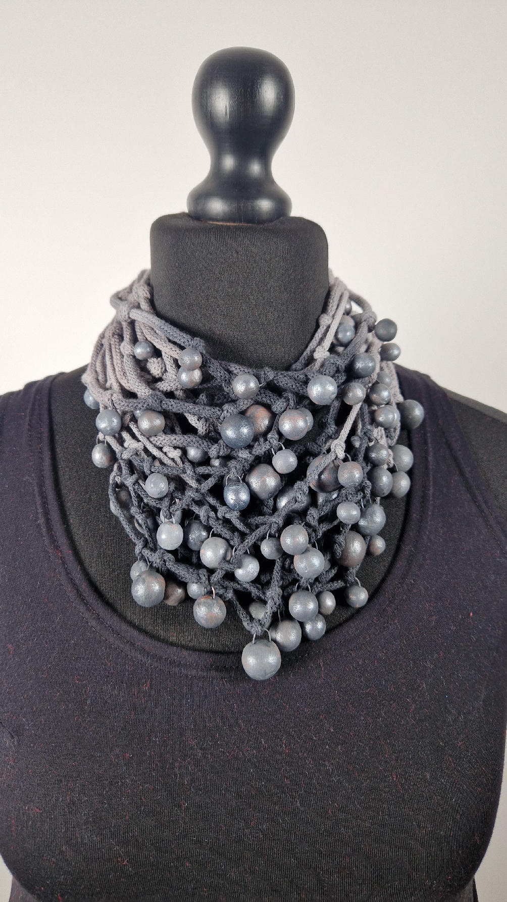 Naszyjnik wykonany z bawełnianych, ręcznie farbowanych sznurków , w odcieniach szarości i grafitu …, do których zostały przymocowane zabarwione na grafitowo okrągłe, różnej wielkości śliczne kulki. Naszyjnik jest lekki i świetnie pasuje nie tylko do czarnych kiecek…do tego naszyjnika pasują kolczyki w kolorze srebrnym, lub srebrno-czarne.