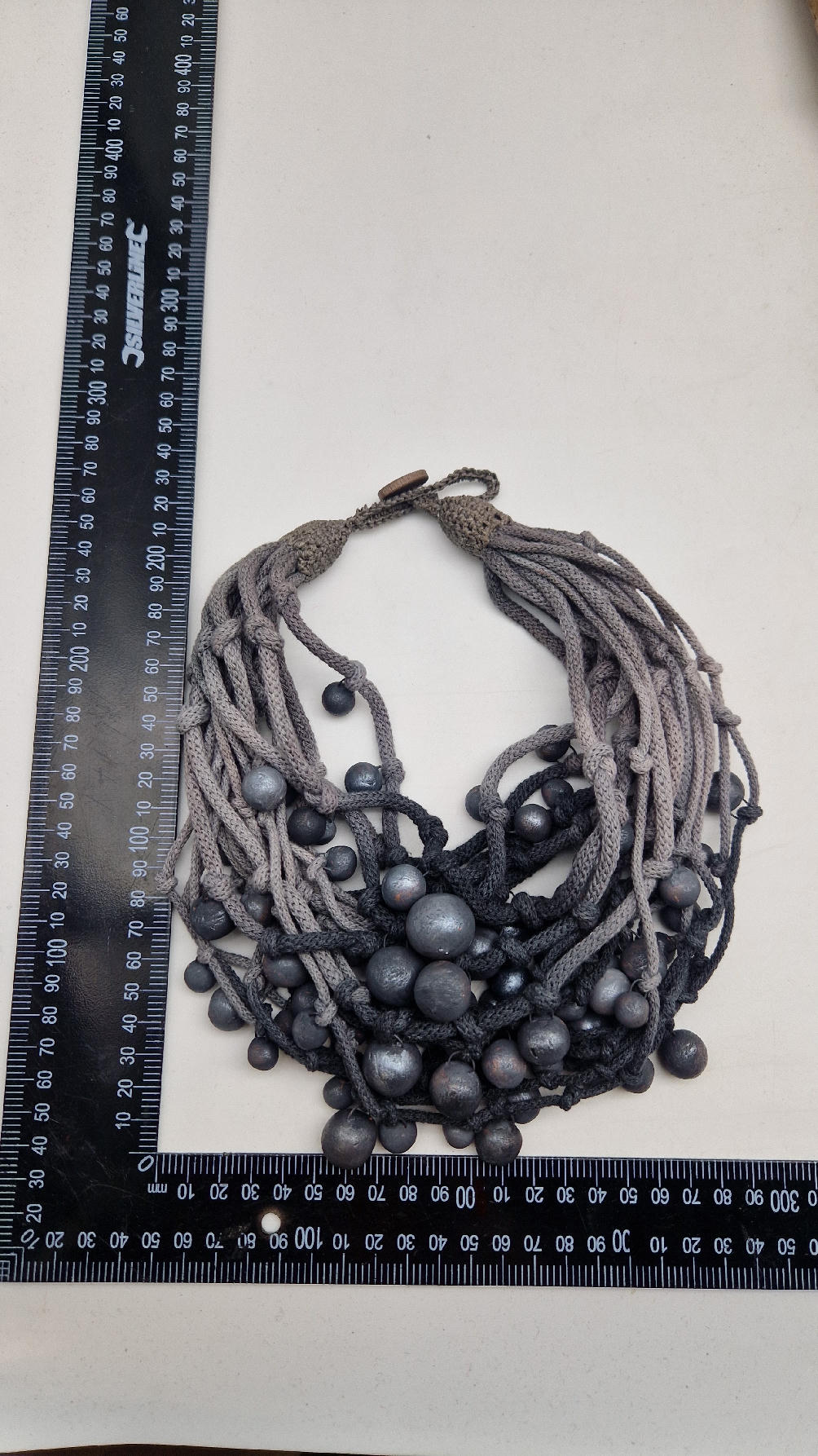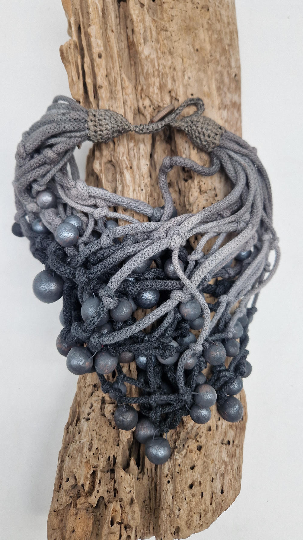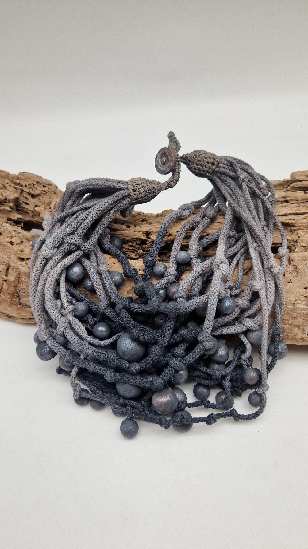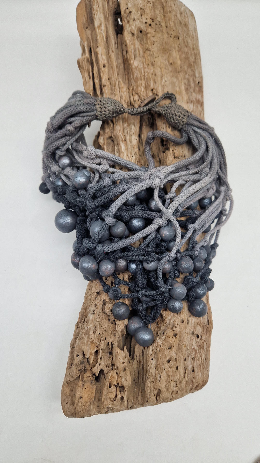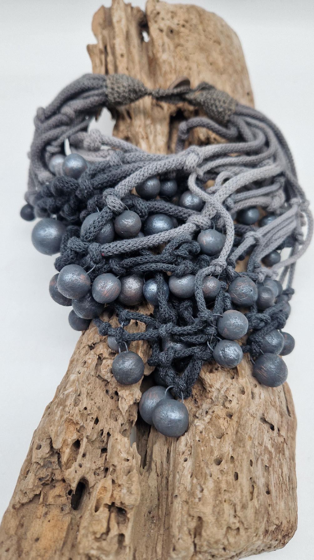 Naszyjnik wykonany z bawełnianych, ręcznie farbowanych sznurków , w odcieniach szarości i grafitu …, do których zostały przymocowane zabarwione na grafitowo okrągłe, różnej wielkości śliczne kulki. Naszyjnik jest lekki i świetnie pasuje nie tylko do czarnych kiecek…do tego naszyjnika pasują kolczyki w kolorze srebrnym, lub srebrno-czarne.