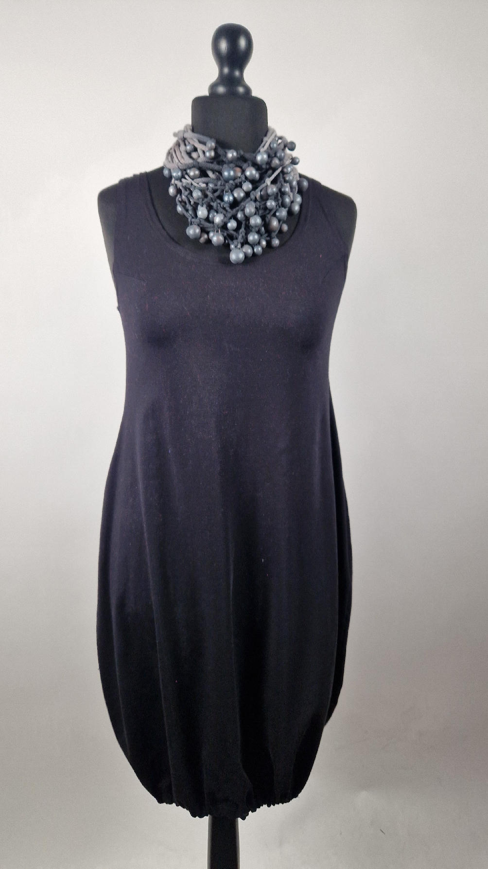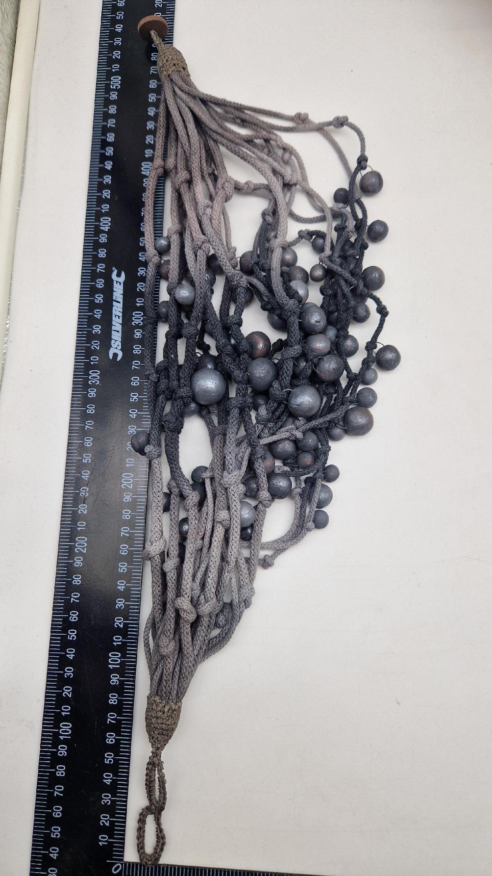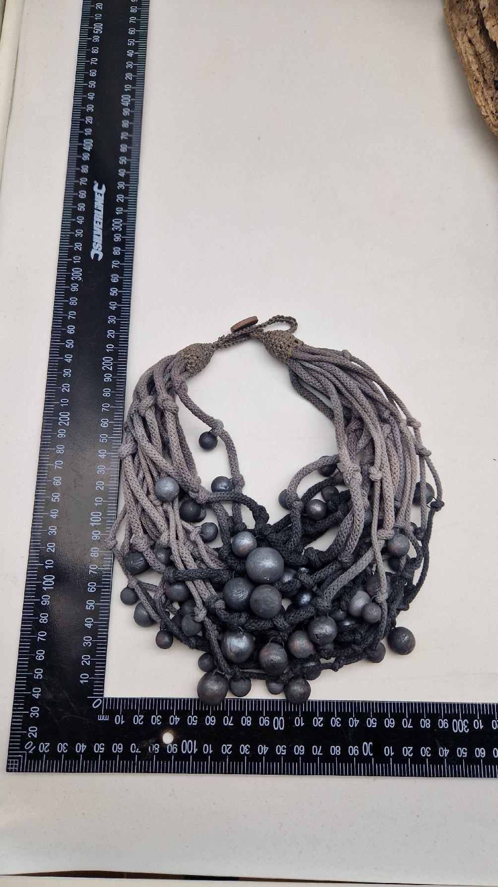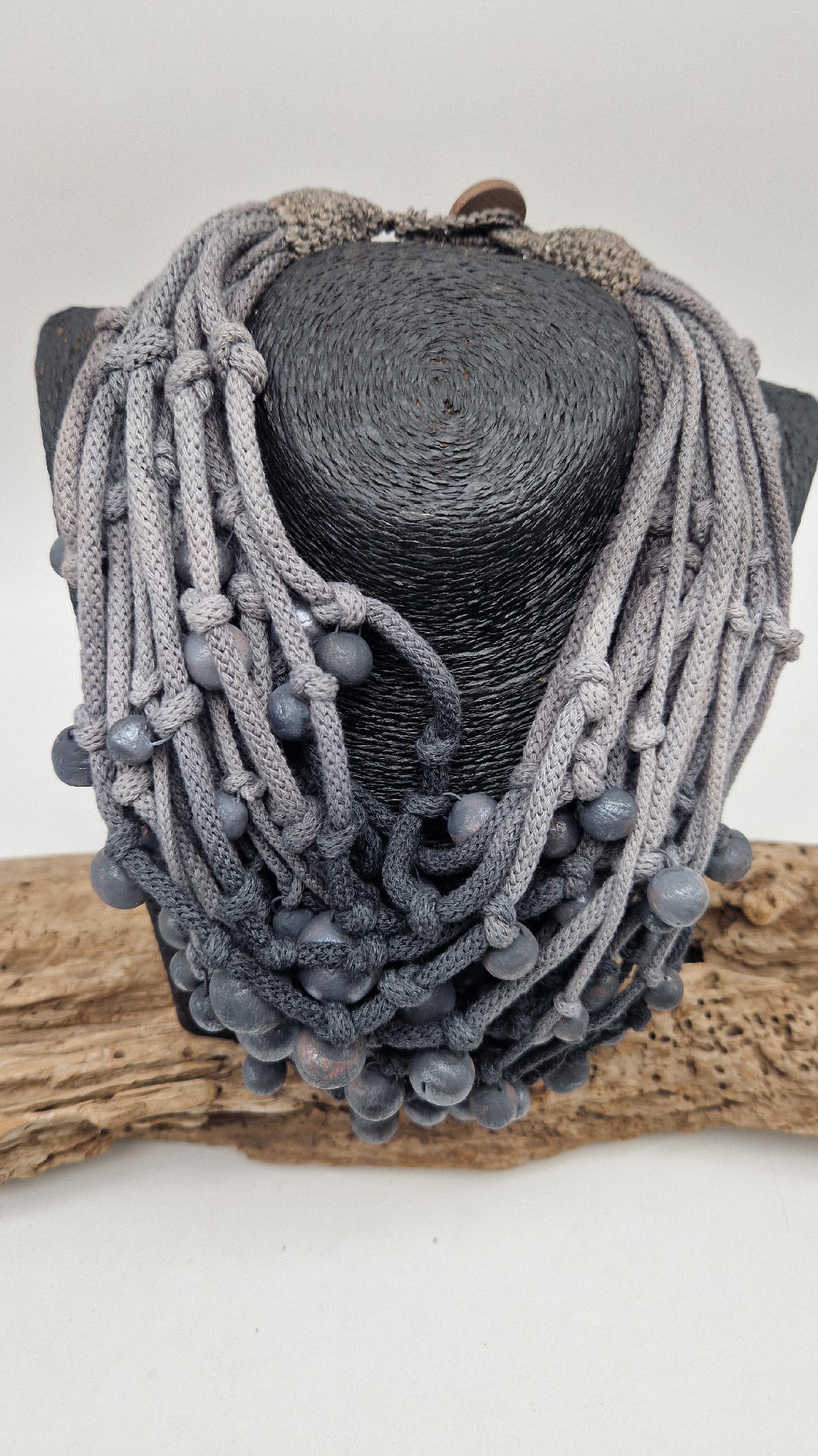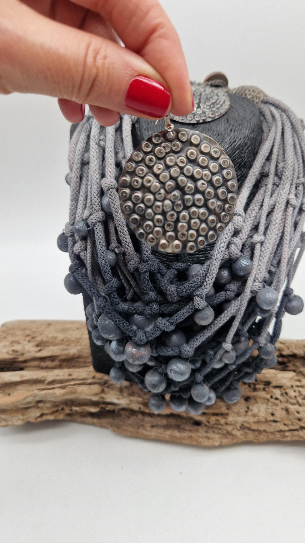 Naszyjnik wykonany z bawełnianych, ręcznie farbowanych sznurków , w odcieniach szarości i grafitu …, do których zostały przymocowane zabarwione na grafitowo okrągłe, różnej wielkości śliczne kulki. Naszyjnik jest lekki i świetnie pasuje nie tylko do czarnych kiecek…do tego naszyjnika pasują kolczyki w kolorze srebrnym, lub srebrno-czarne.