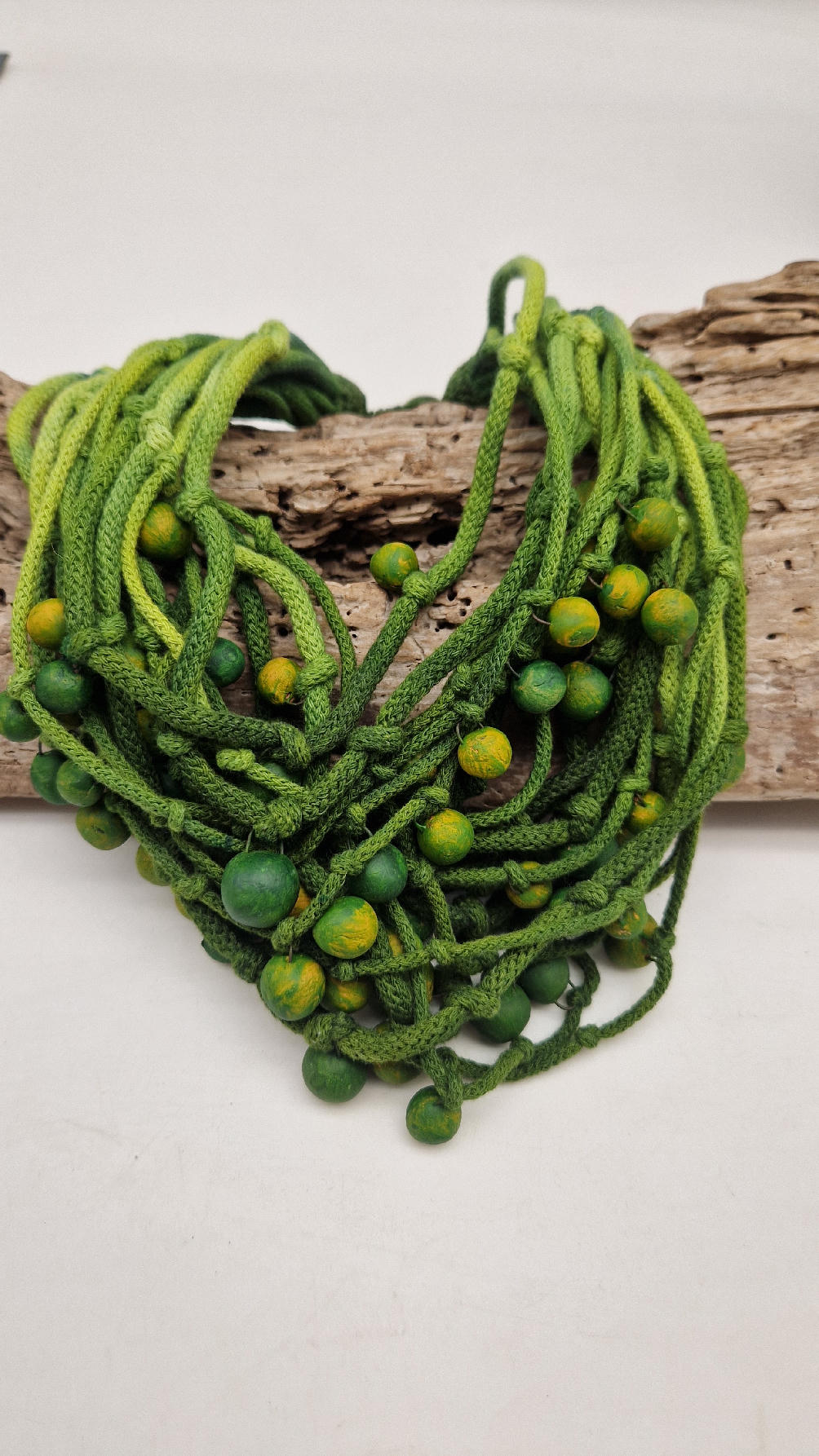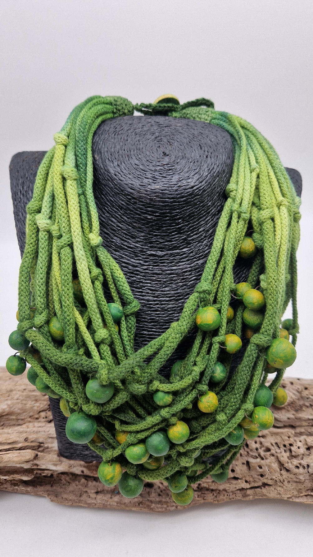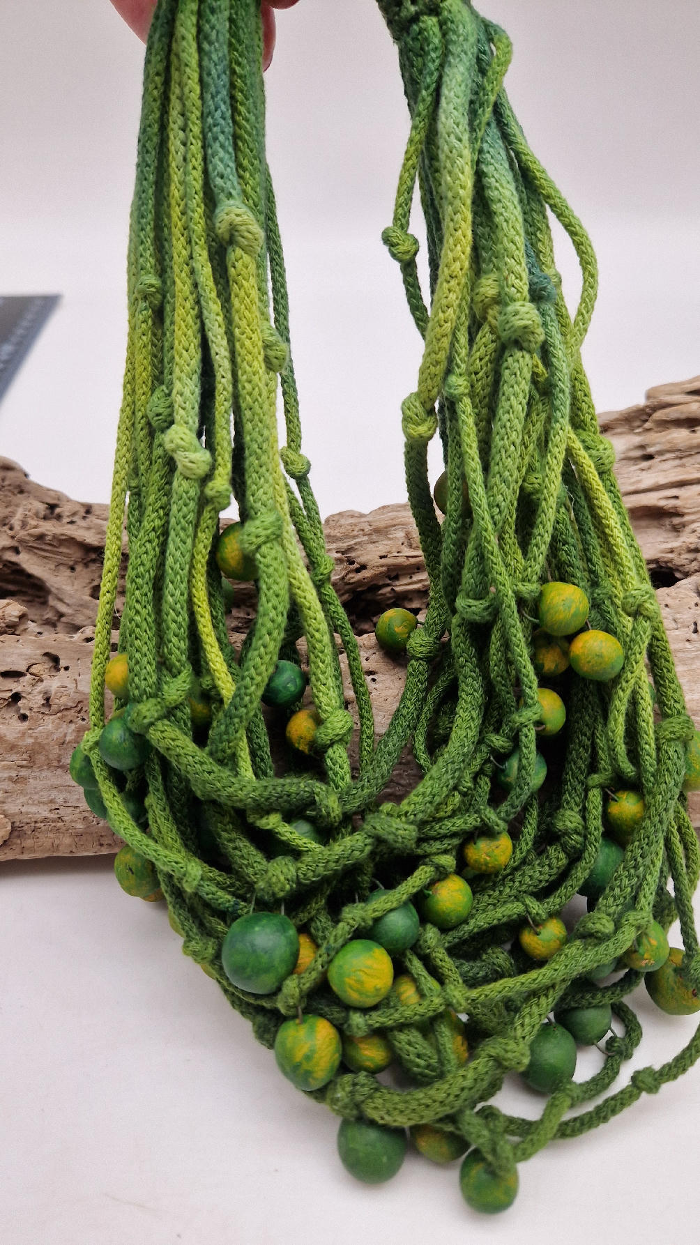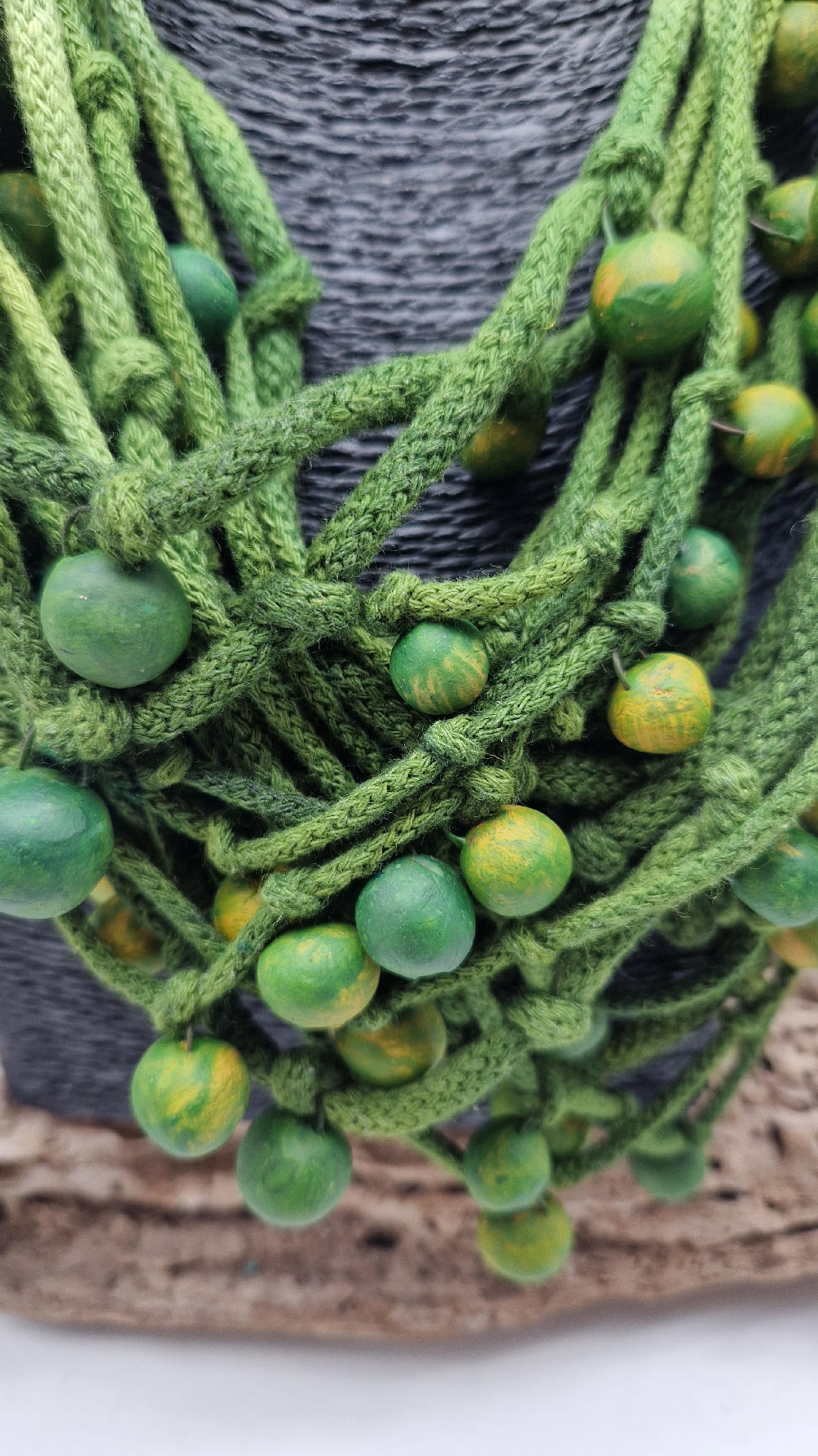 Naszyjnik, wykonany z bawełnianych, ręcznie farbowanych sznurków , w odcieniach soczystej zieleni , młodych liści, z cytrynami, letniego drzewa…, do których zostały przymocowane dziesiątki uformowanych ręcznie, wypalonych i zabarwionych niemal magicznie koralików.