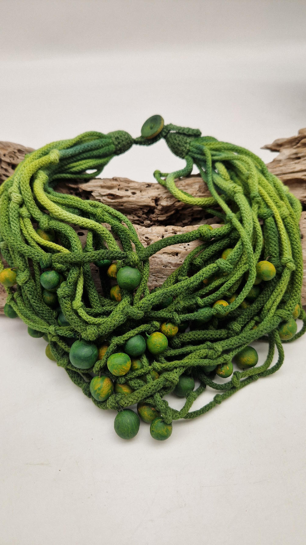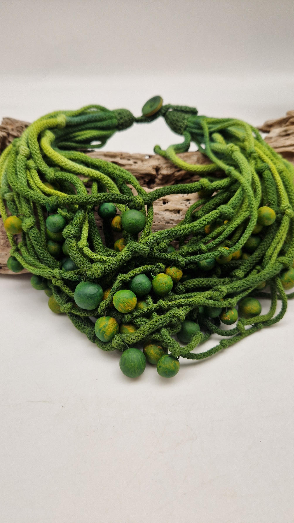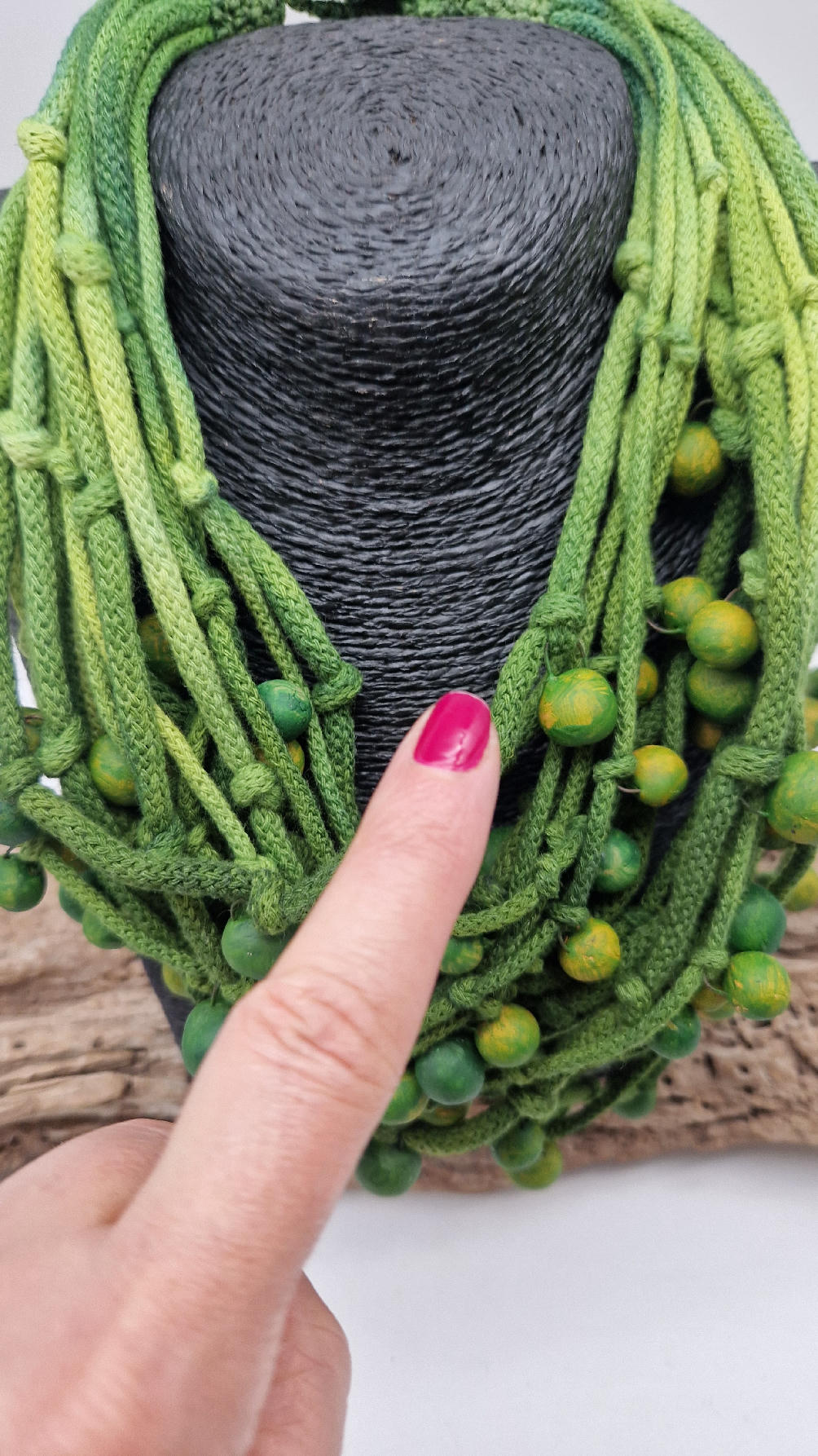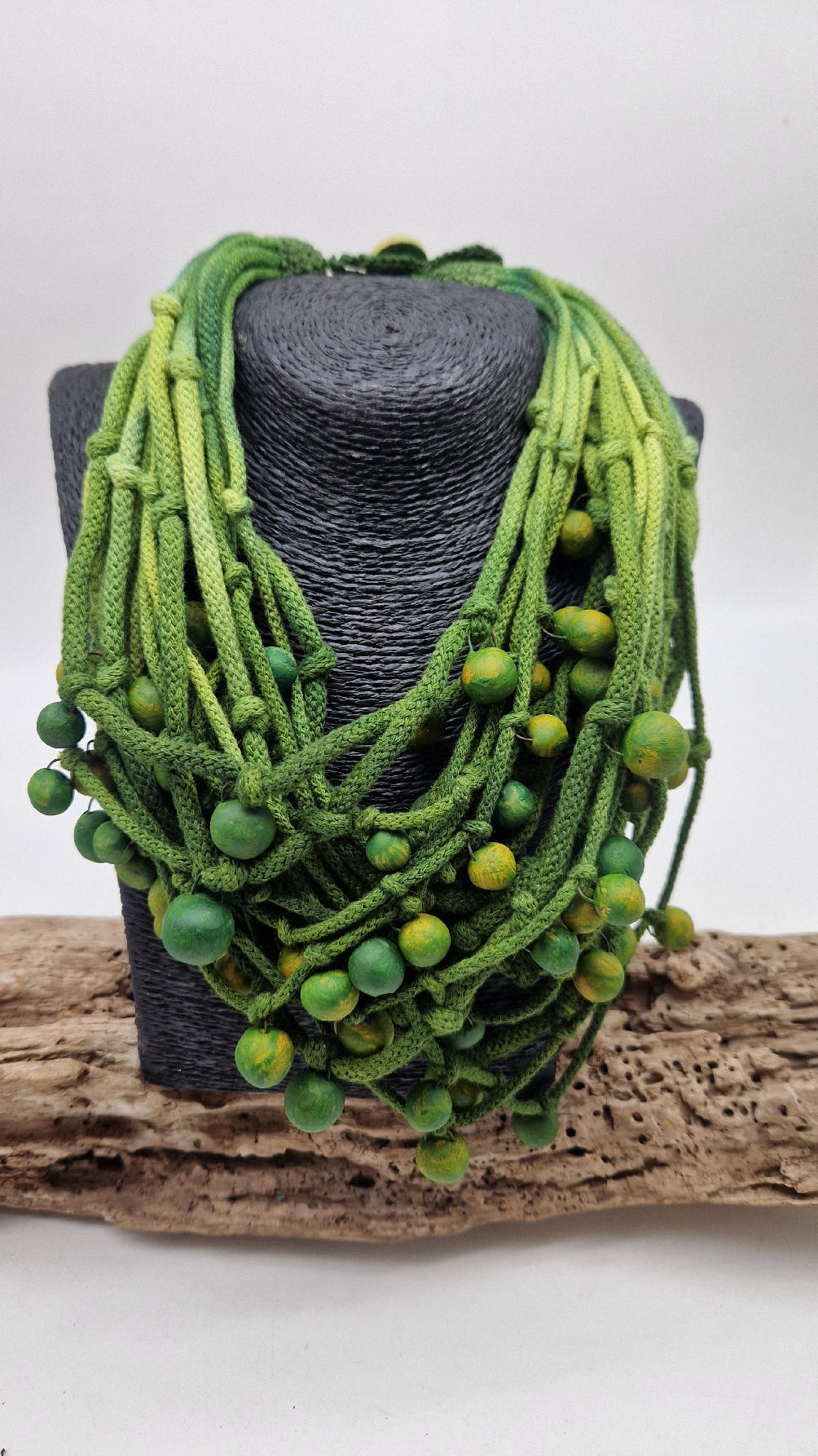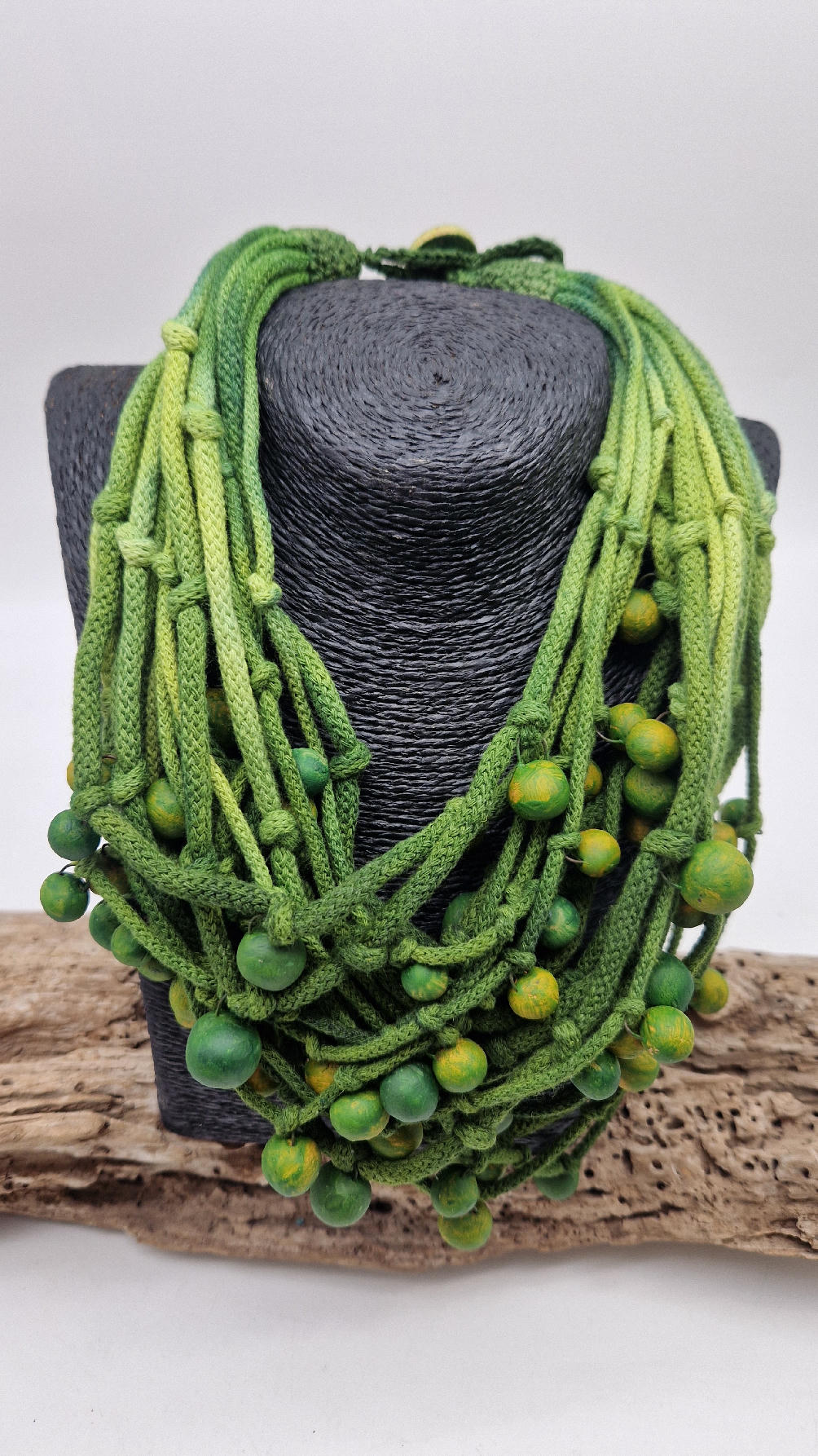 Naszyjnik, wykonany z bawełnianych, ręcznie farbowanych sznurków , w odcieniach soczystej zieleni , młodych liści, z cytrynami, letniego drzewa…, do których zostały przymocowane dziesiątki uformowanych ręcznie, wypalonych i zabarwionych niemal magicznie koralików.